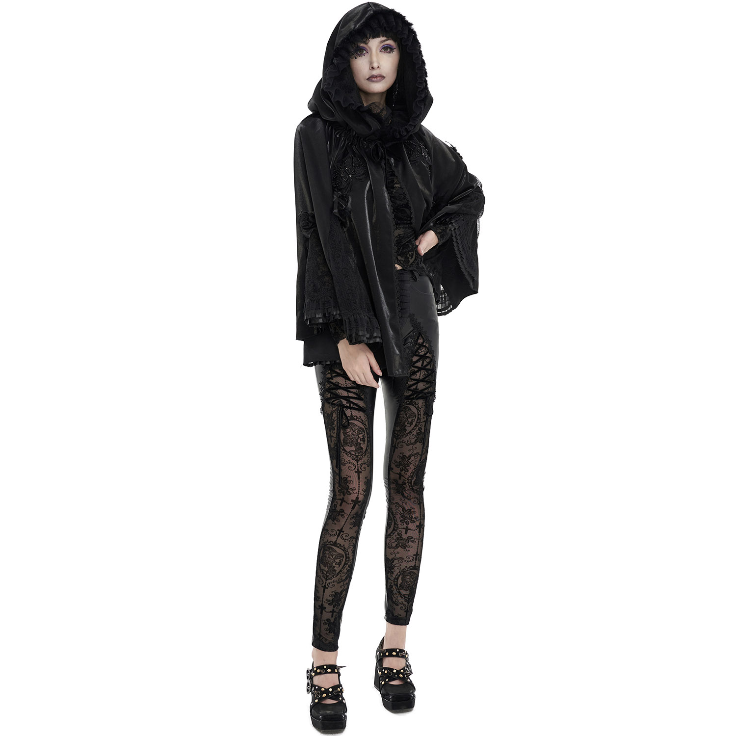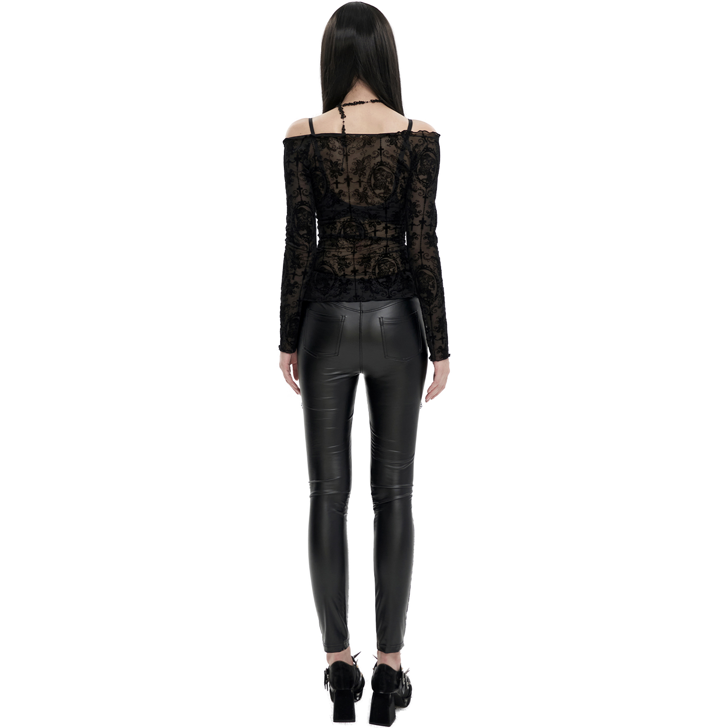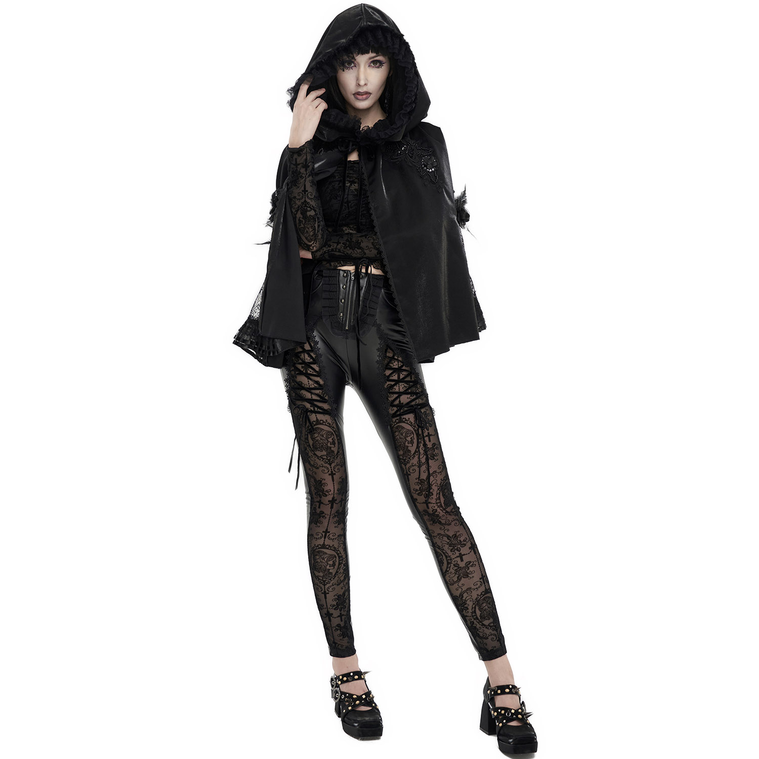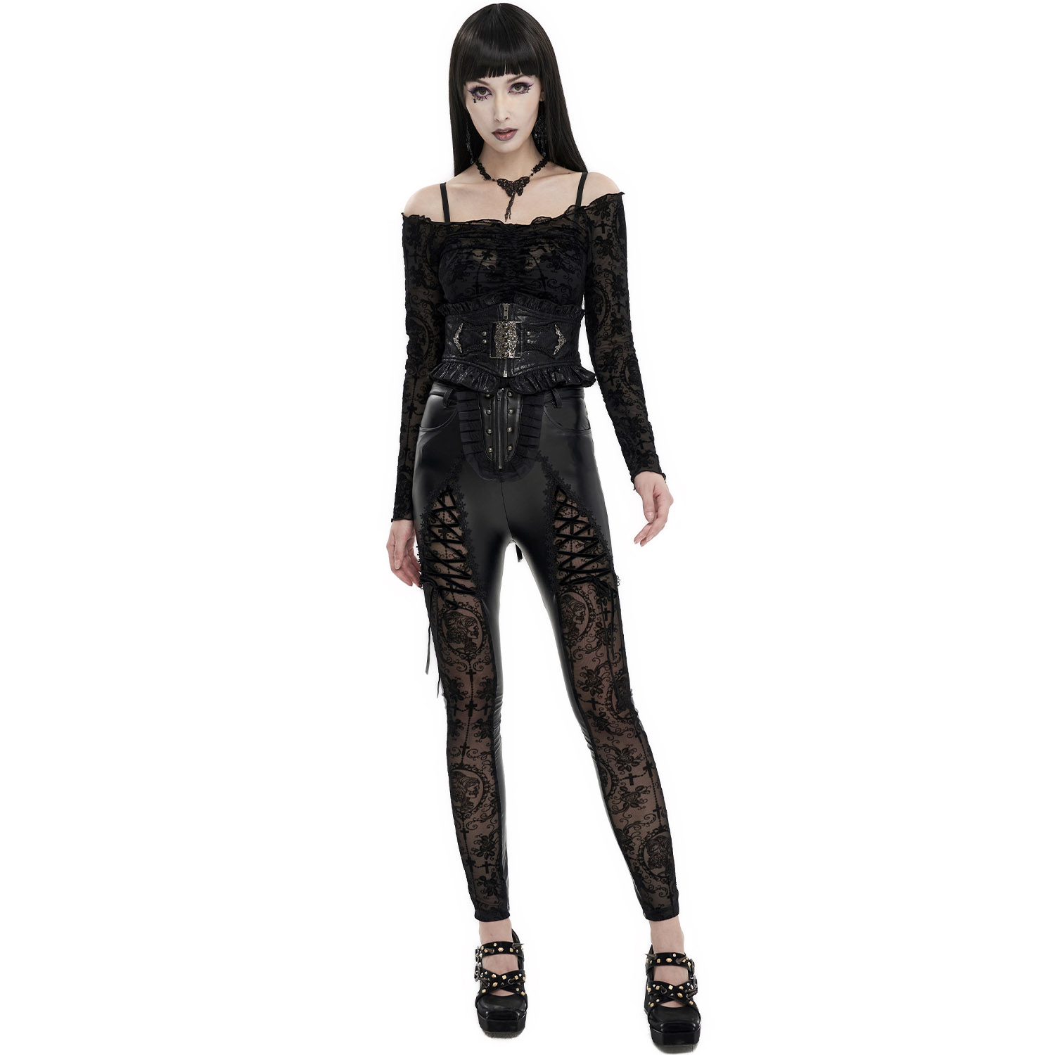 • In mesh and stretchy faux leather • Gothic cameo pattern print, roses and crosses on the front of the thighs • Lacing on the front of the thighs • Front zipper • Metal studs on faux leather on...
