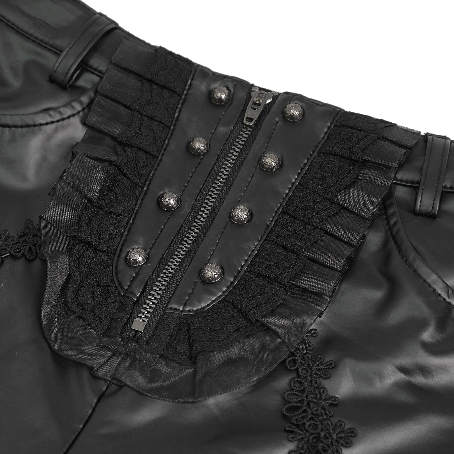 Gothic & Visual Kei style slim fit low waist trousers with the removable half-skirt top. • Synthetic leather details with D-rings and studded rivets on legs and waist • Lacing decorations on...