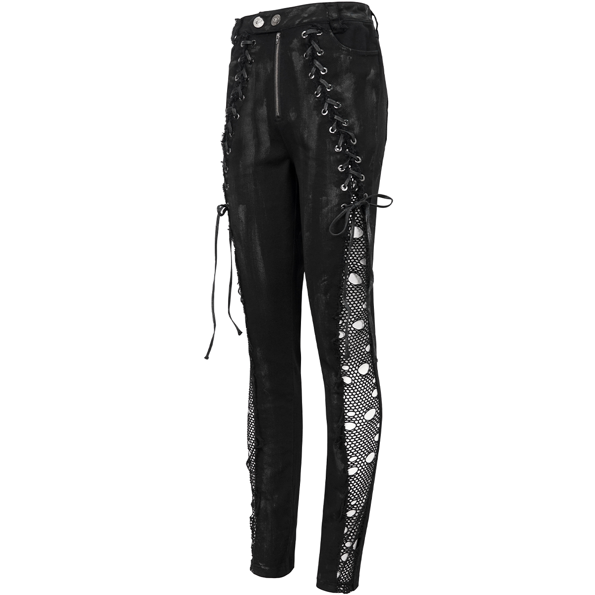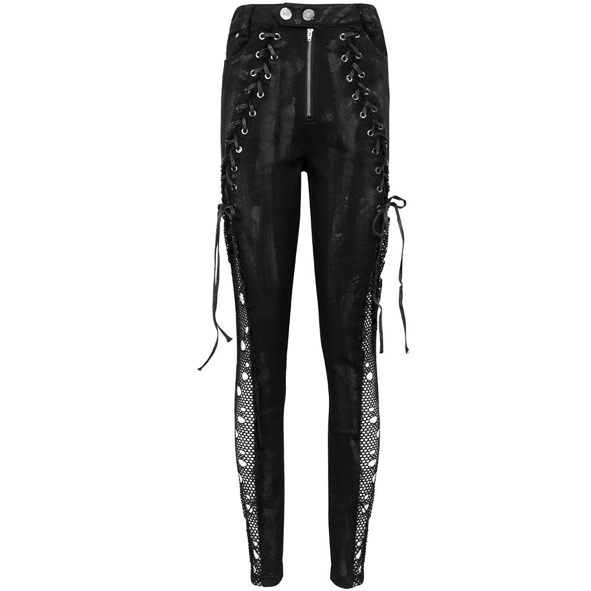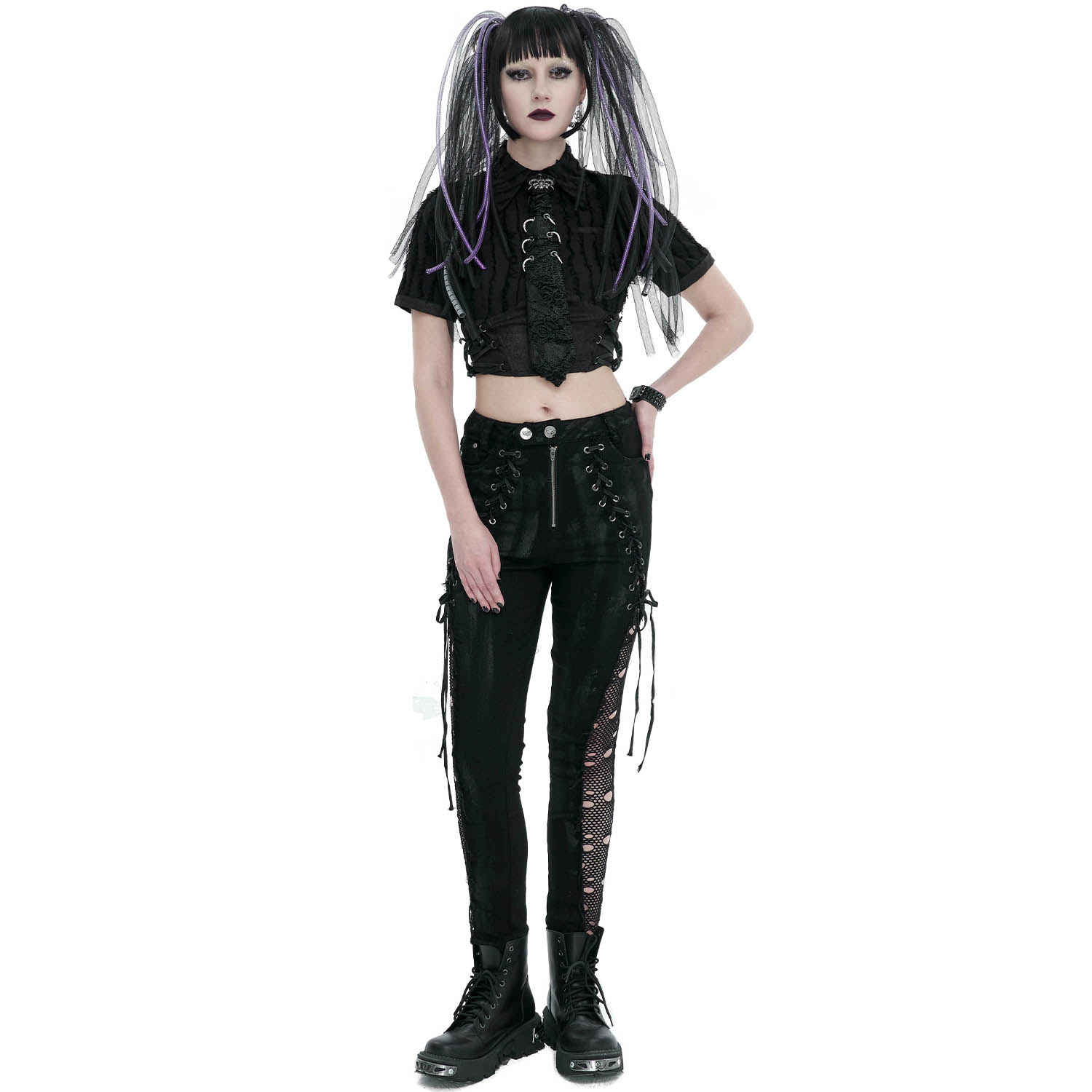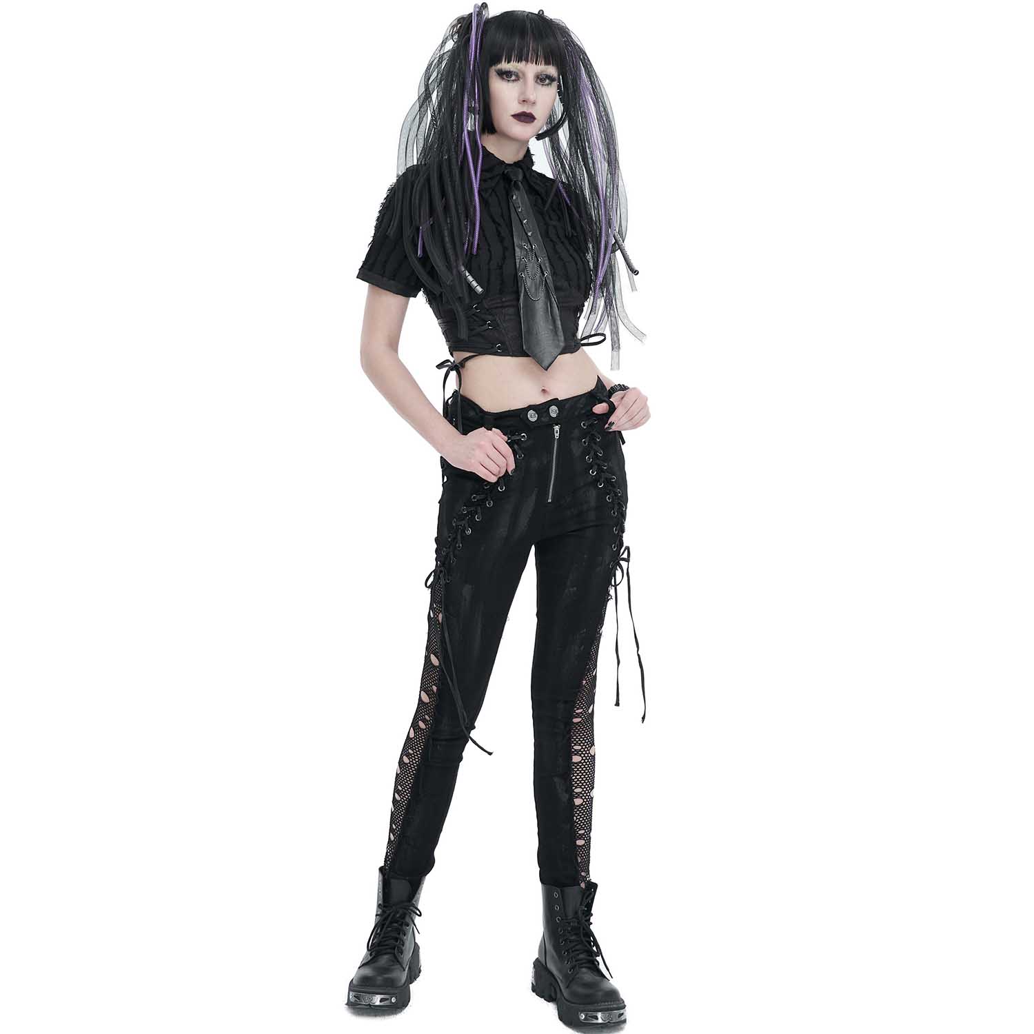 Gothic women's black vinyl slim fit trousers with cut-out laced calves and lacing at the front of the thighs. • Slim fit design • Made of mixed cotton and synthetic vegan leather knitted fabric...