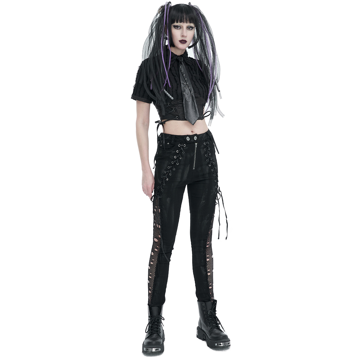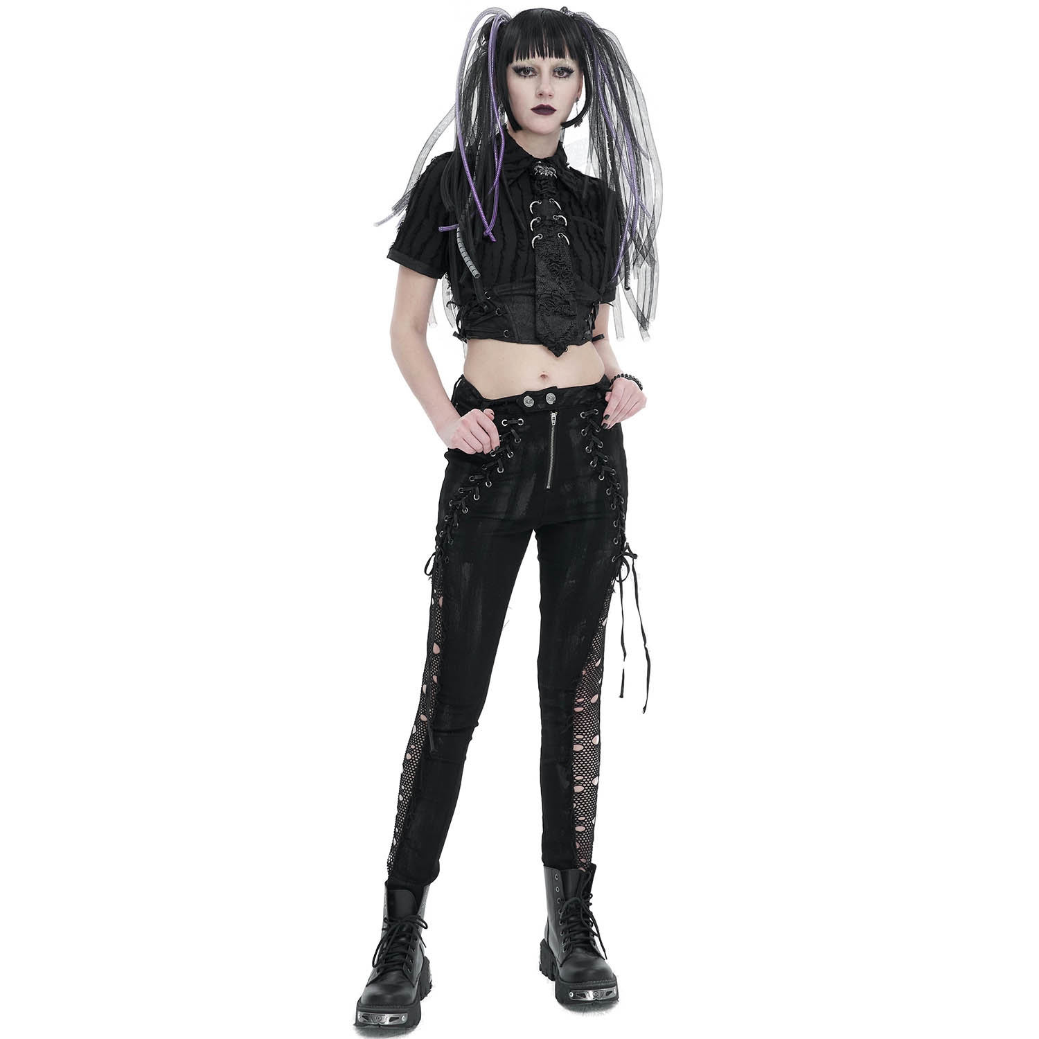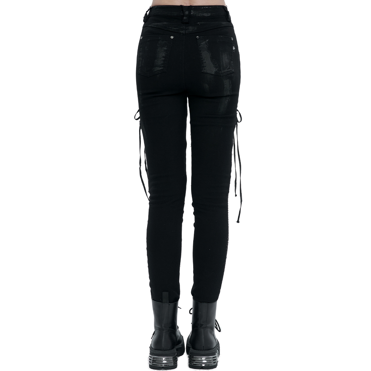 Gothic women's black vinyl slim fit trousers with cut-out laced calves and lacing at the front of the thighs. • Slim fit design • Made of mixed cotton and synthetic vegan leather knitted fabric...
