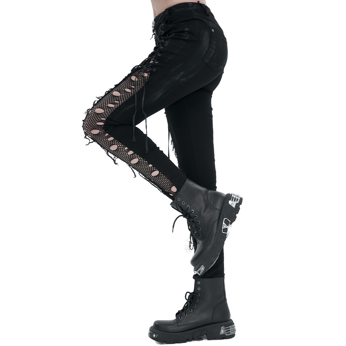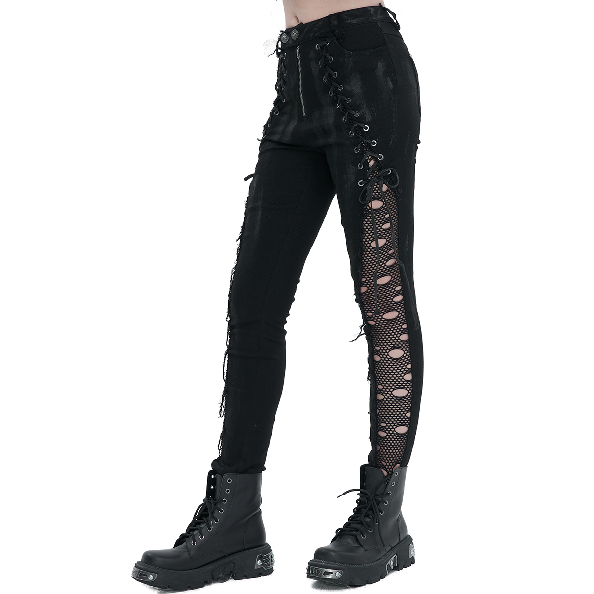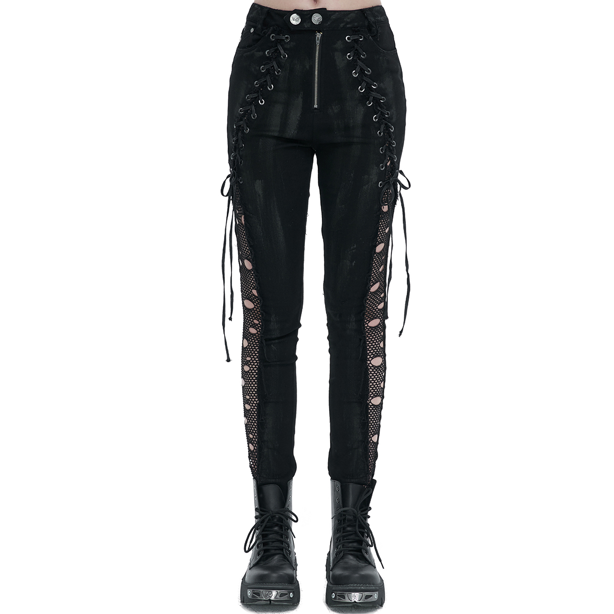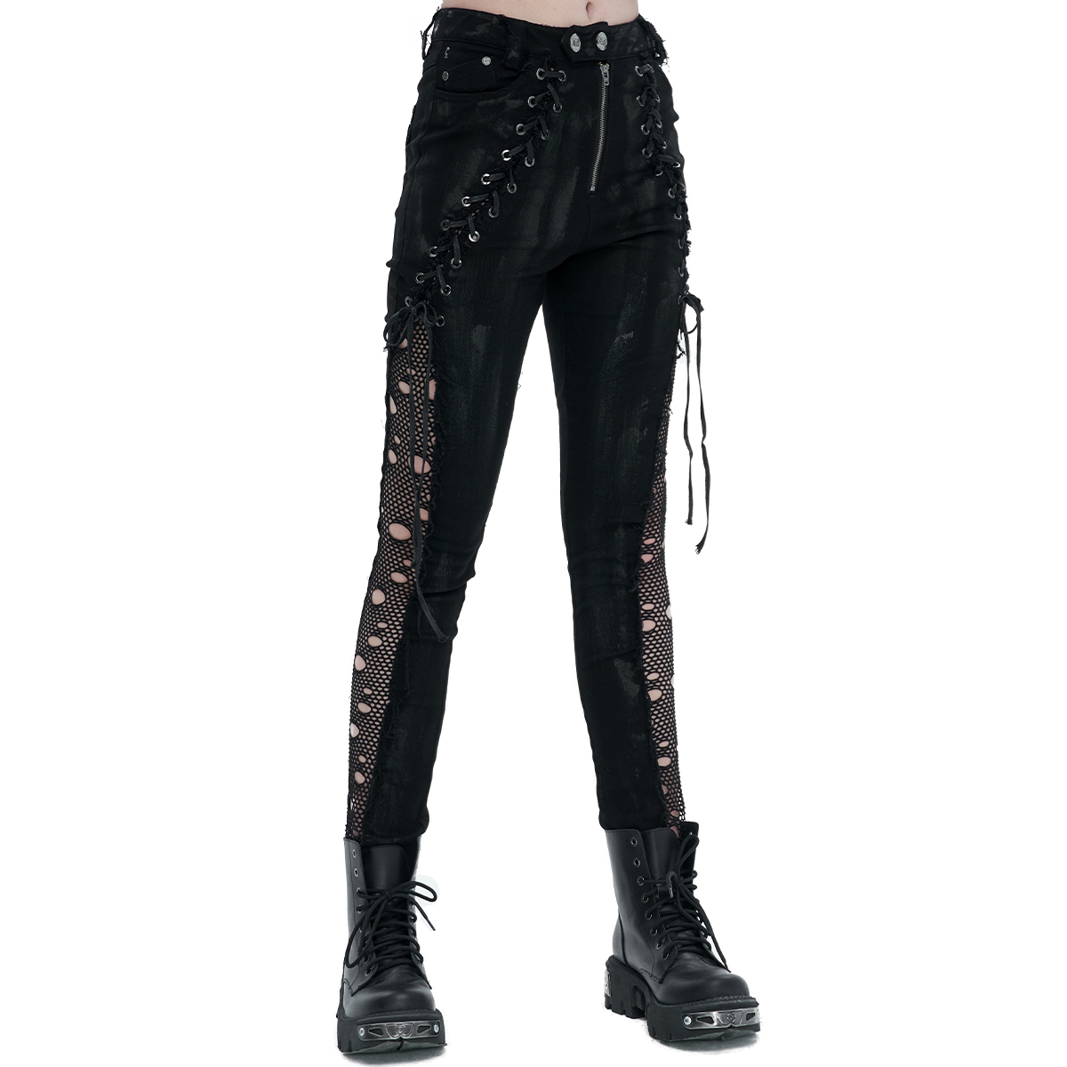 Gothic women's black vinyl slim fit trousers with cut-out laced calves and lacing at the front of the thighs. • Slim fit design • Made of mixed cotton and synthetic vegan leather knitted fabric...