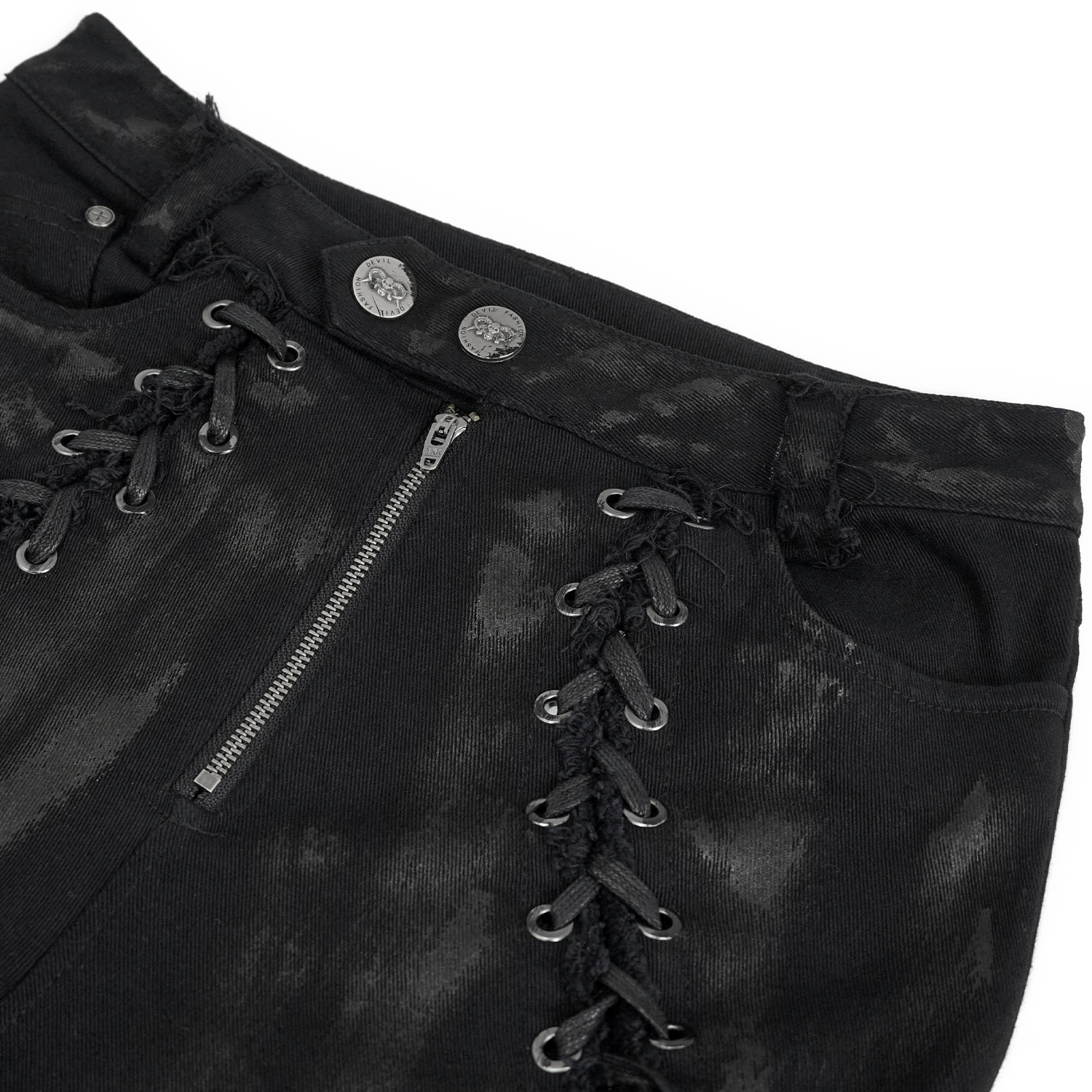 Gothic women's black slim fit stonewashed black trousers decorated with belt straps and press studs. • Slim fit design • Stonewashed black fabric printed with dark grey skulls • Left thigh...