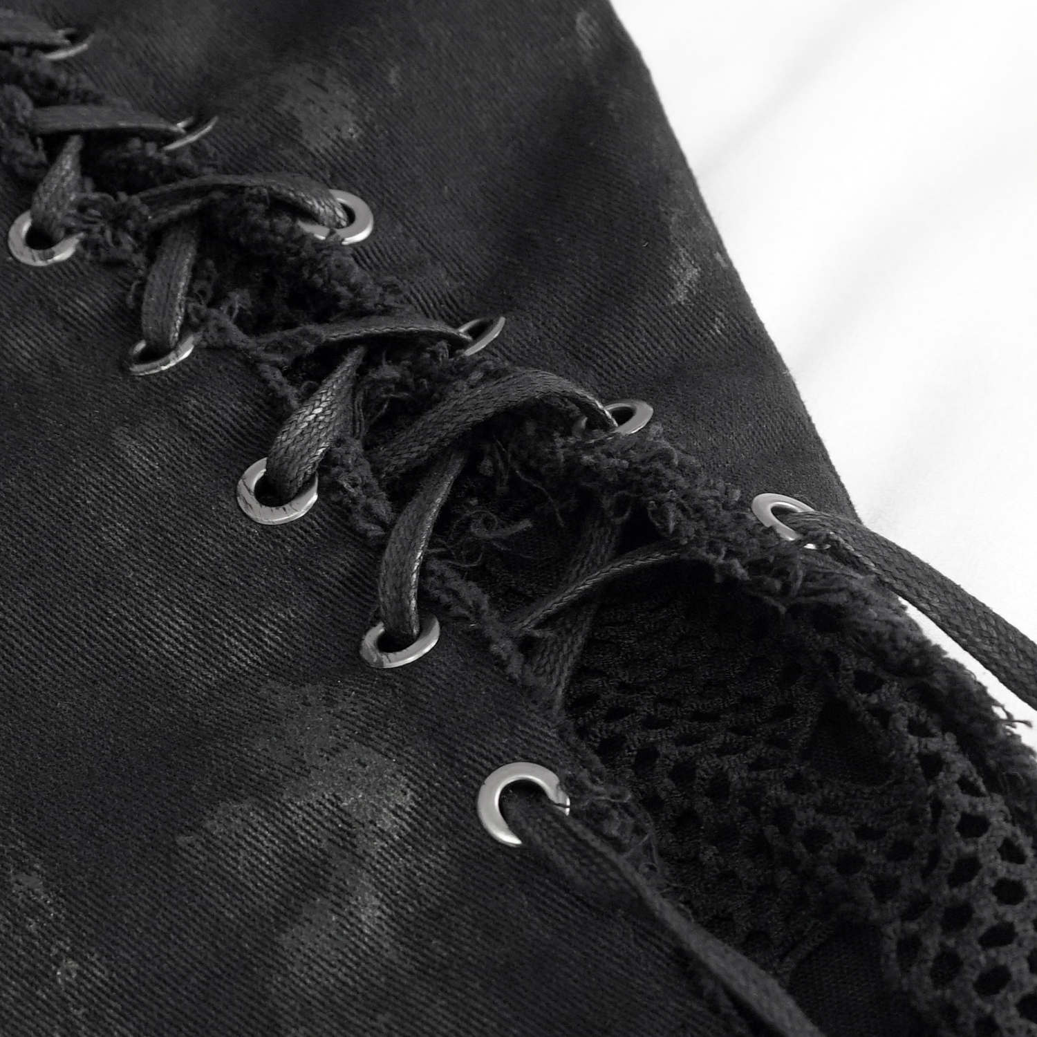 • In mesh and stretchy faux leather • Gothic cameo pattern print, roses and crosses on the front of the thighs • Lacing on the front of the thighs • Front zipper • Metal studs on faux leather on...