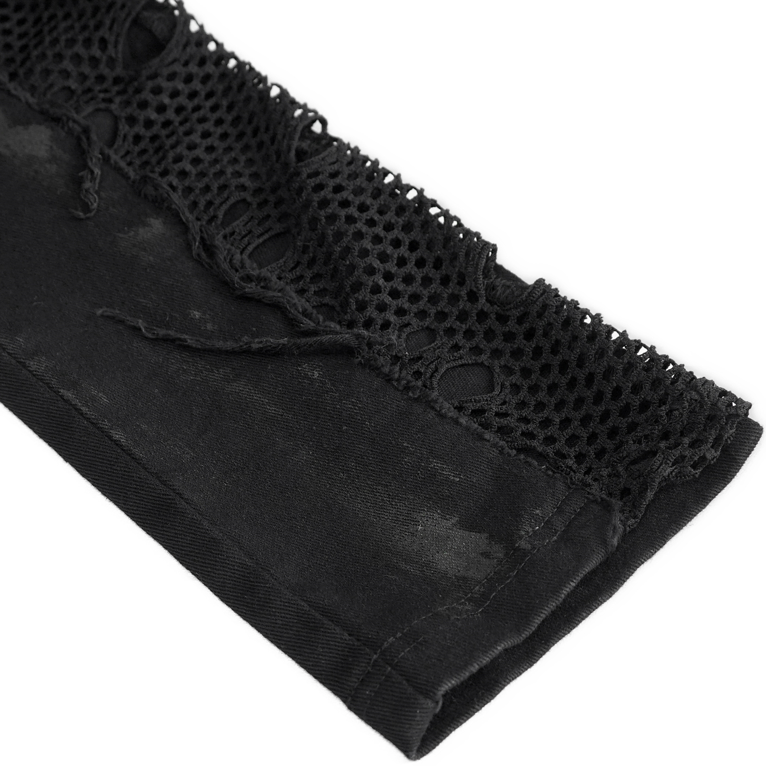 • In aged twill and mesh • Concealed zipper and skull-shaped metal button • Four pockets • Small size • Presence of torn fishnet on the upper thighs, the belt and the back pockets • Straight cut •...