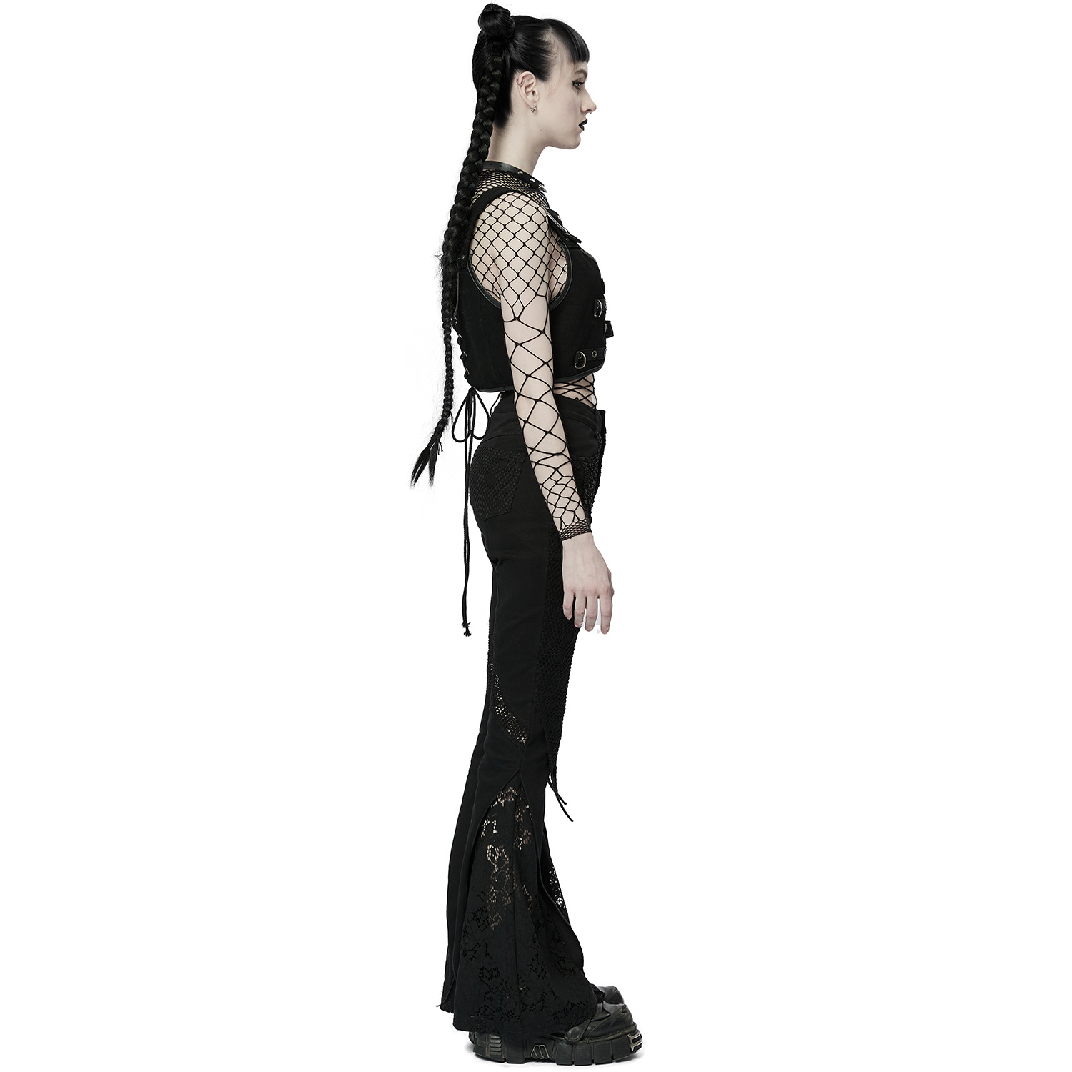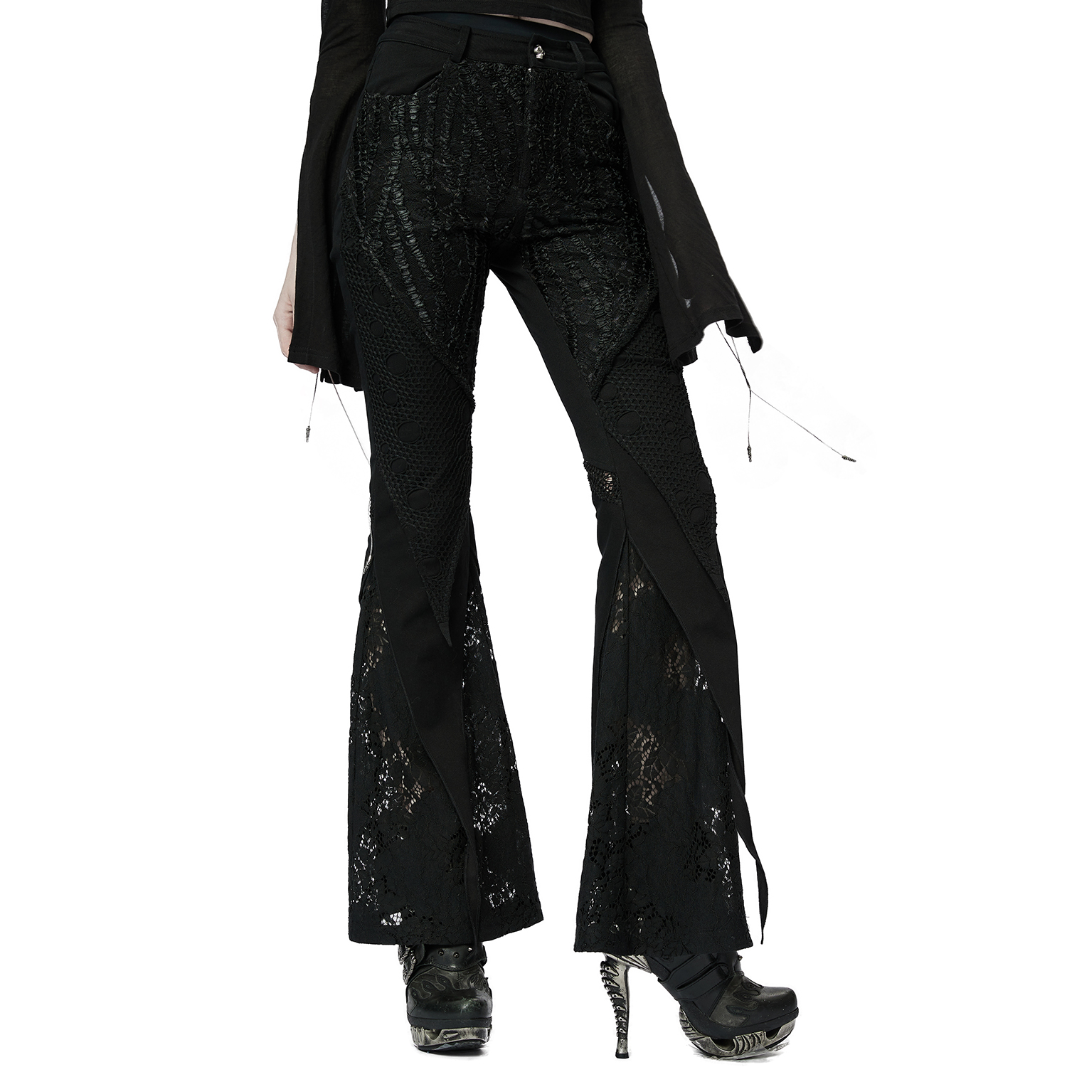 • In mesh and stretchy faux leather • Gothic cameo pattern print, roses and crosses on the front of the thighs • Lacing on the front of the thighs • Front zipper • Metal studs on faux leather on...