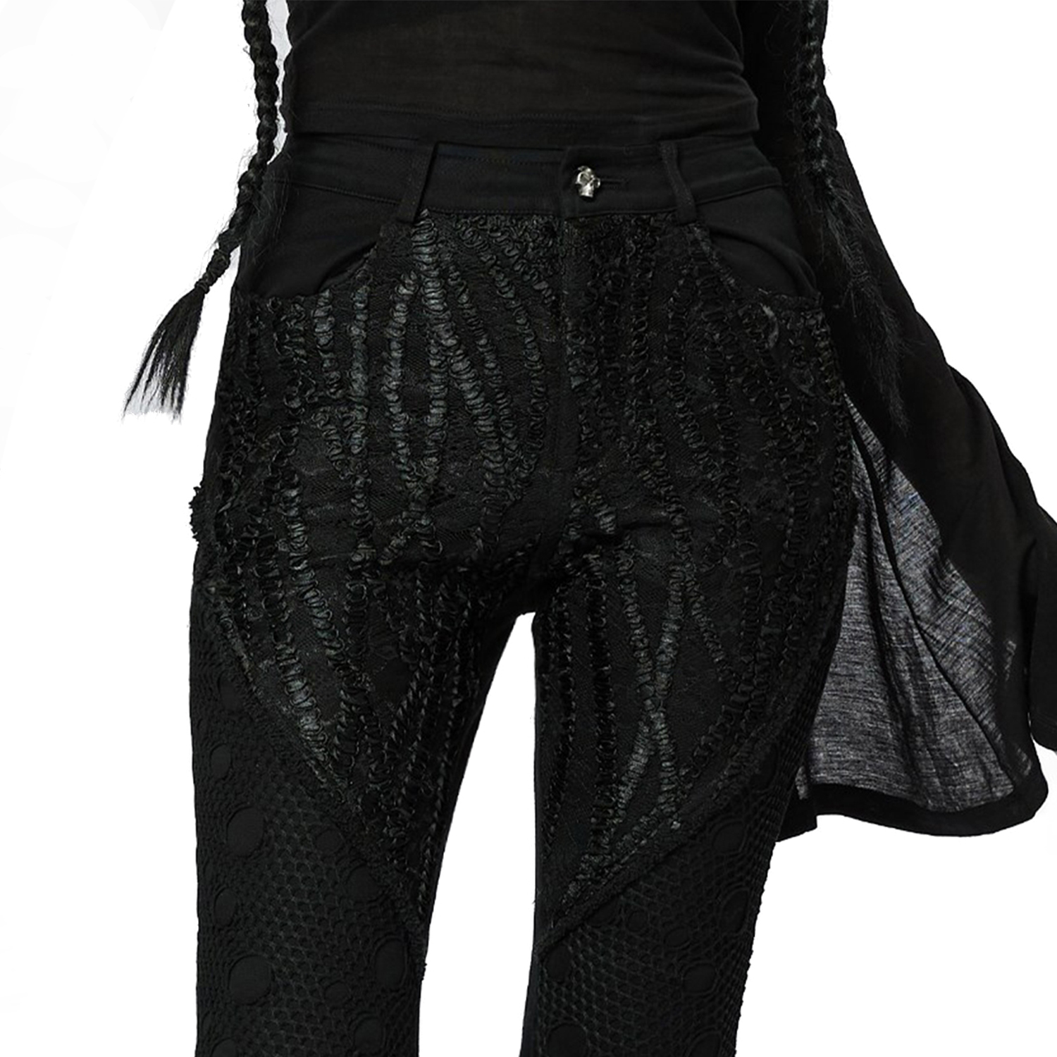 • In super-elastic imitation leather with wavy pattern • Diamond-shaped mesh panels on both thighs • Lacing with metal eyelets on the thighs • Four pockets • Hidden zipper • Metal button with...