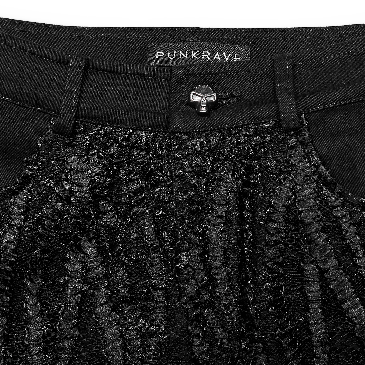 • Black stretch denim • Fitted mid-rise waist • Lace-up thigh accents • Front zipper • Skull-shaped metal button • Spliced black faux leather accents • Slim fit that flatters your curves • Belt...