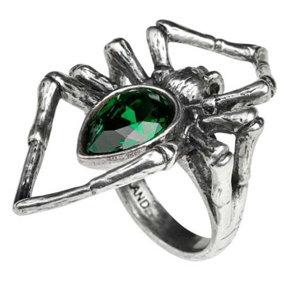 • A giant spider, polished pewter ring with a large emerald green Swarovski crystal body.