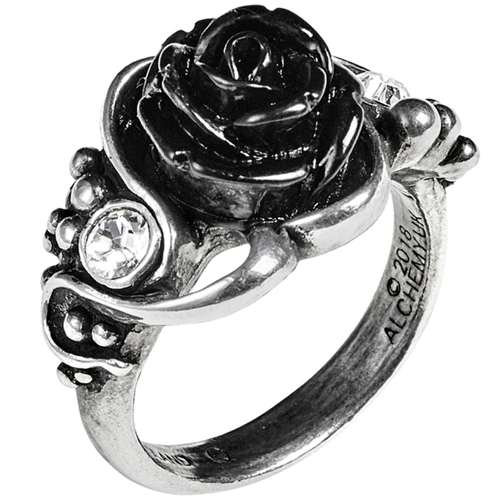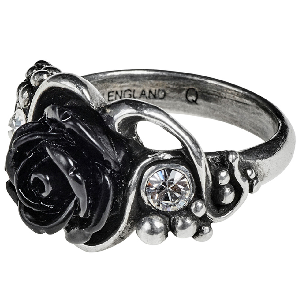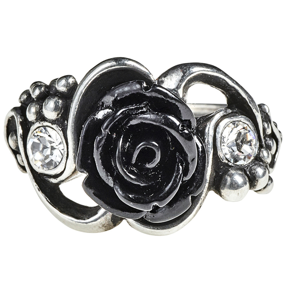 • Polished pewter rose and grape vine ring, with black resin rose at its centre and a clear crystal Swarovski gem either side.