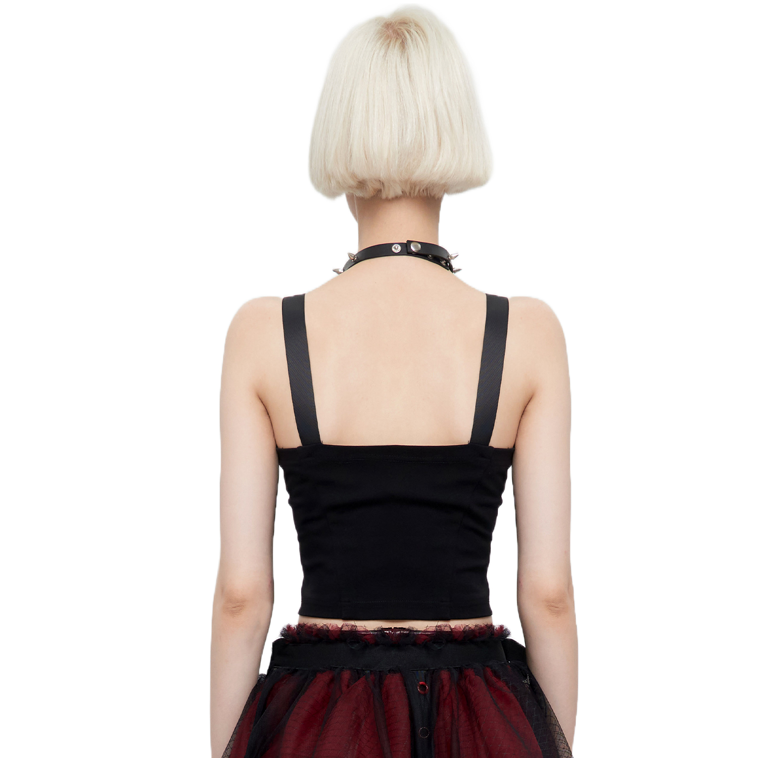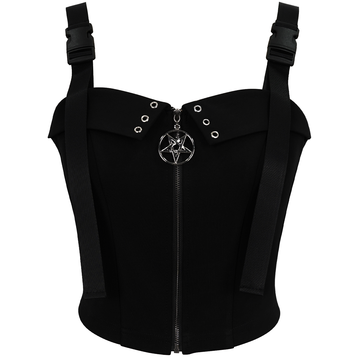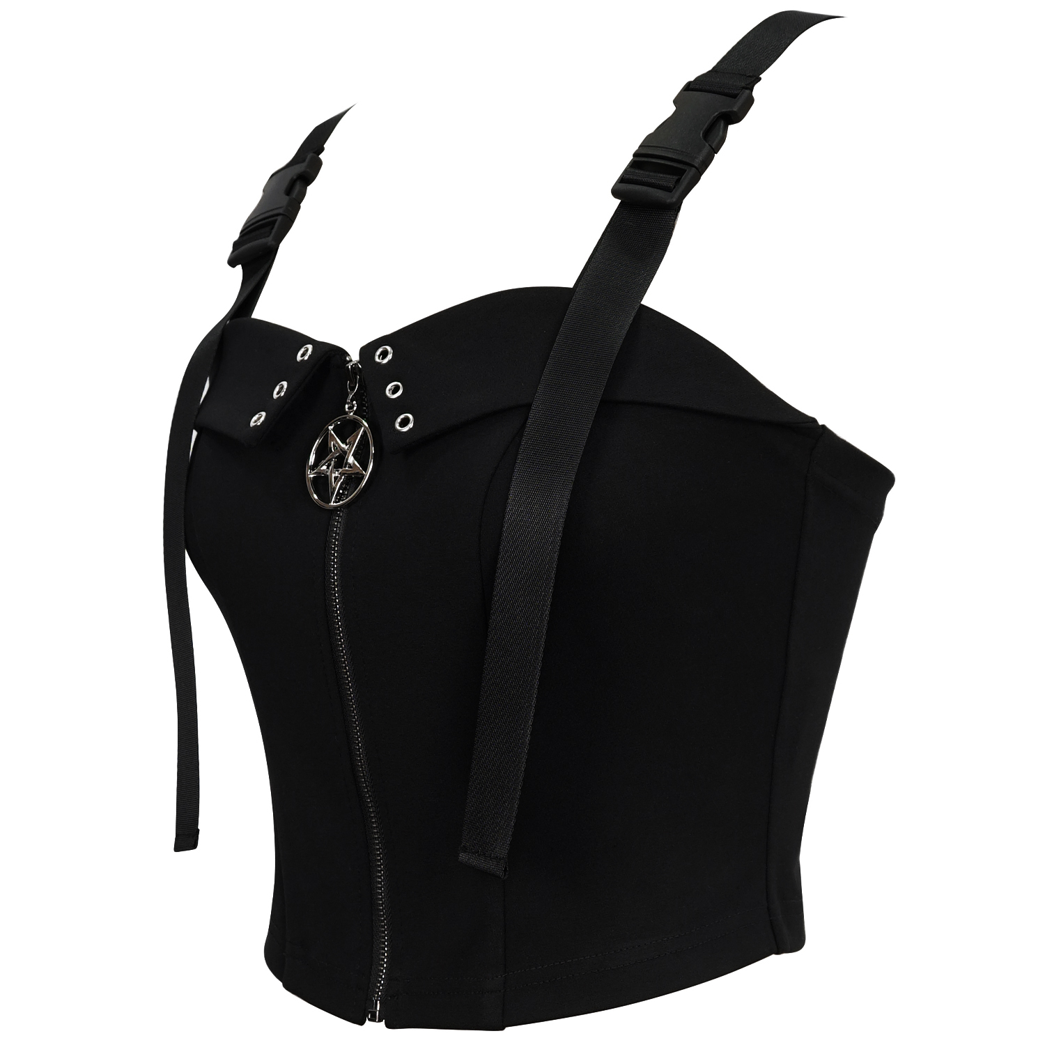Gorgeous sleeveless gothic top • Visible zipper on the front • Coffin-shaped zipper pull • Double buckles on each shoulder • Metallic brand logo on the upper back • Fully open in the back • Tape...
