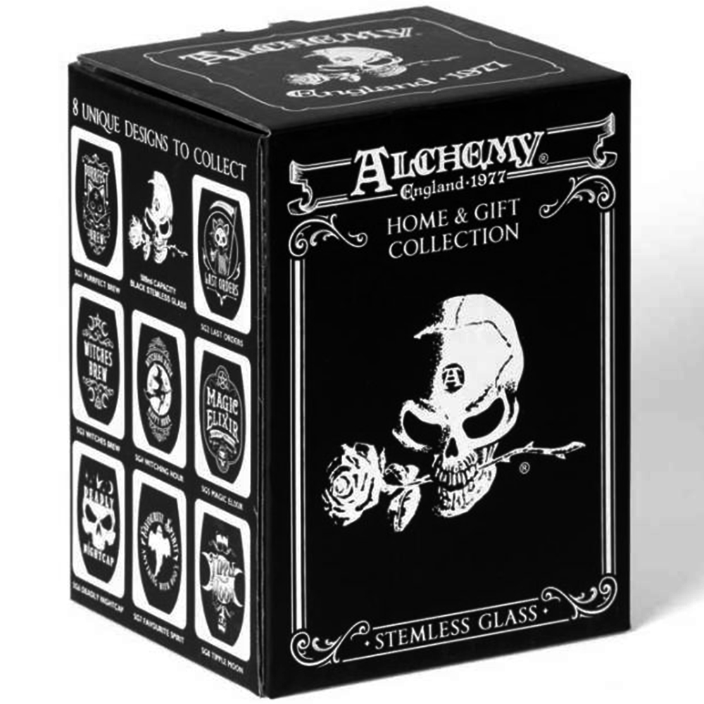 • Glossy black 'stemless' drinking glass with white decal of Alchemy design.