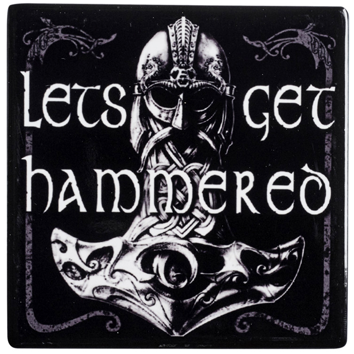 • This fun coasted bares the phrase 'Lets get Hammered' with the image of a Thor's hammer in the background!