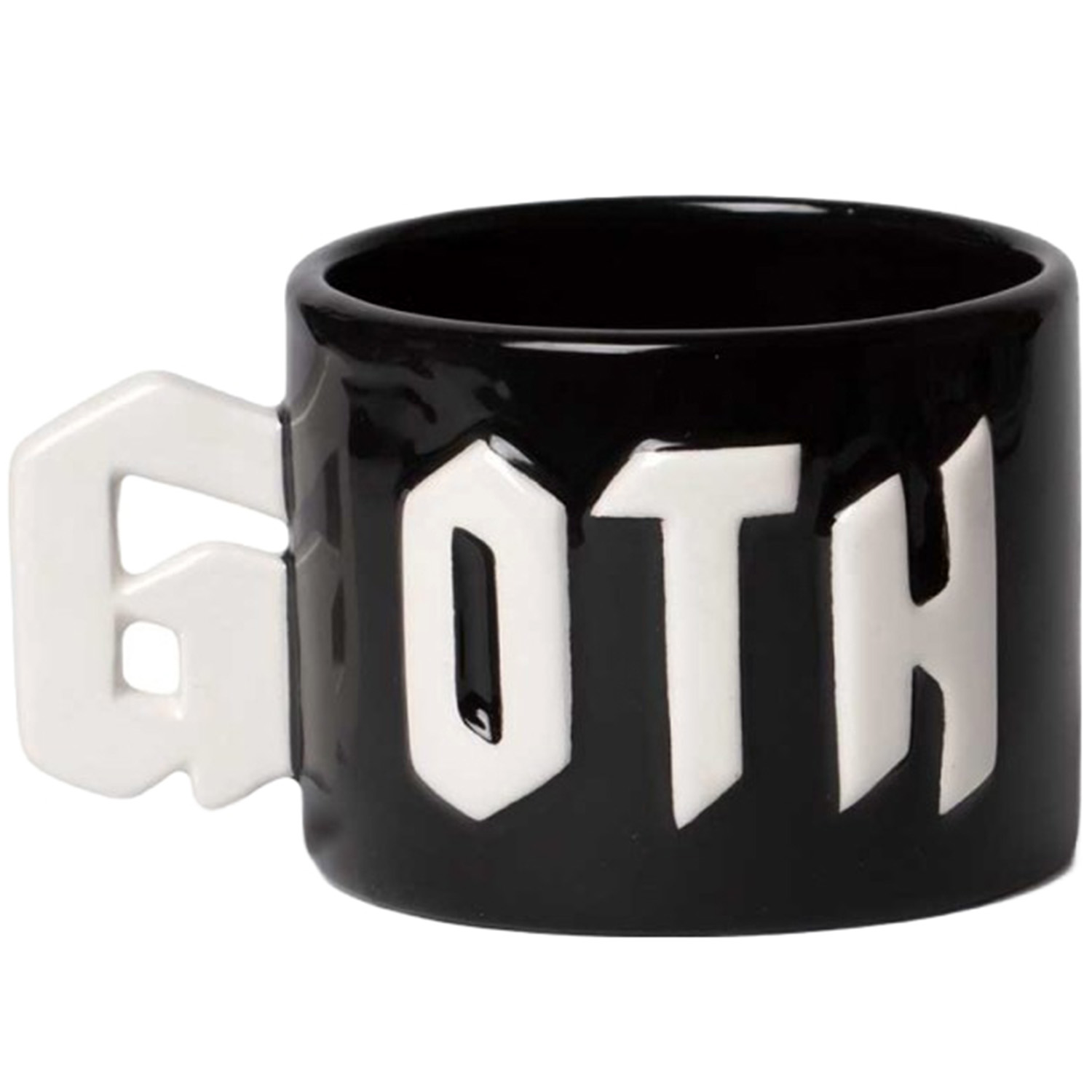 • Hand-painted in glossy black with bold white gothic lettering, this distinctive mug features a sculpted handle shaped like the letter "G" for an unforgettable look.