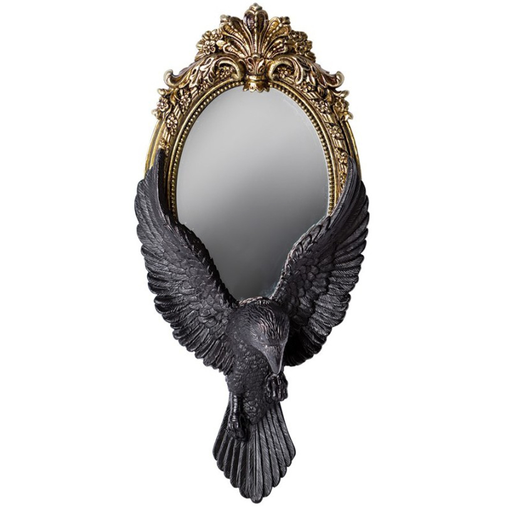 • Crafted with meticulous attention to detail, this stunning mirror features a realistically designed black raven in flight, exquisitely nestled within an opulent gold baroque frame.