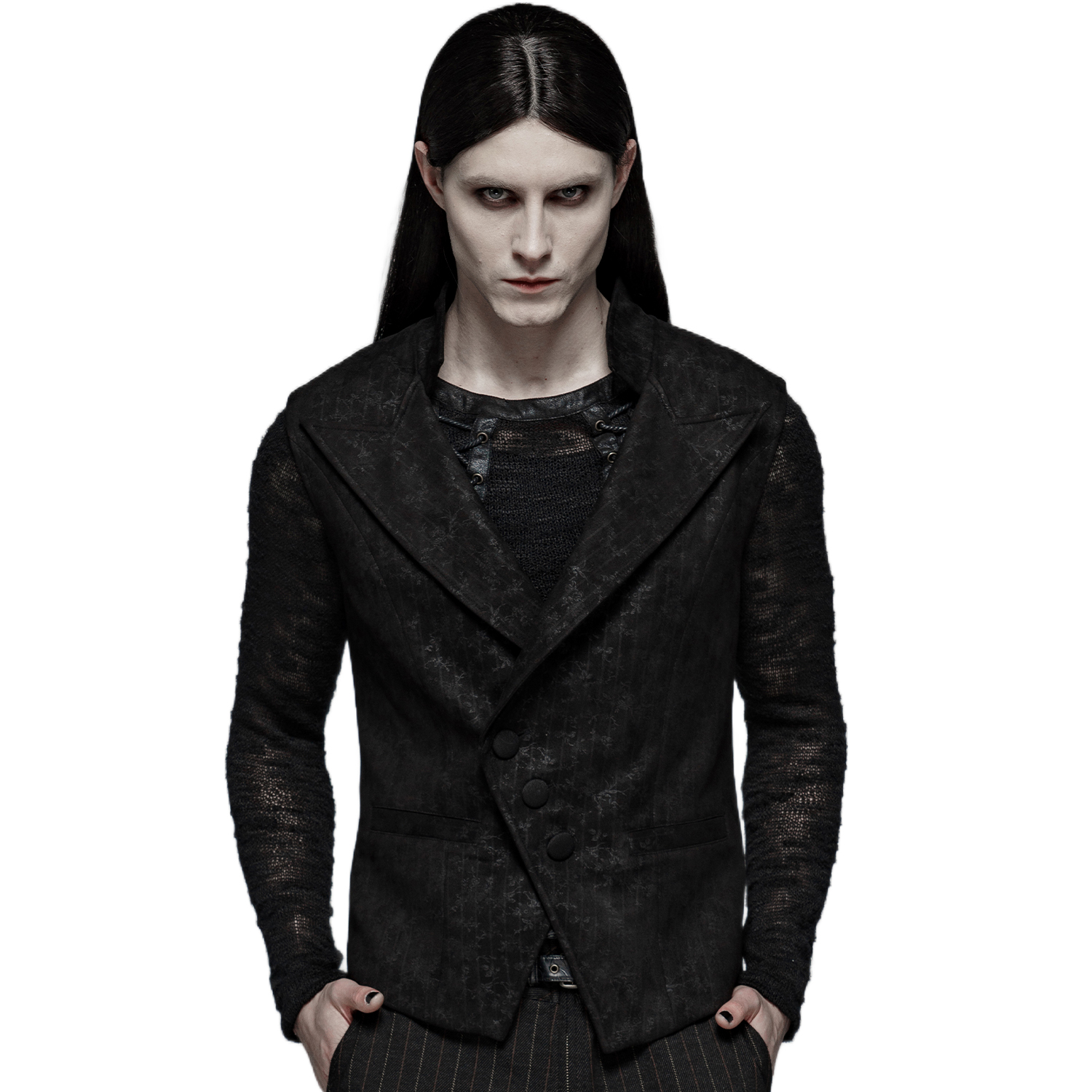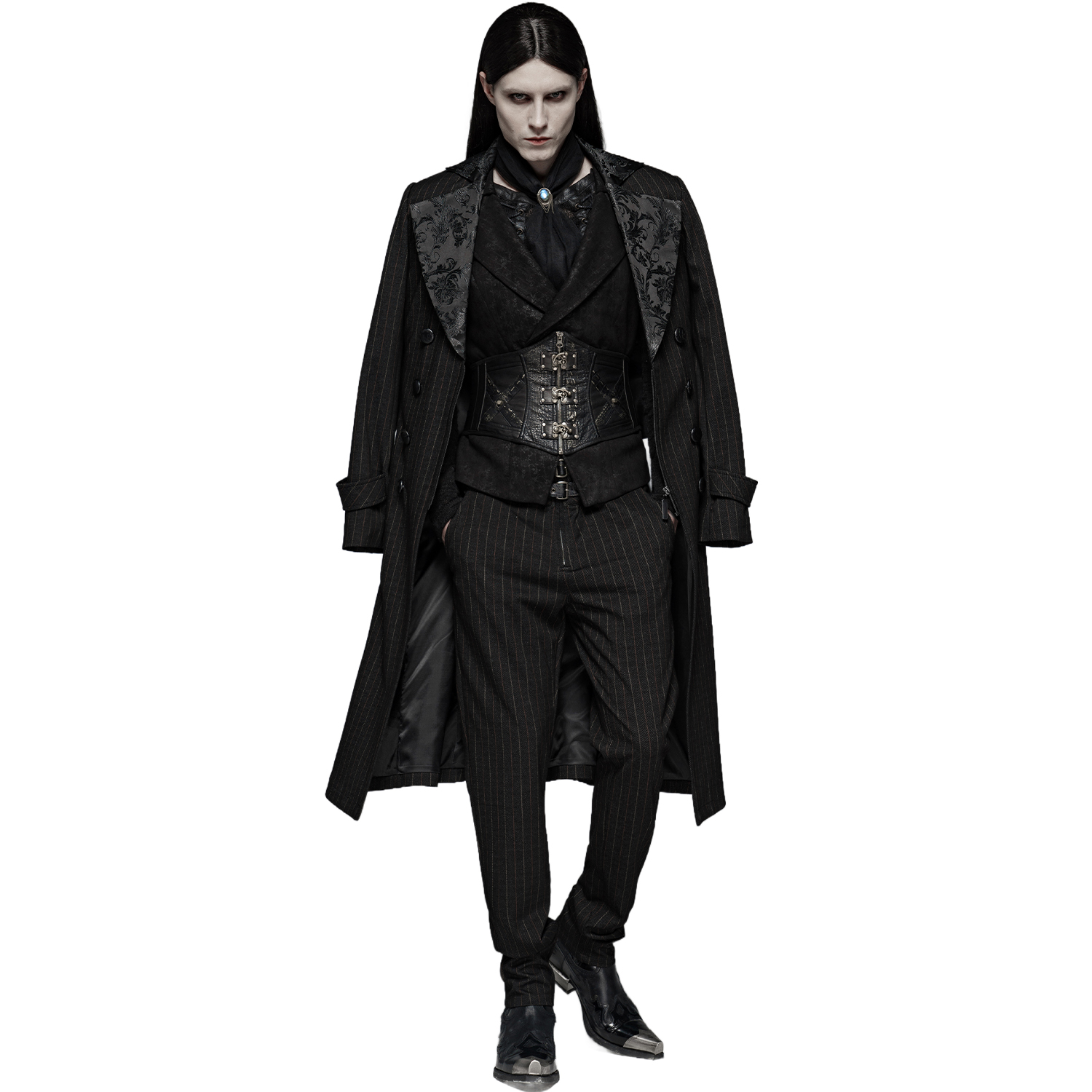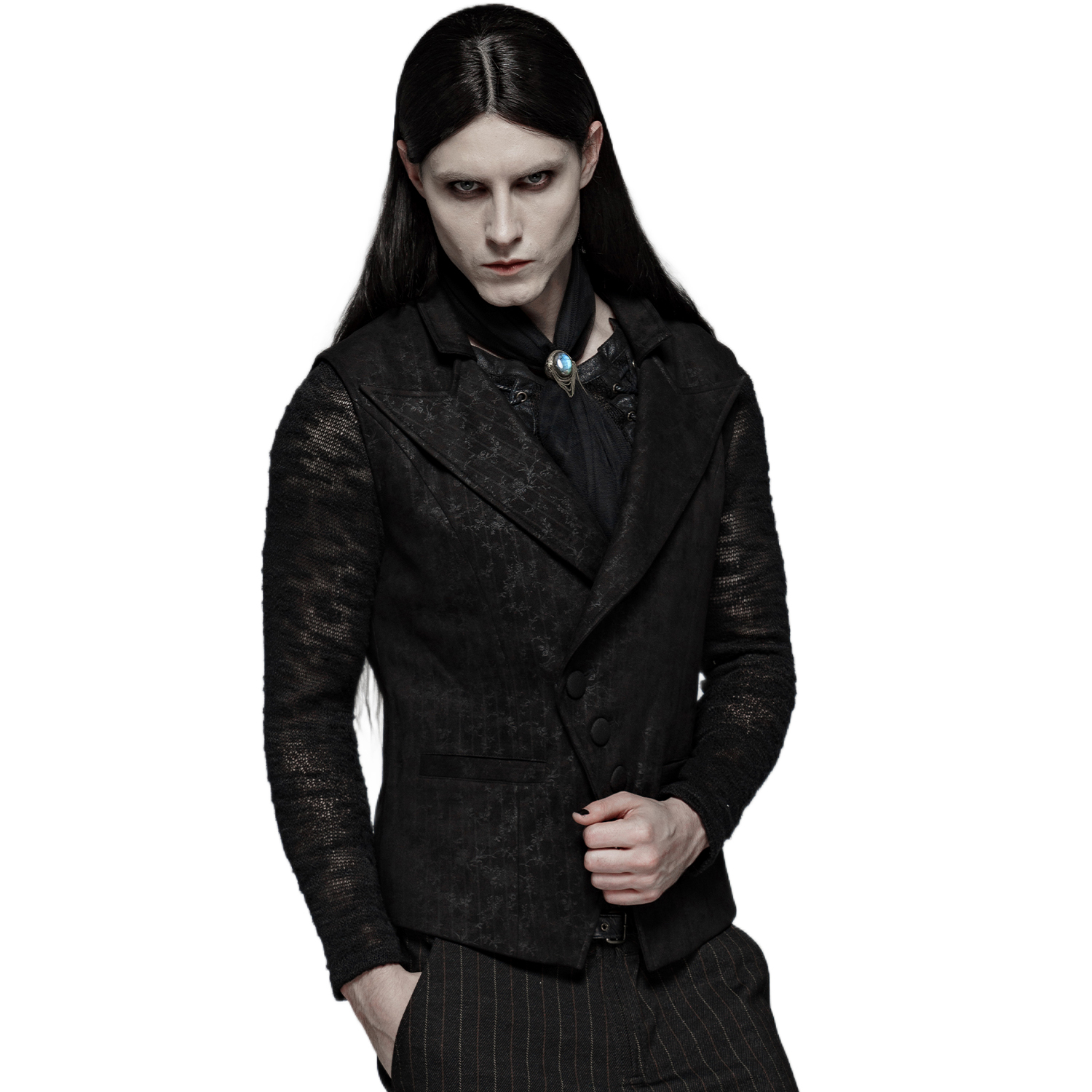 • Made from premium jacquard • Diagonal button closure at the front • Left lapel in a batwing shape • Removable cross and feather brooch on the right lapel • Decorative metal chains • Two...