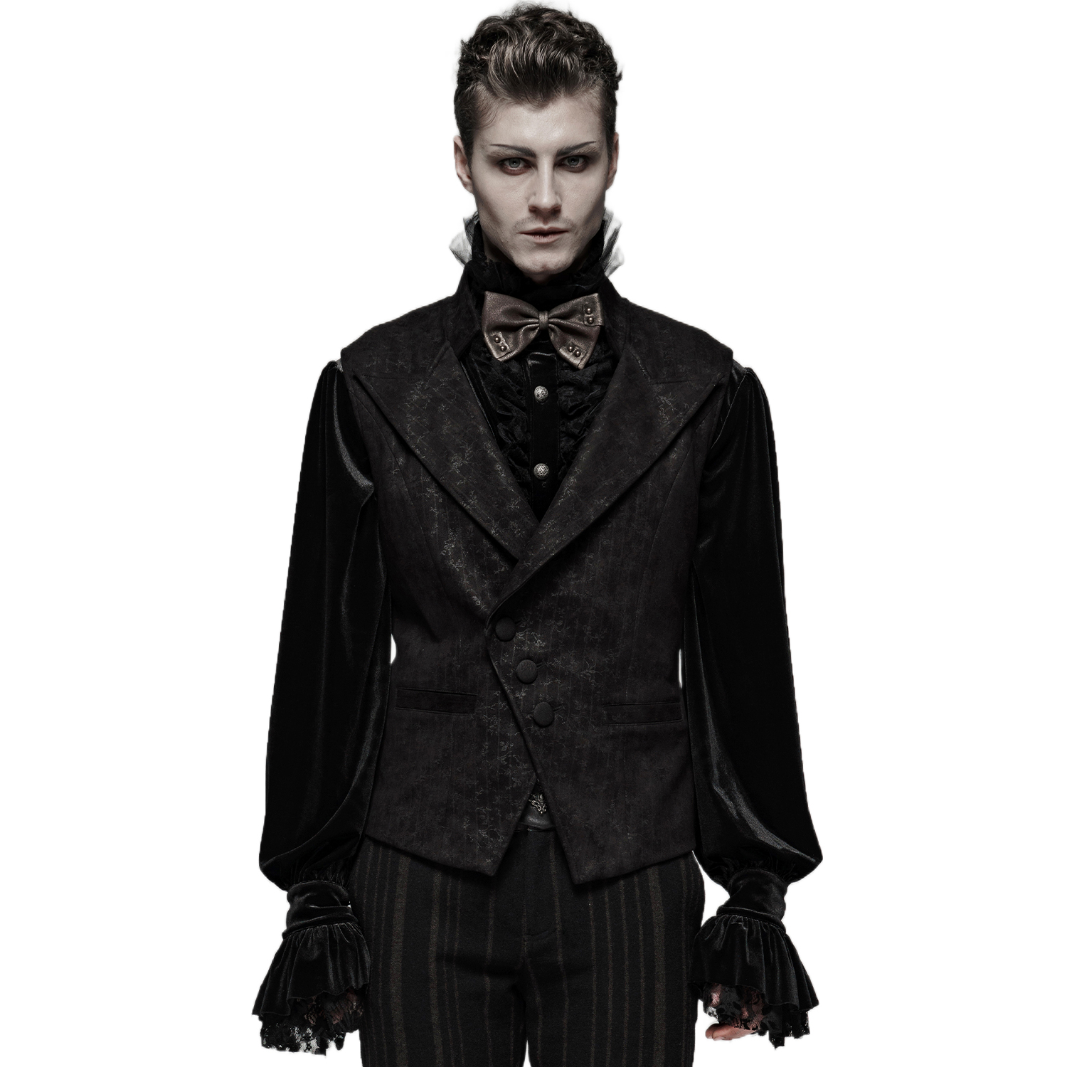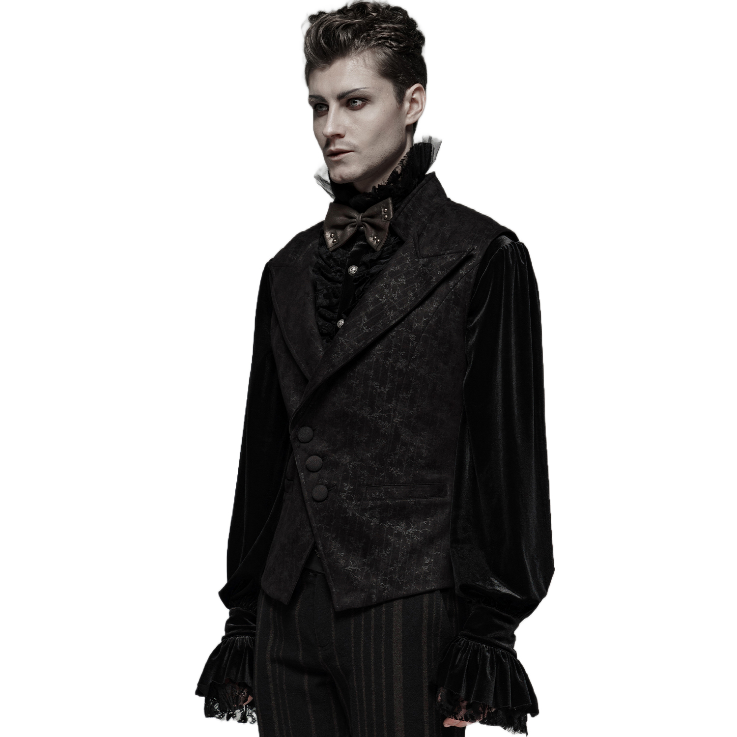 Gothic Victorian style men's black-grey damask vest decorated with satin ribbon ornament straps on the front closure and black embossed buttons. • Eyeleted back strap with silver embossed buckle. •...