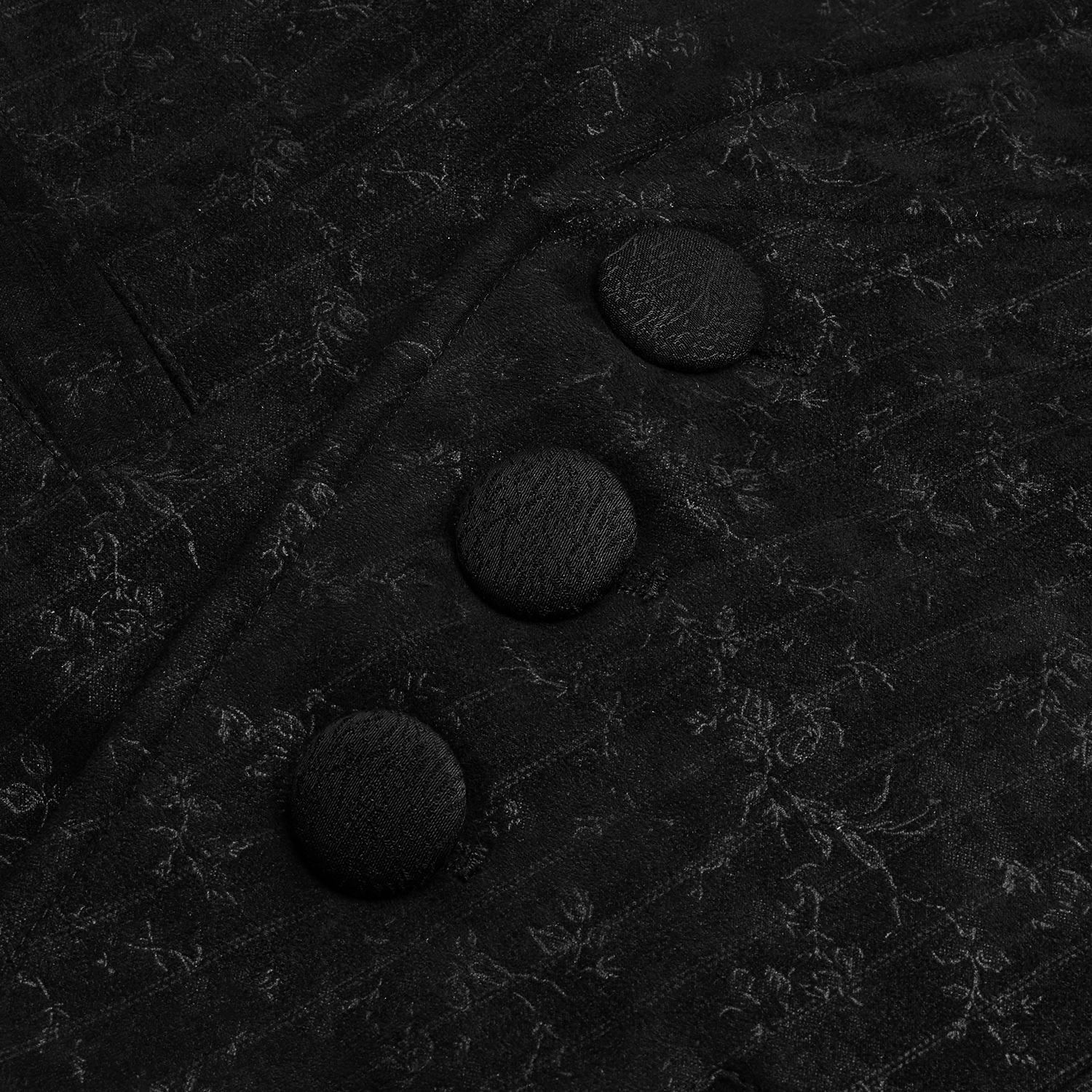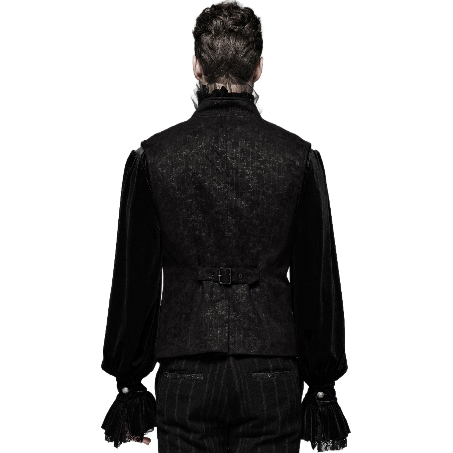Victorian gothic waistcoat in black jacquard • Pattern has 3D effect • Cross cut on the front • Eight hand sewn buttons • Decorative chain on a strip of lace • Two patch pockets • Adjustable buckle...
