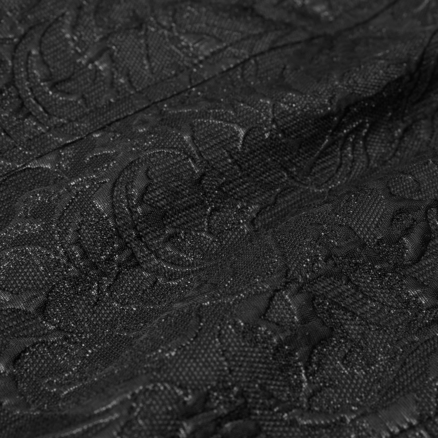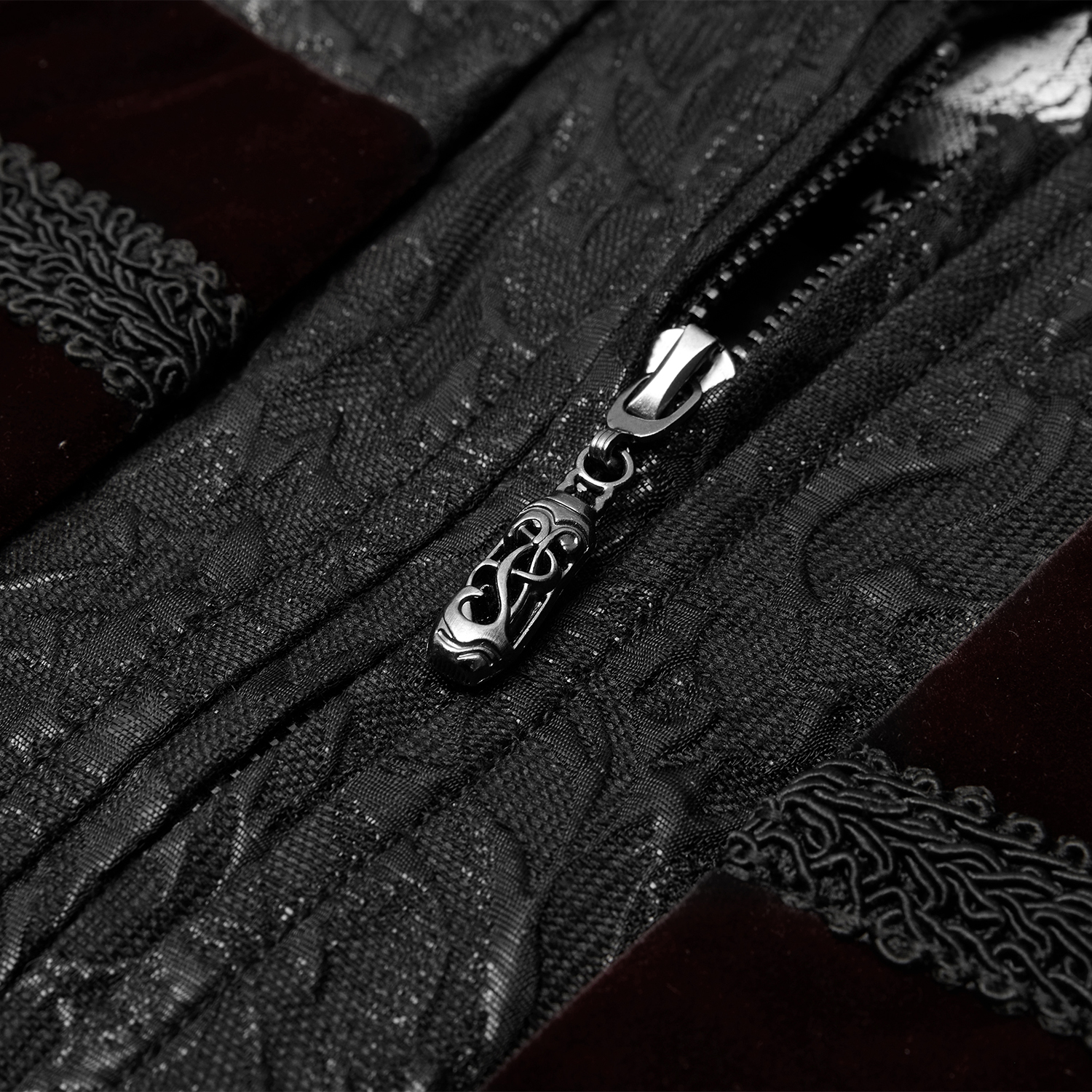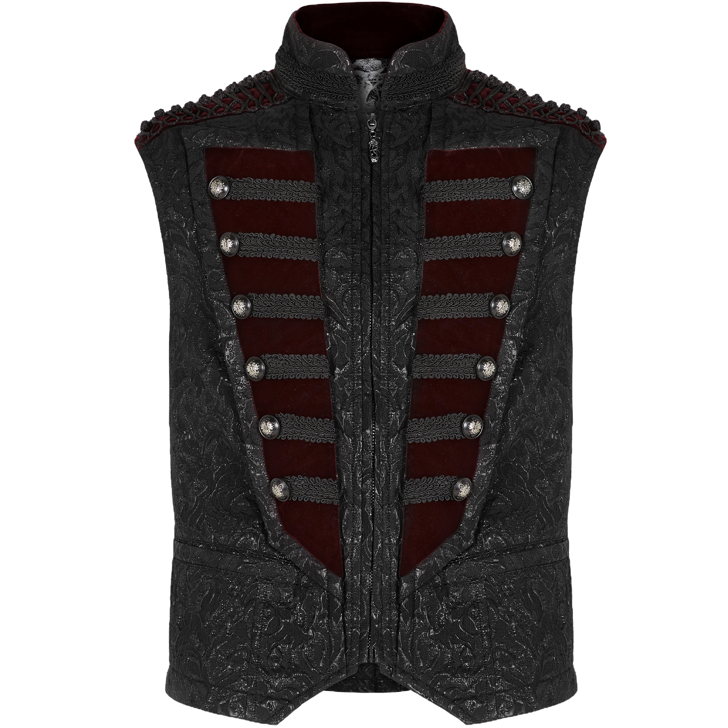 Black brocade jacquard and velvet victorian waistcoat • Embroidered high collar • Front zipper with molded pull tab • Horizontal black velvet bands and raised buttons • Black velvet shoulder...