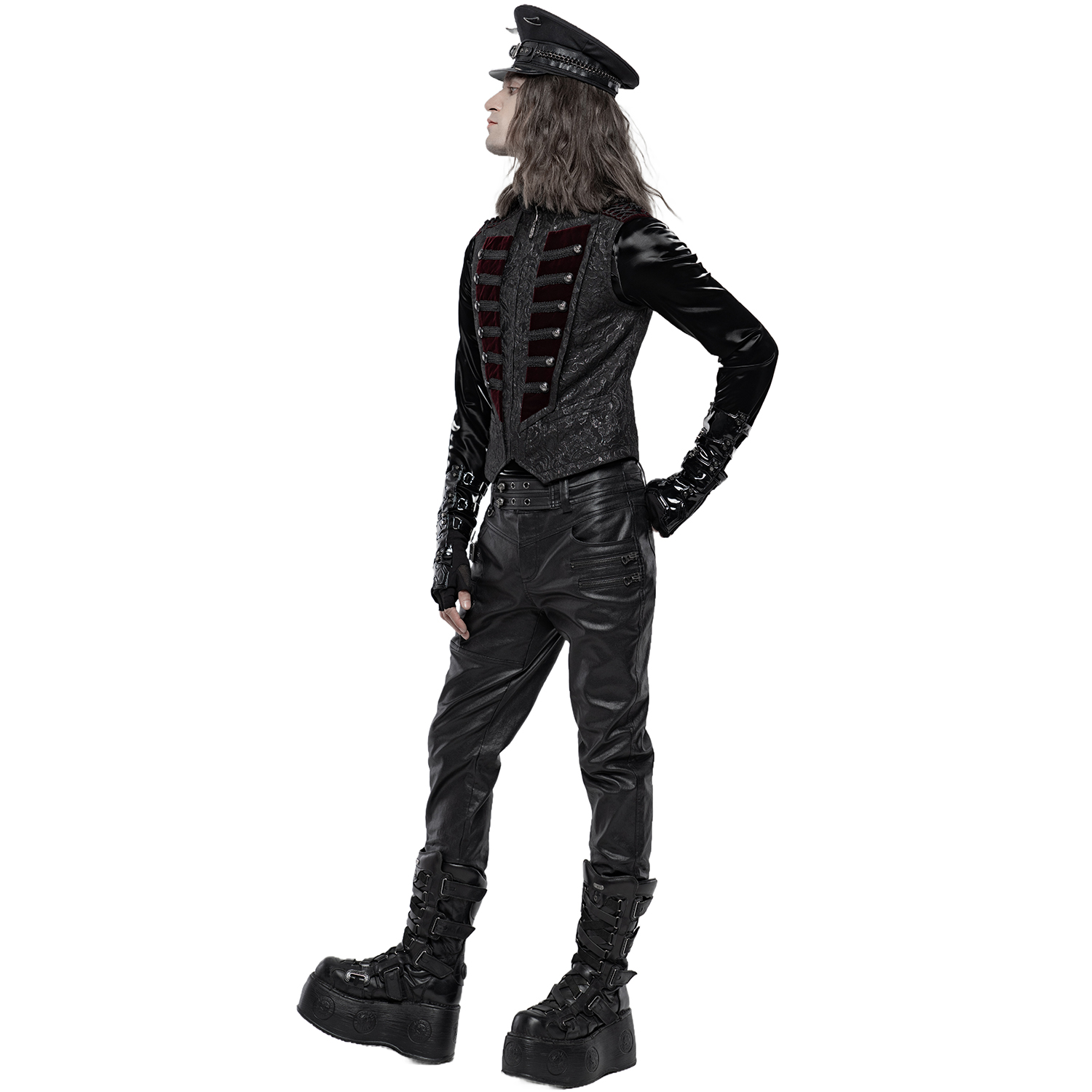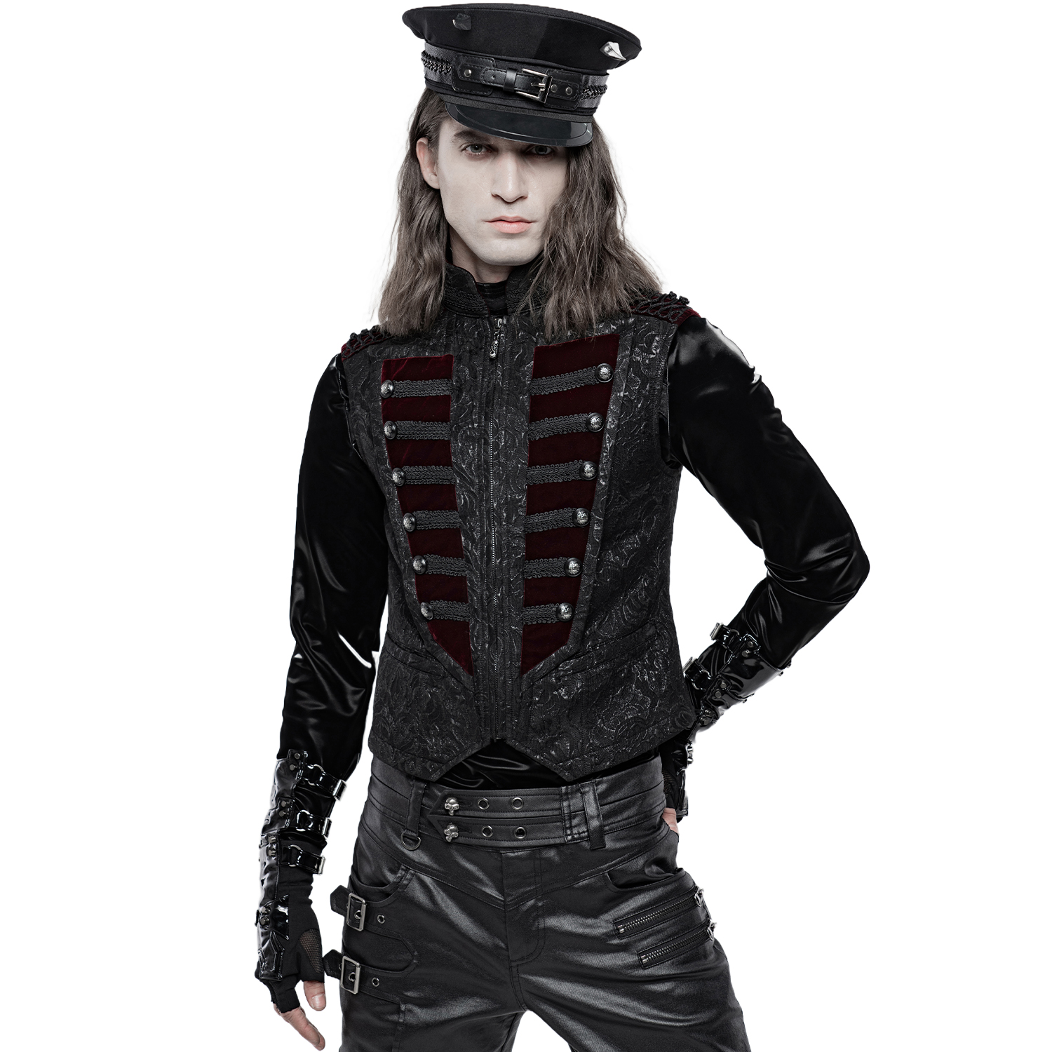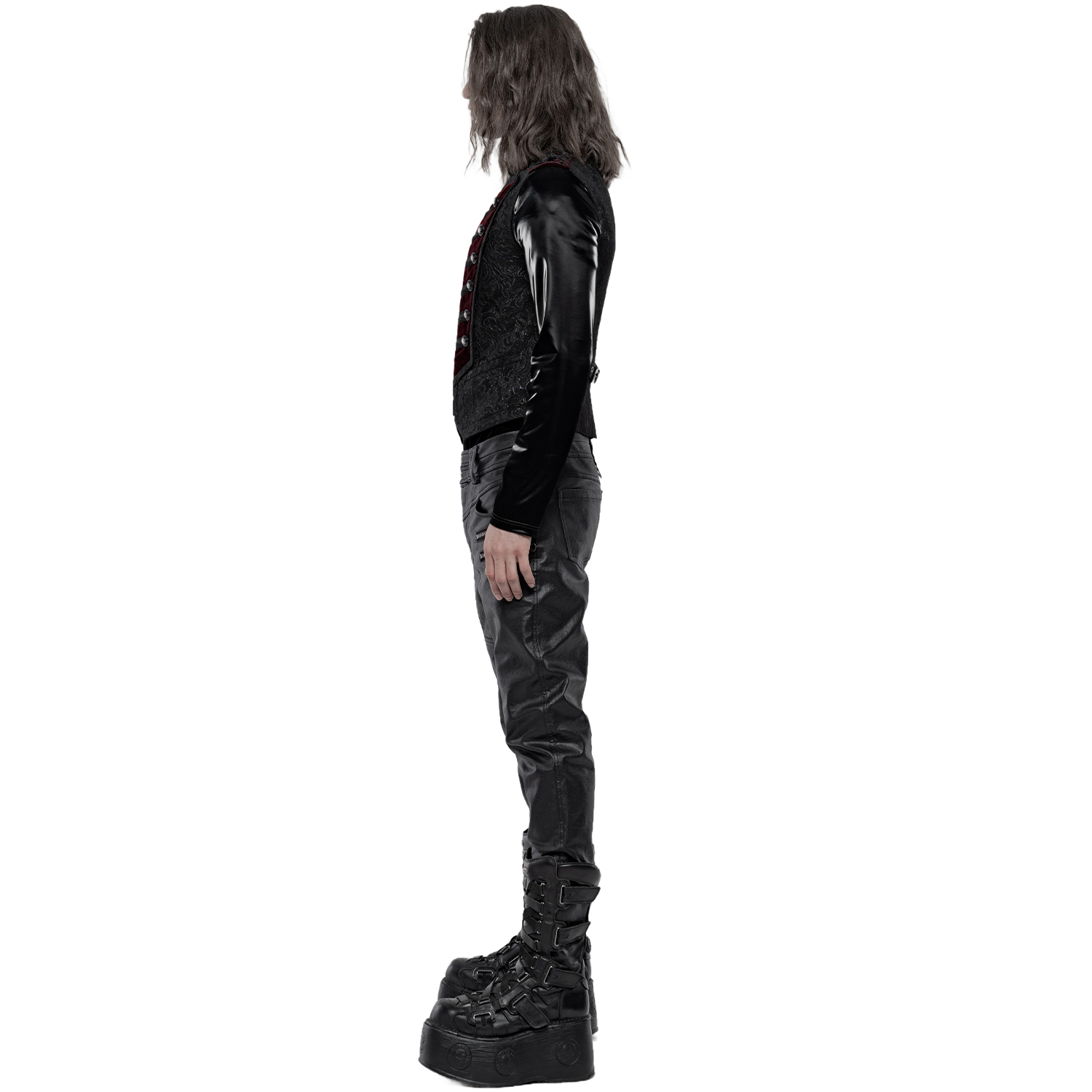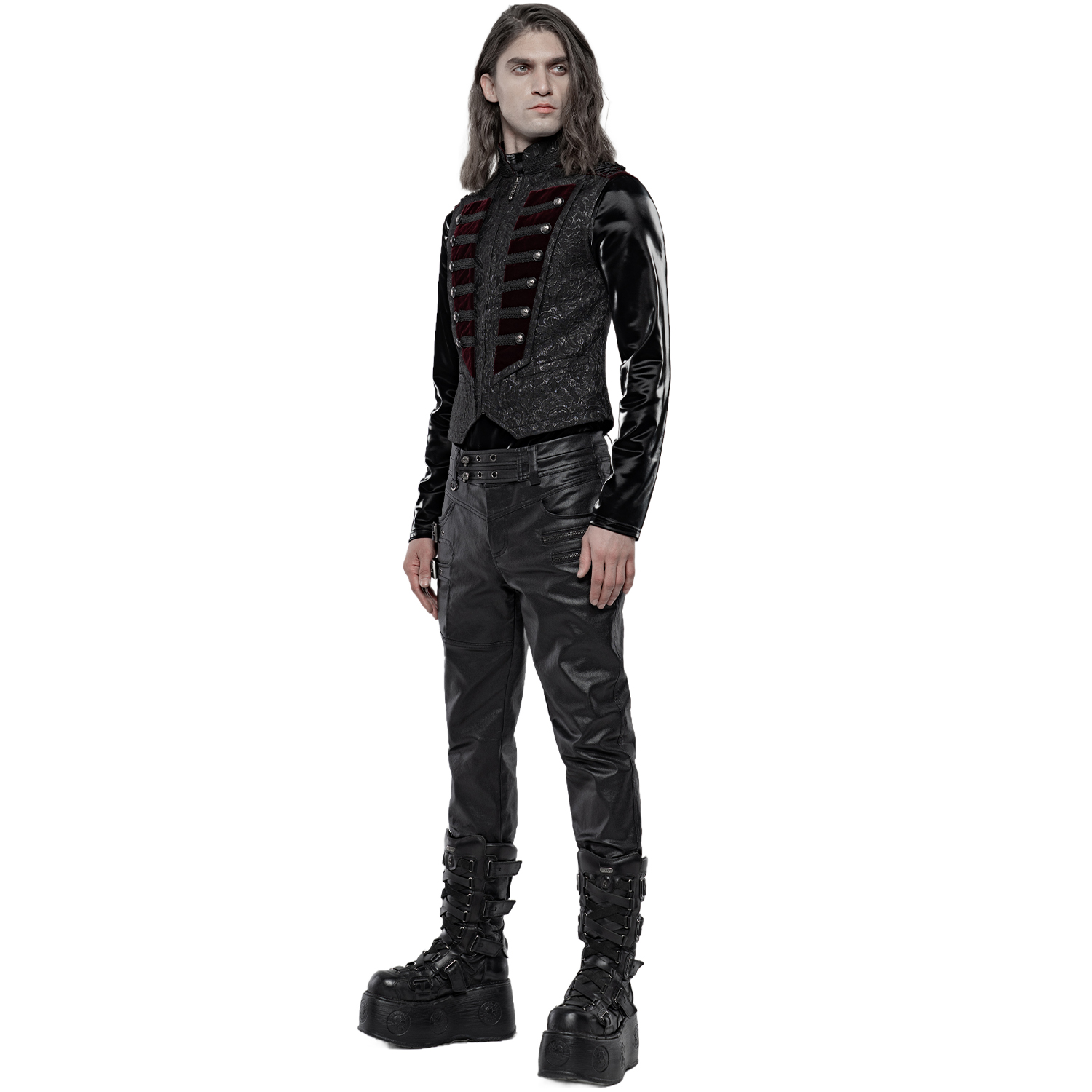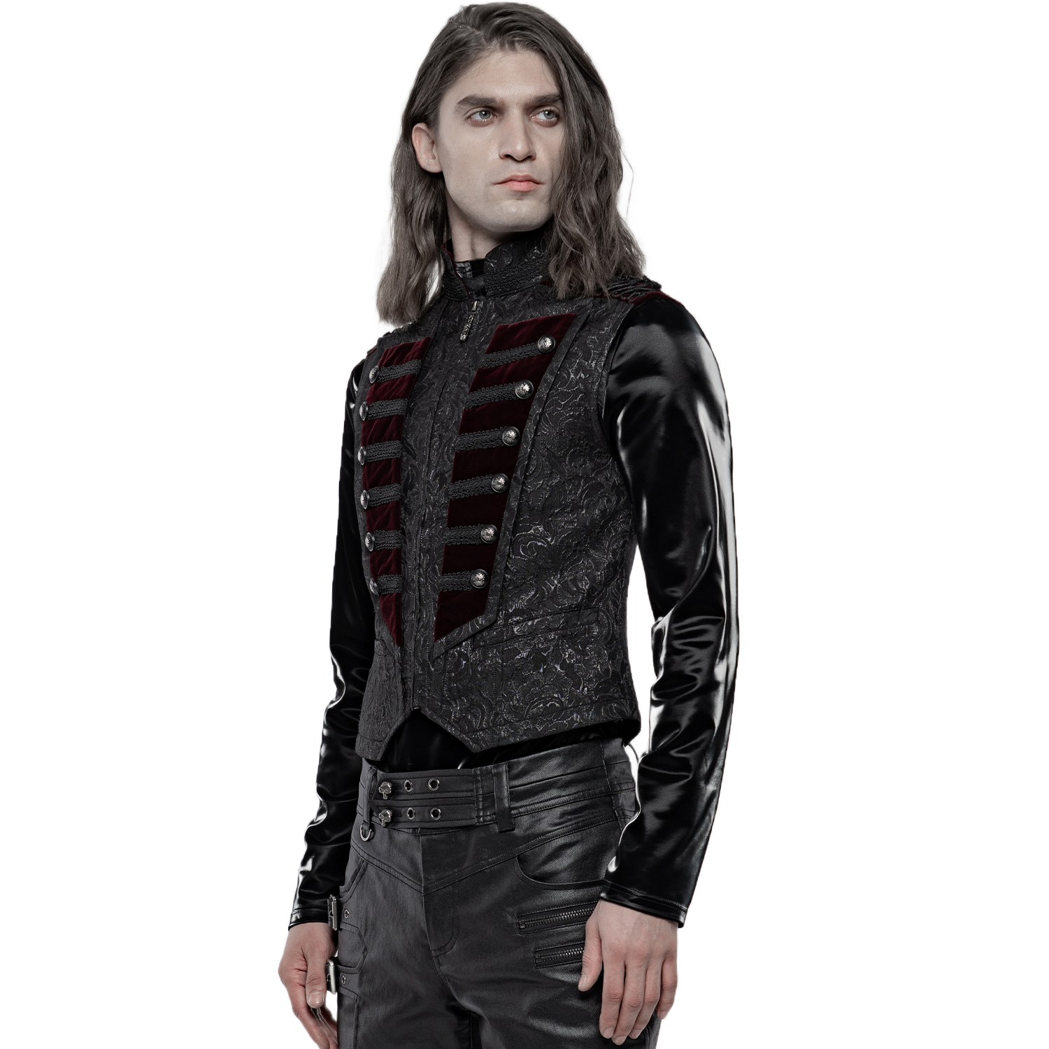 Gothic Victorian style male's dark red damask vest decorated with satin ribbon ornament straps on the front closure and black embossed buttons. • Eyelet back strap with silver embossed buckle. •...