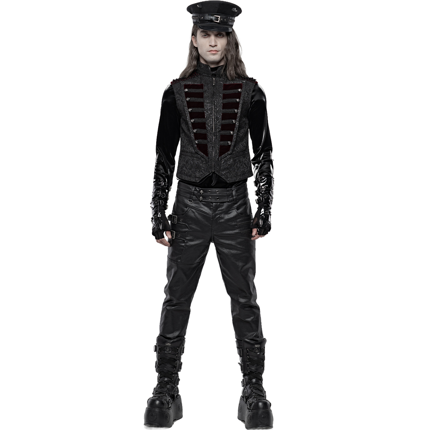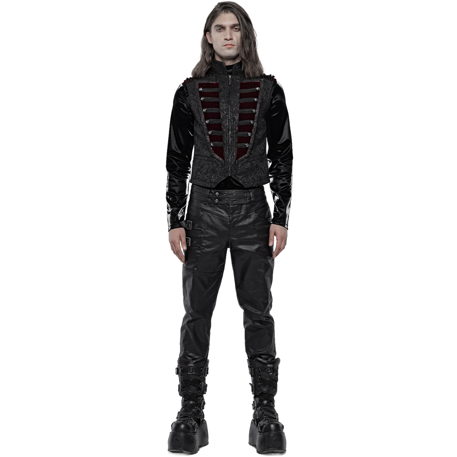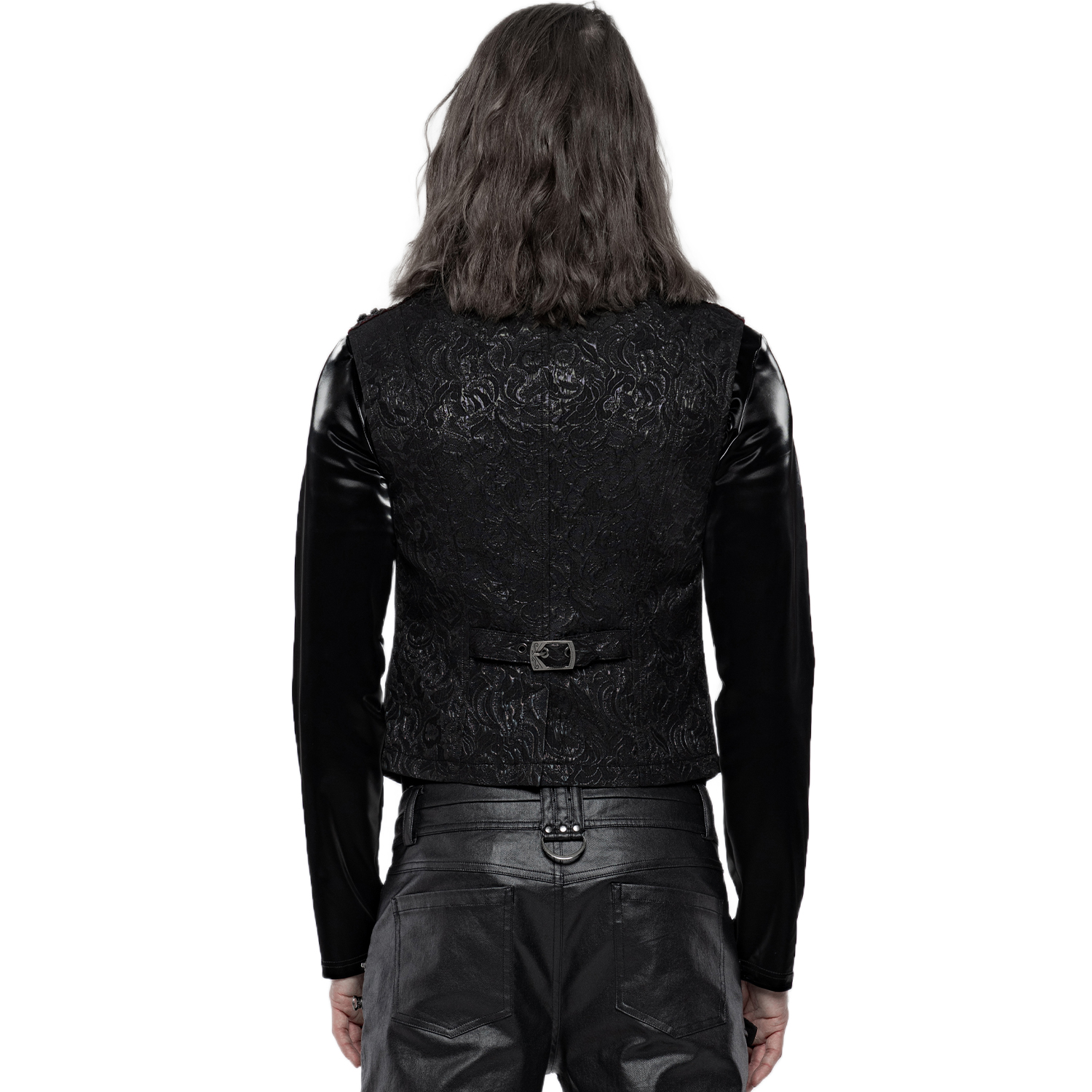 Black gothic men's vest with synthetic leather details and hook fastening at the front. • Synthetic vegetable leather panels on shoulders and pockets • Silver hooks closure on the front • Synthetic...