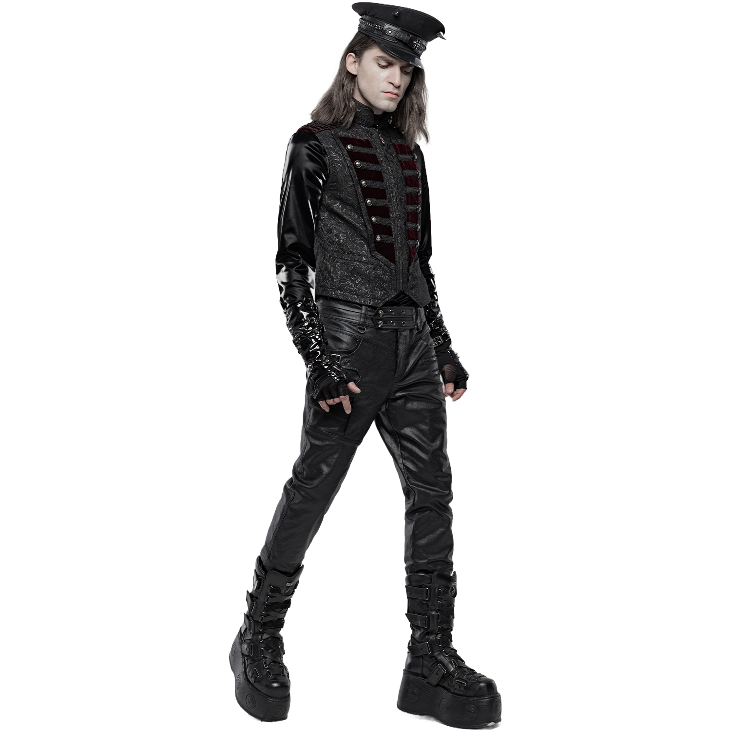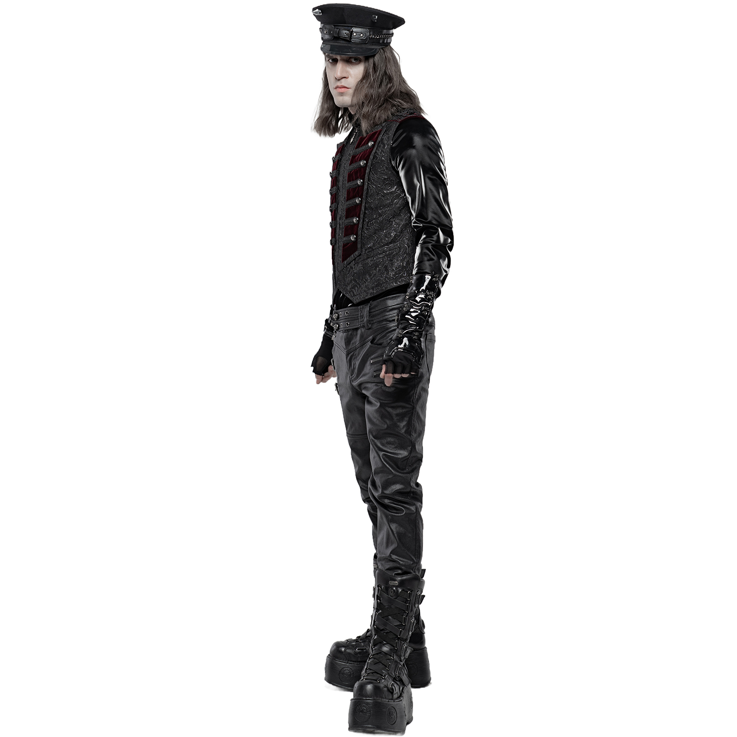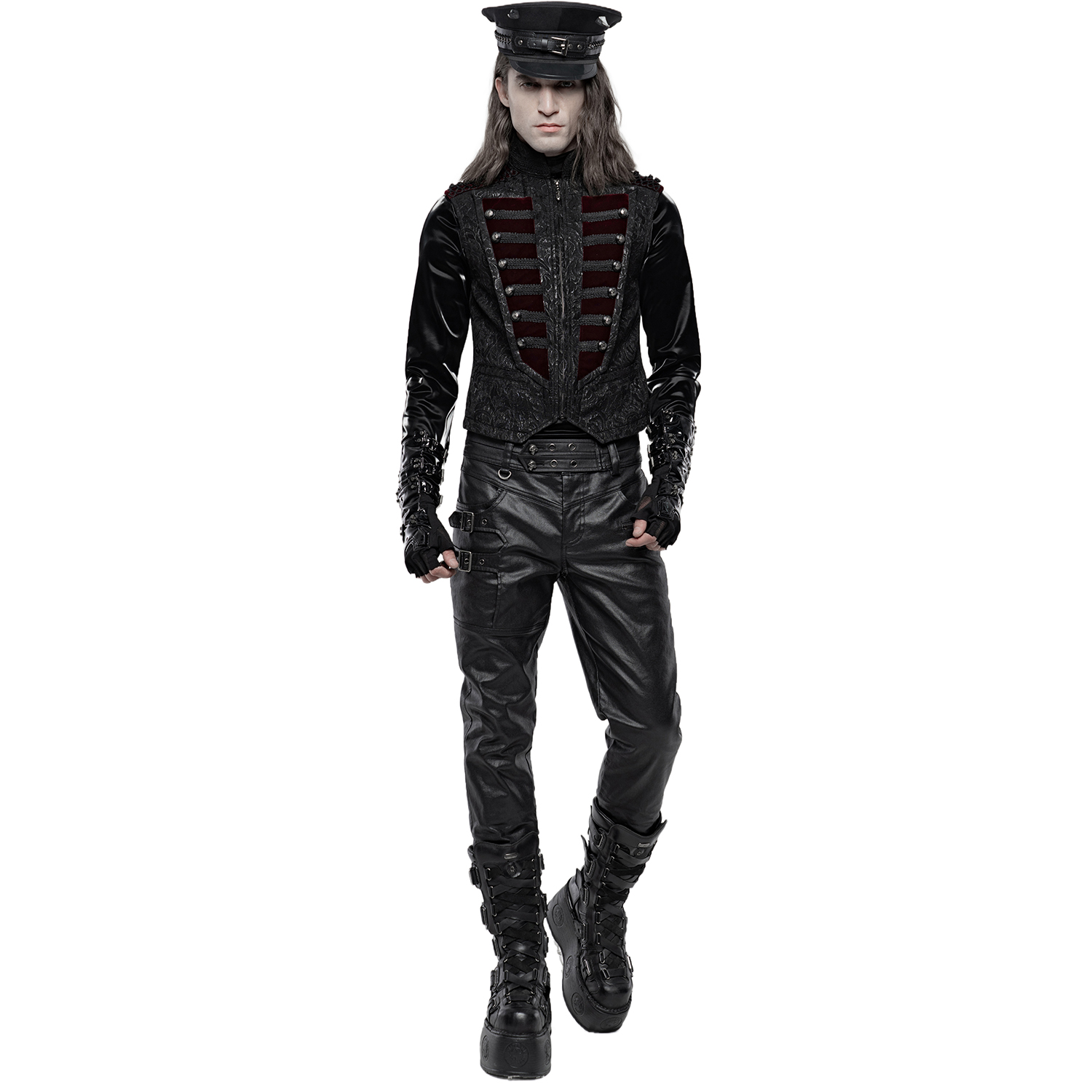 Black gothic men's vest with synthetic leather details and hook fastening at the front. • Synthetic vegetable leather panels on shoulders and pockets • Silver hooks closure on the front • Synthetic...