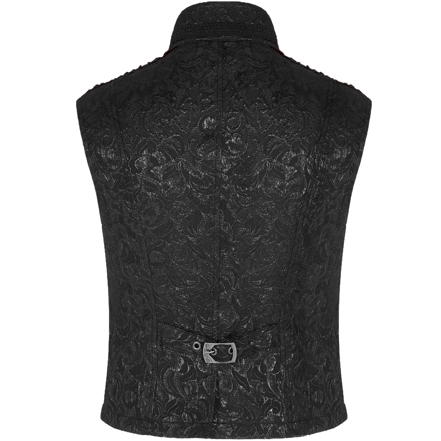 Victorian gothic waistcoat in black jacquard • Pattern has 3D effect • Cross cut on the front • Eight hand sewn buttons • Decorative chain on a strip of lace • Two patch pockets • Adjustable buckle...