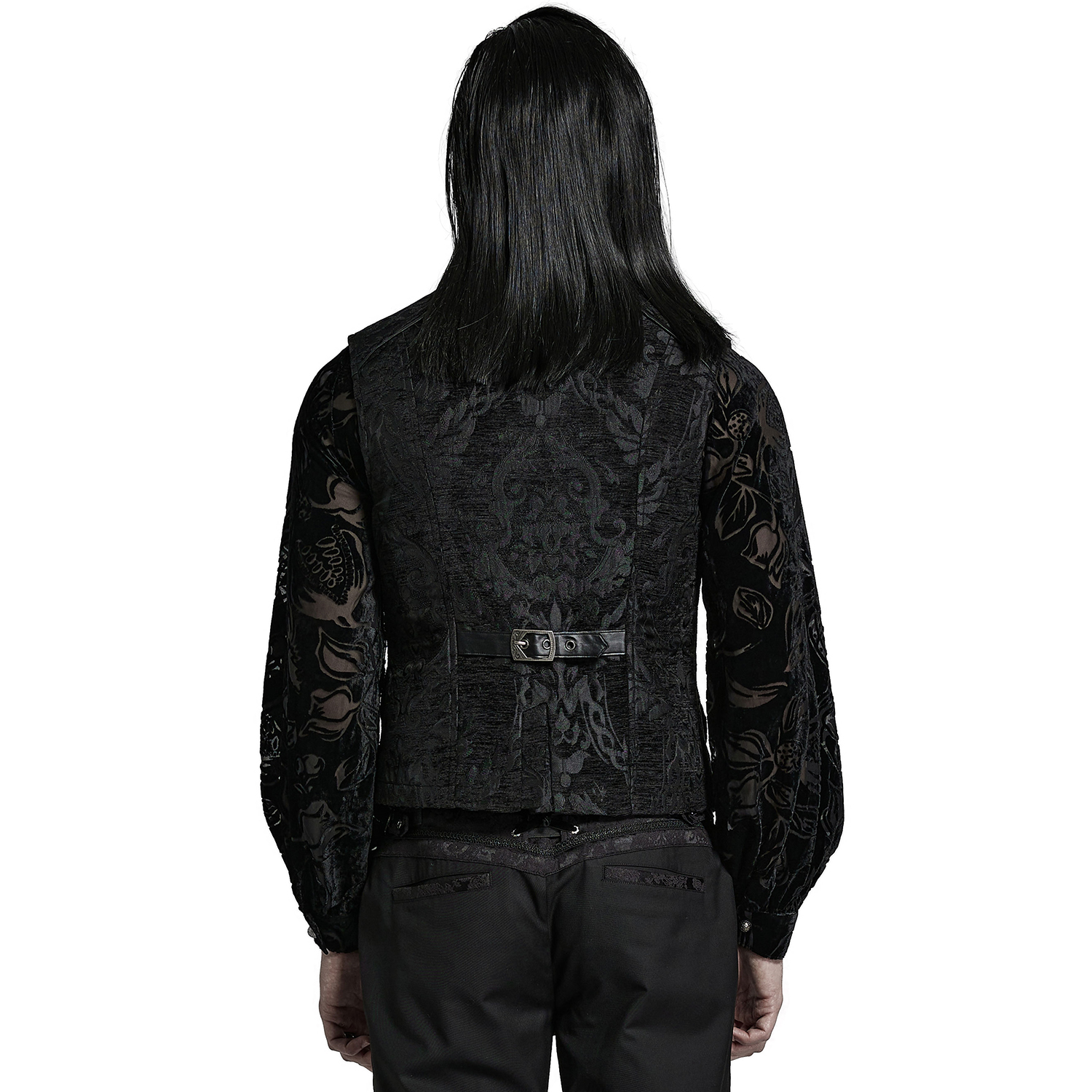 Gothic Victorian style men's black-grey damask vest decorated with satin ribbon ornament straps on the front closure and black embossed buttons. • Eyeleted back strap with silver embossed buckle. •...