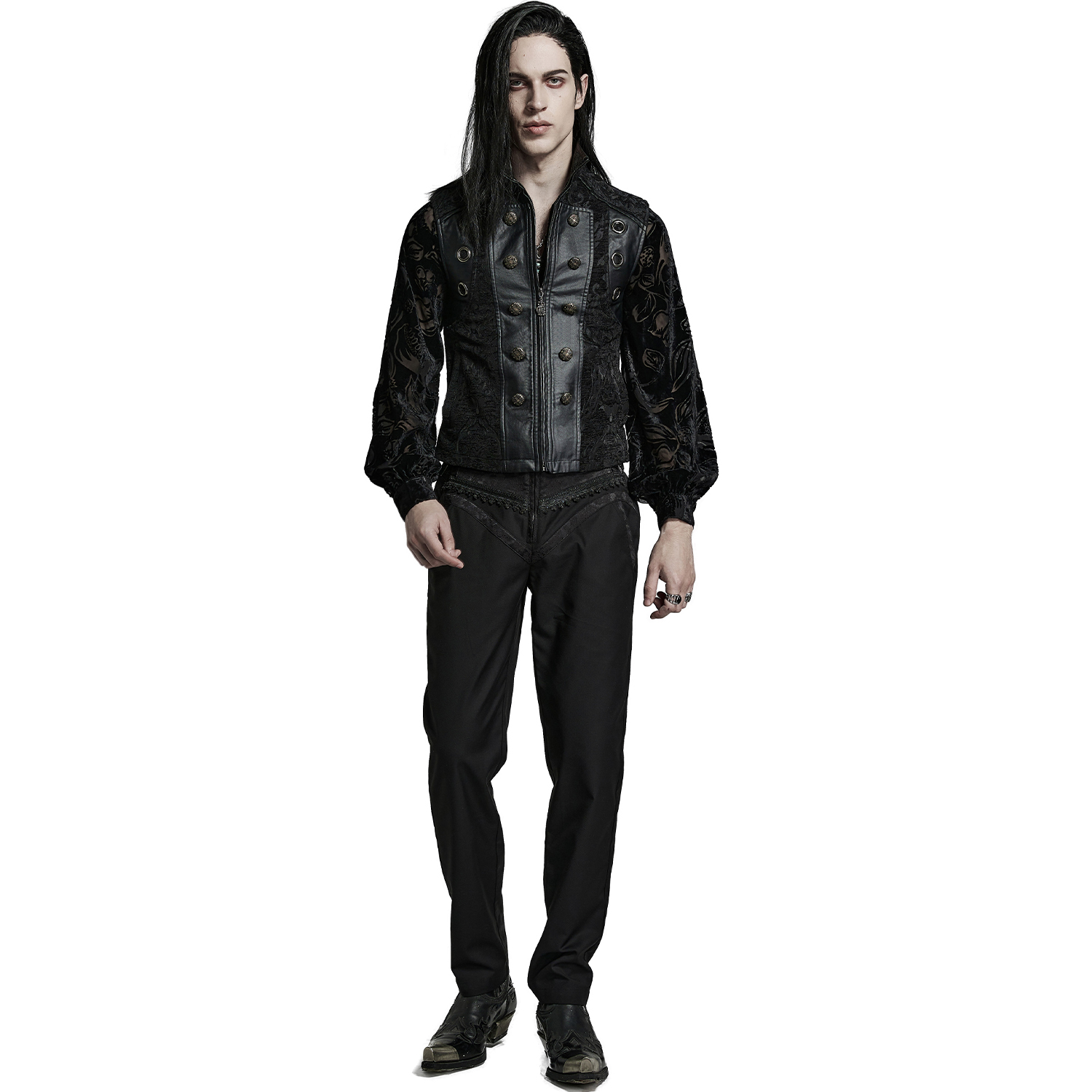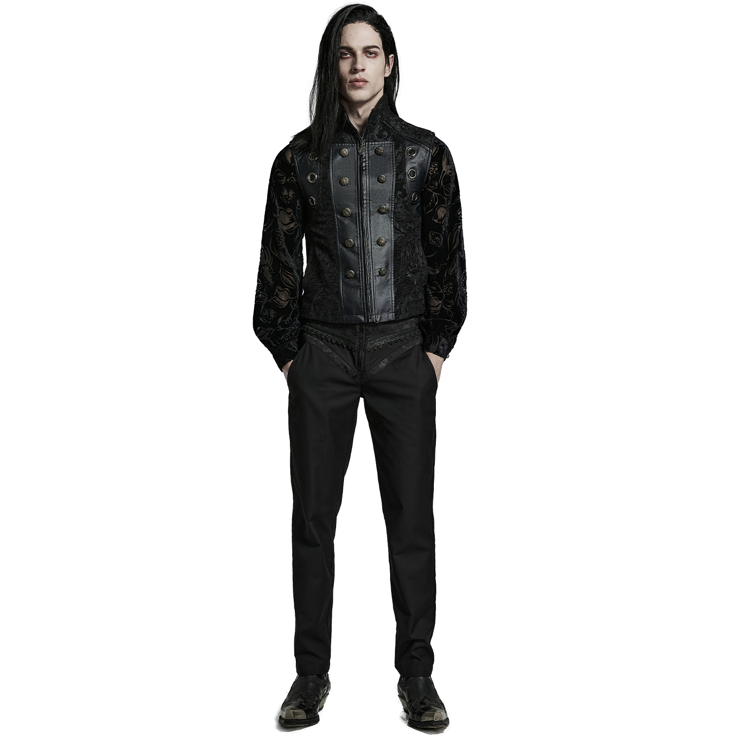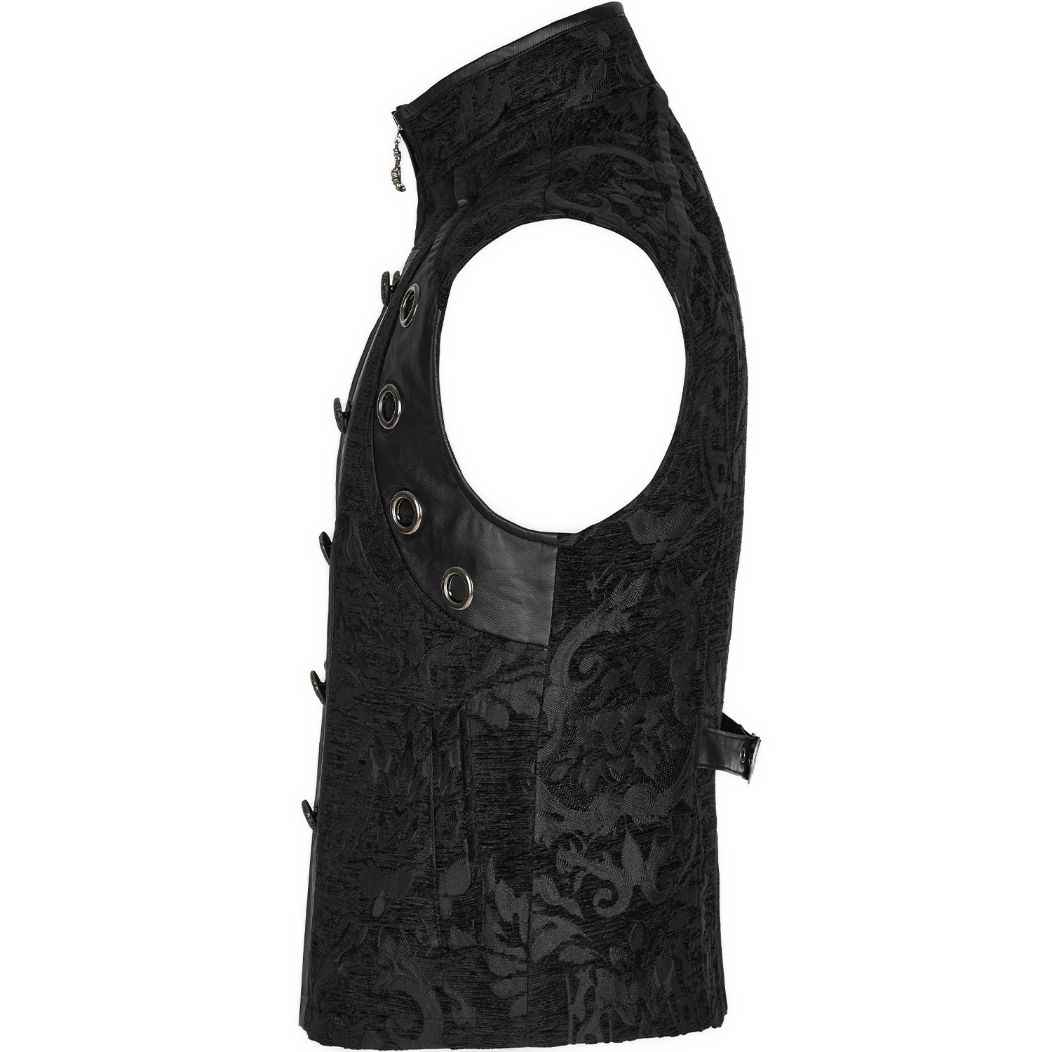 Black gothic men's vest with synthetic leather details and hook fastening at the front. • Synthetic vegetable leather panels on shoulders and pockets • Silver hooks closure on the front • Synthetic...