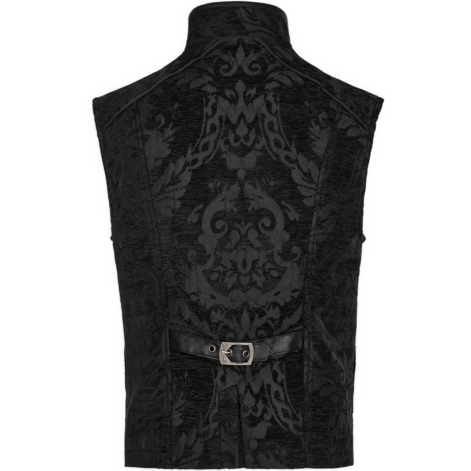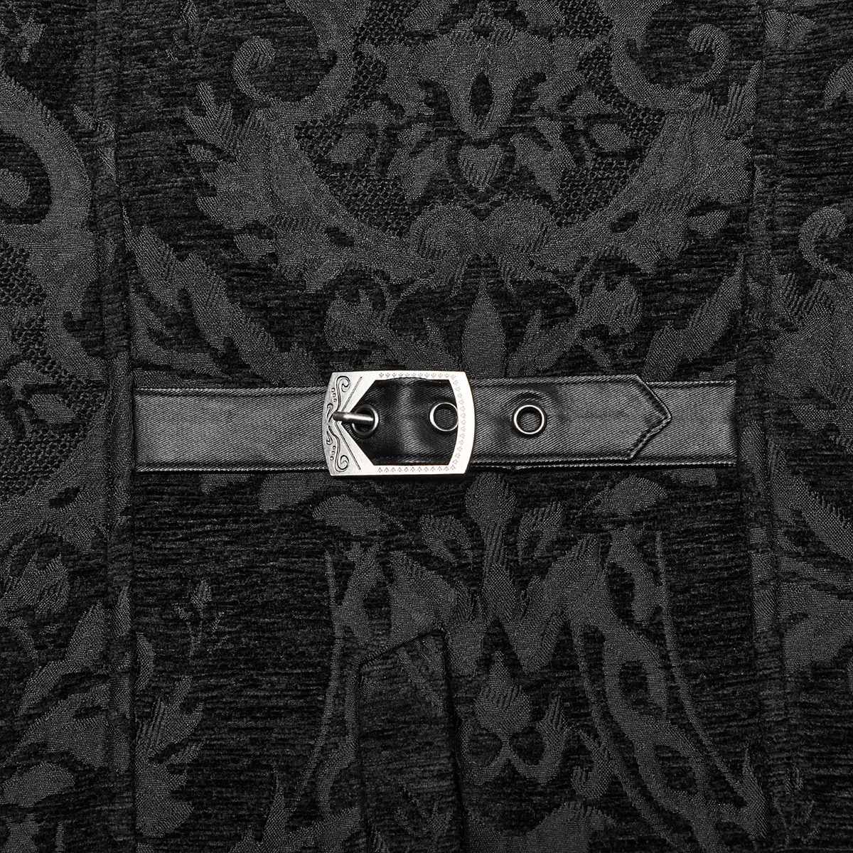 Victorian gothic waistcoat in black jacquard • Pattern has 3D effect • Cross cut on the front • Eight hand sewn buttons • Decorative chain on a strip of lace • Two patch pockets • Adjustable buckle...