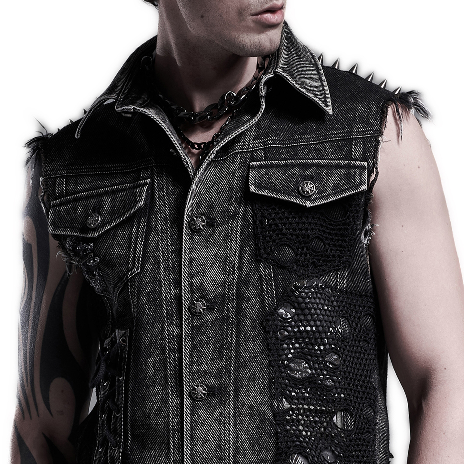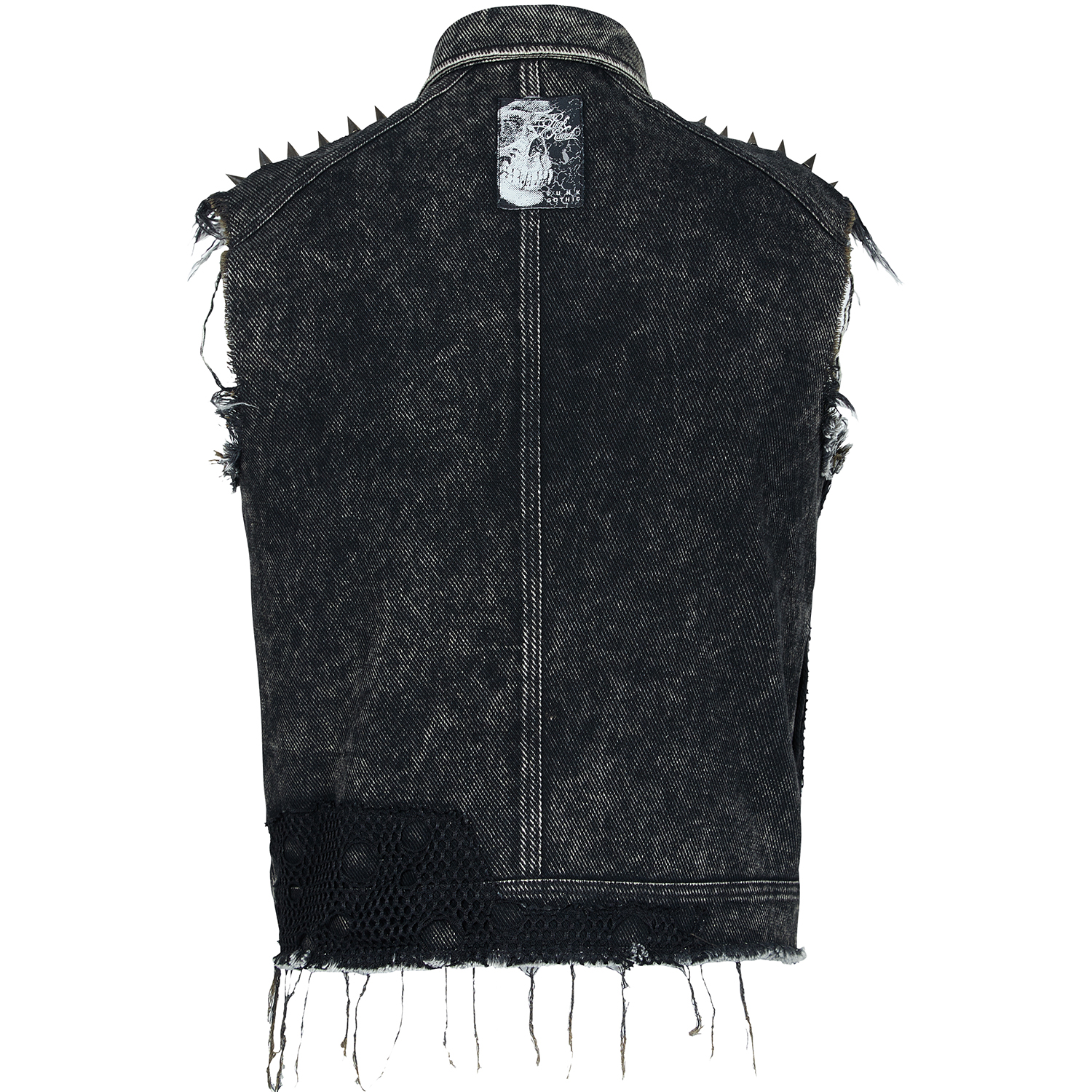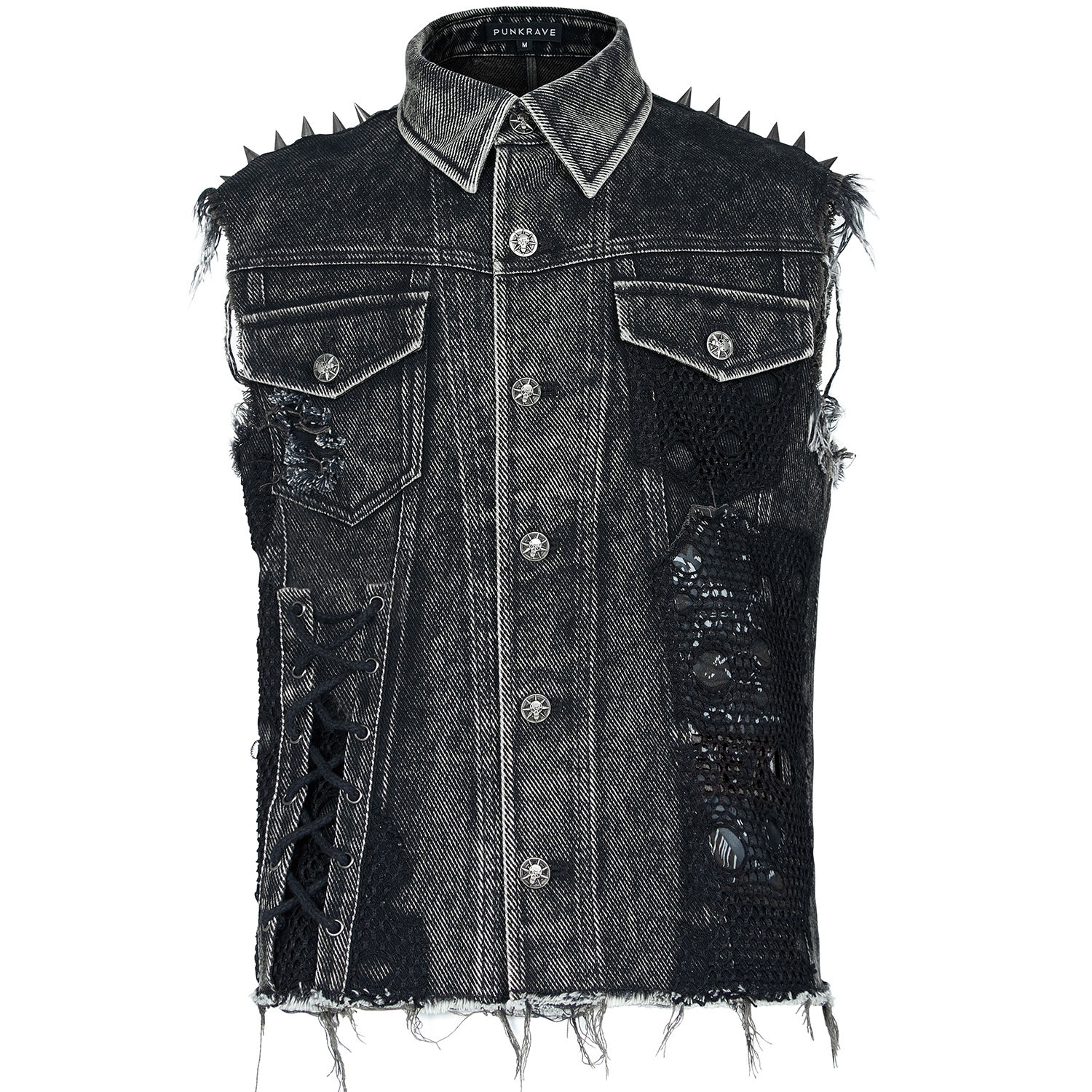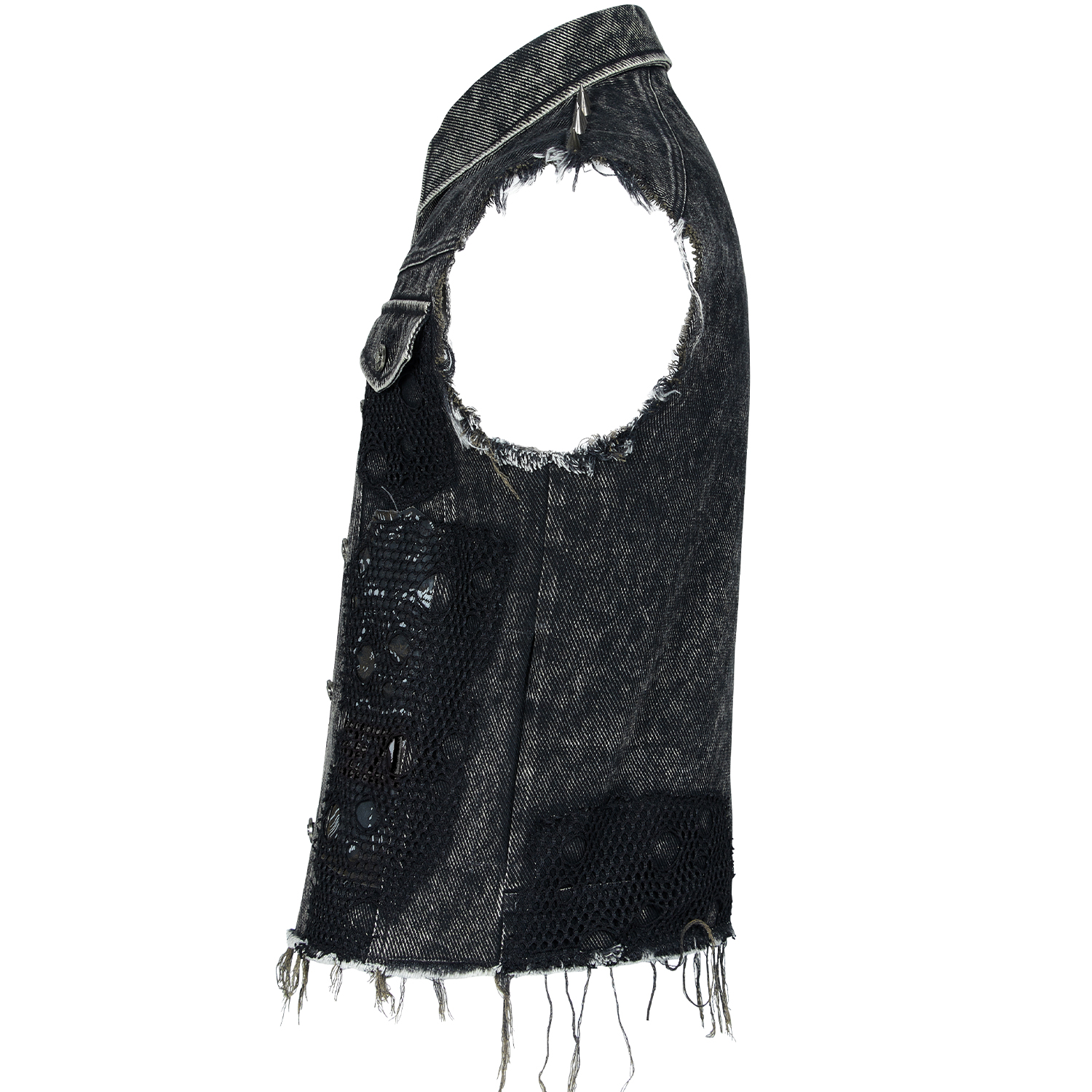 • Distressed denim twill • Three faux leather straps with eyelets, D-rings and studs on both shoulders • Random mesh panels on pockets and armhole • Skull rivets on both pockets • Snap button...