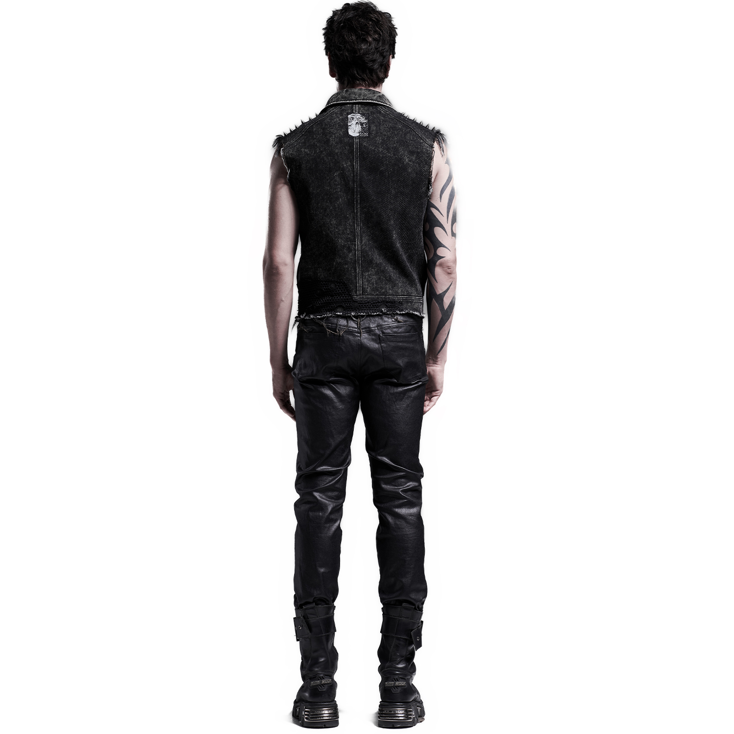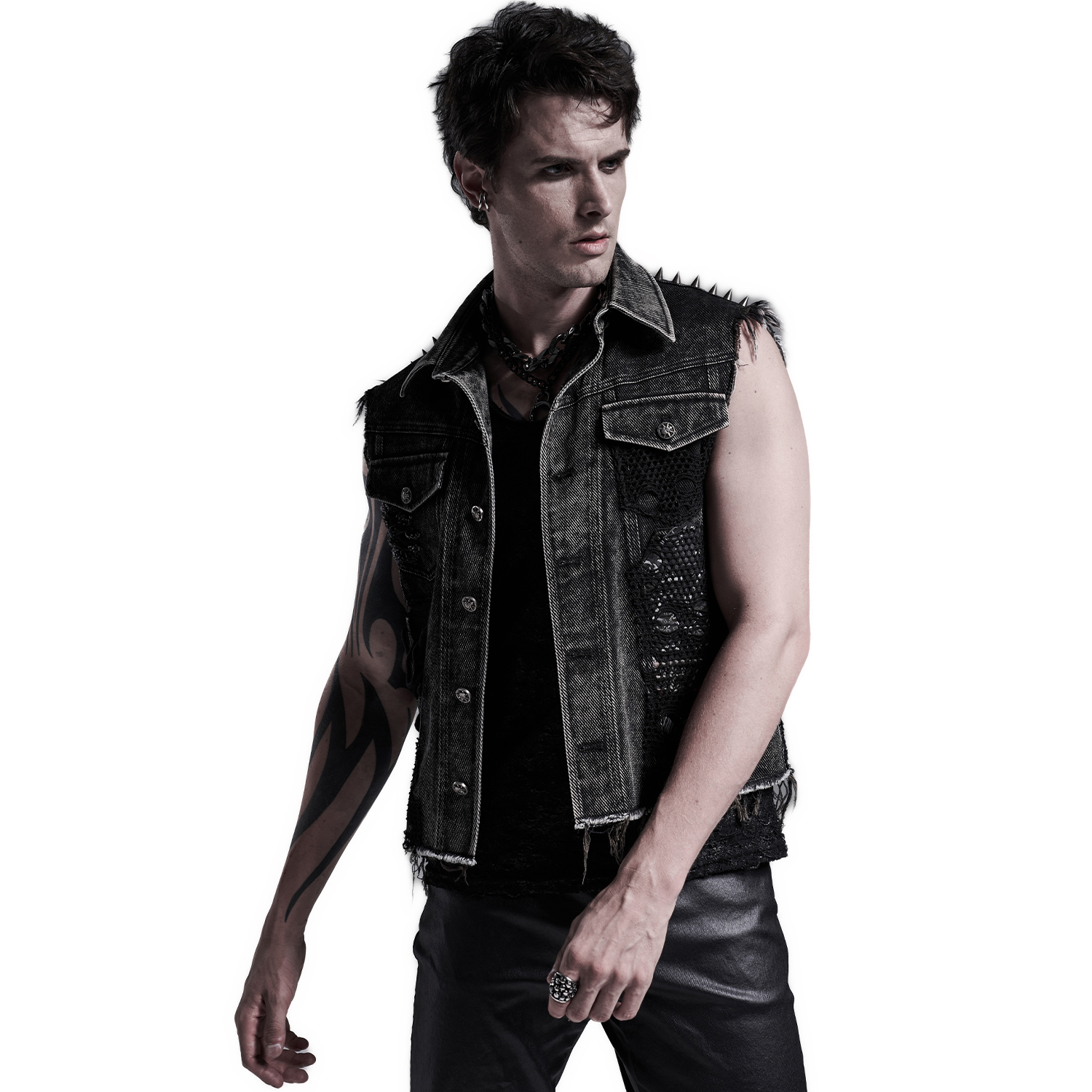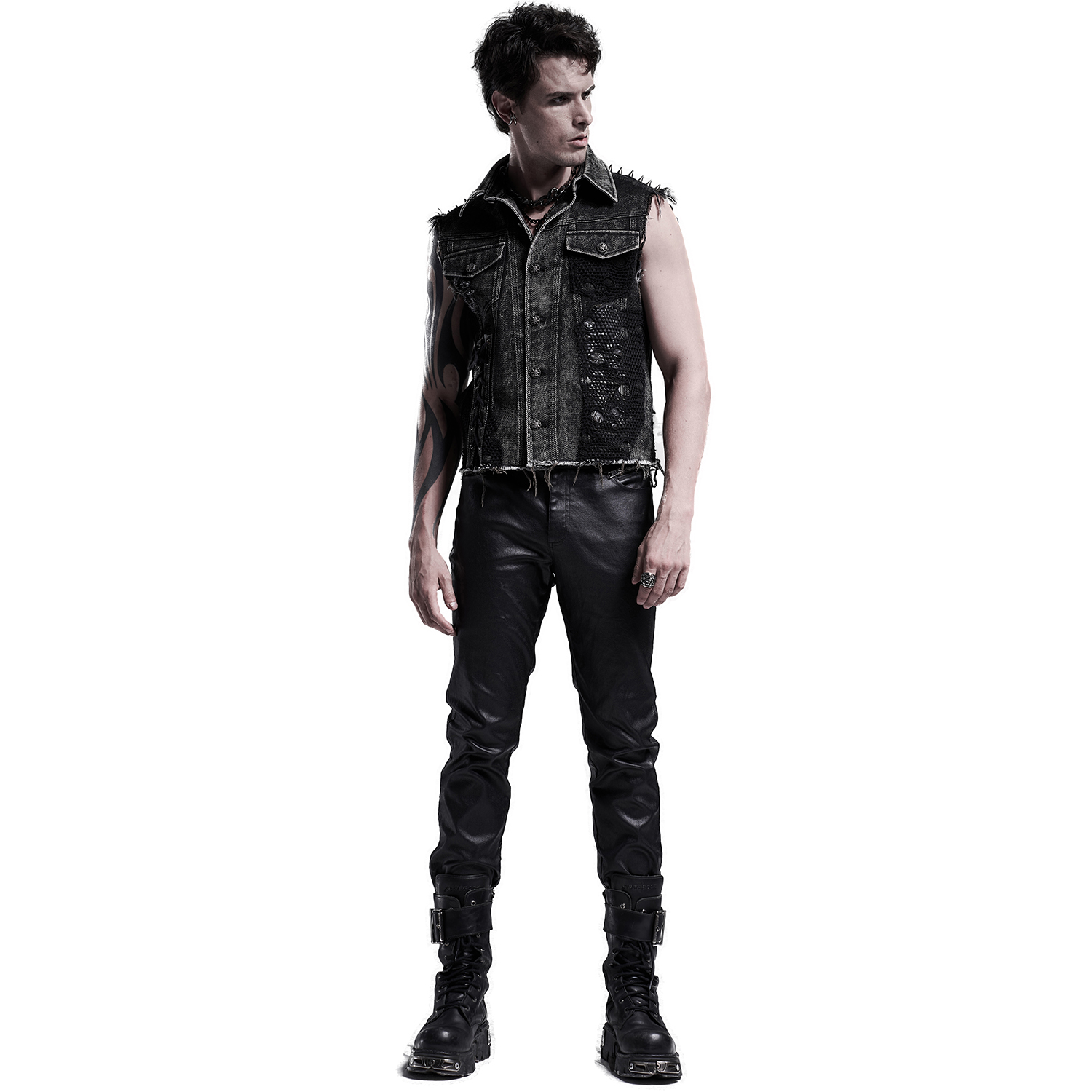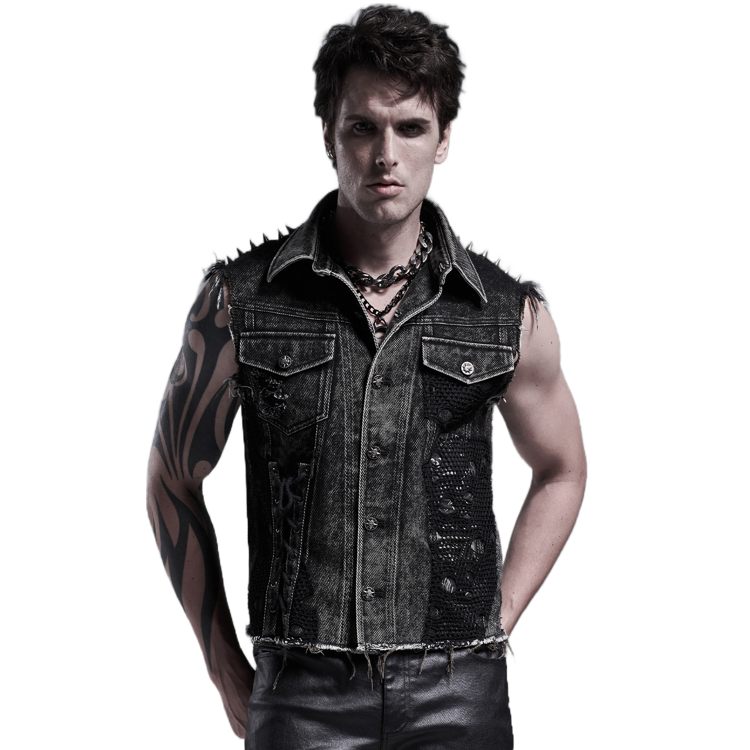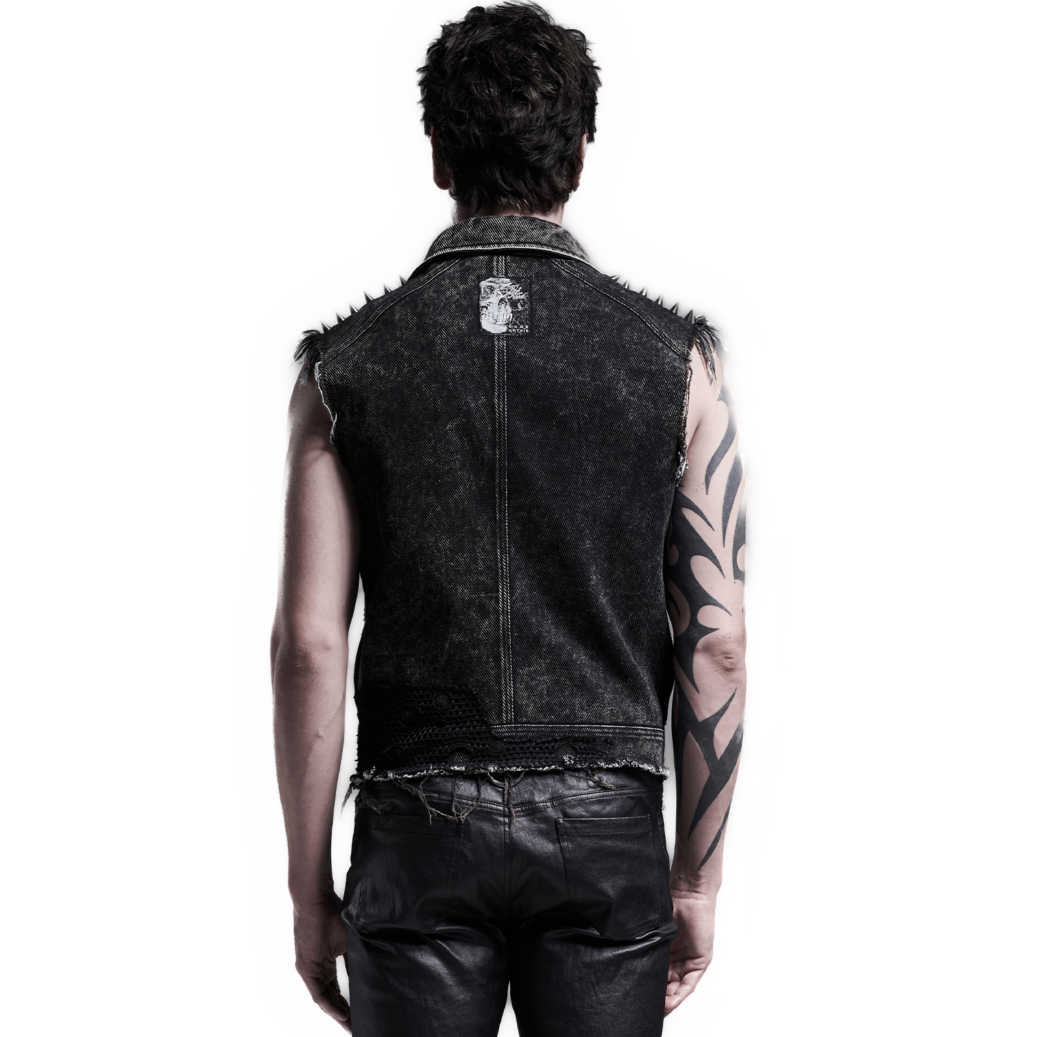 • Distressed denim twill • Three faux leather straps with eyelets, D-rings and studs on both shoulders • Random mesh panels on pockets and armhole • Skull rivets on both pockets • Snap button...
