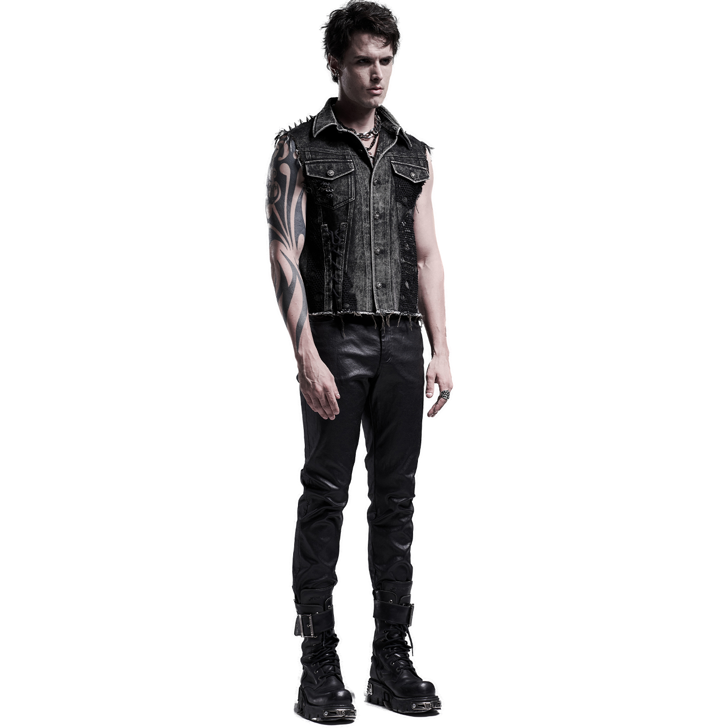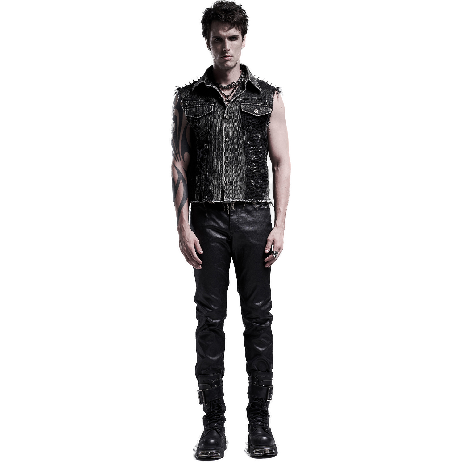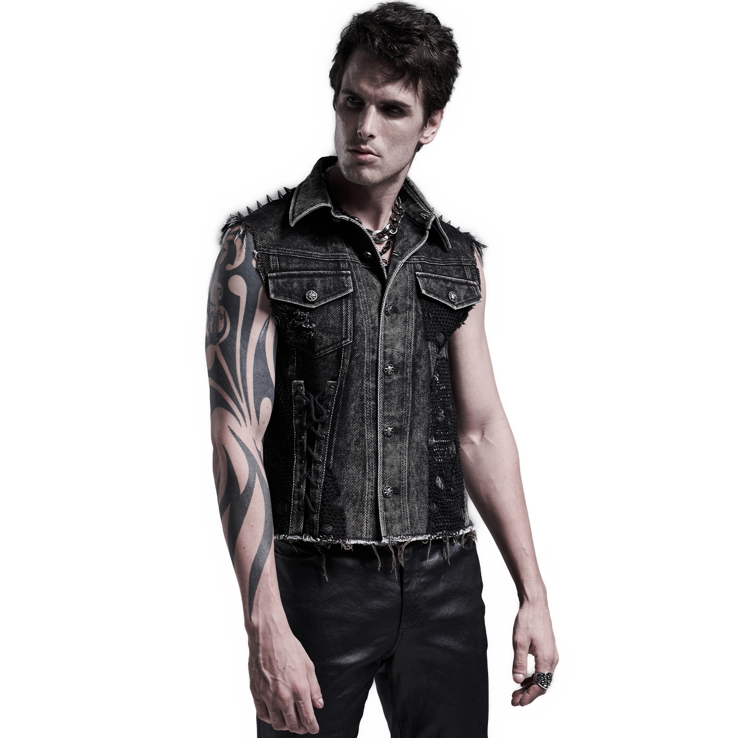 Gothic Post-Apocalyptic style Fetish fashion inspired men's black vest with bondage-style strap front and synthetic vegan leather details • Synthetic vegan leather details with lacing and silver...