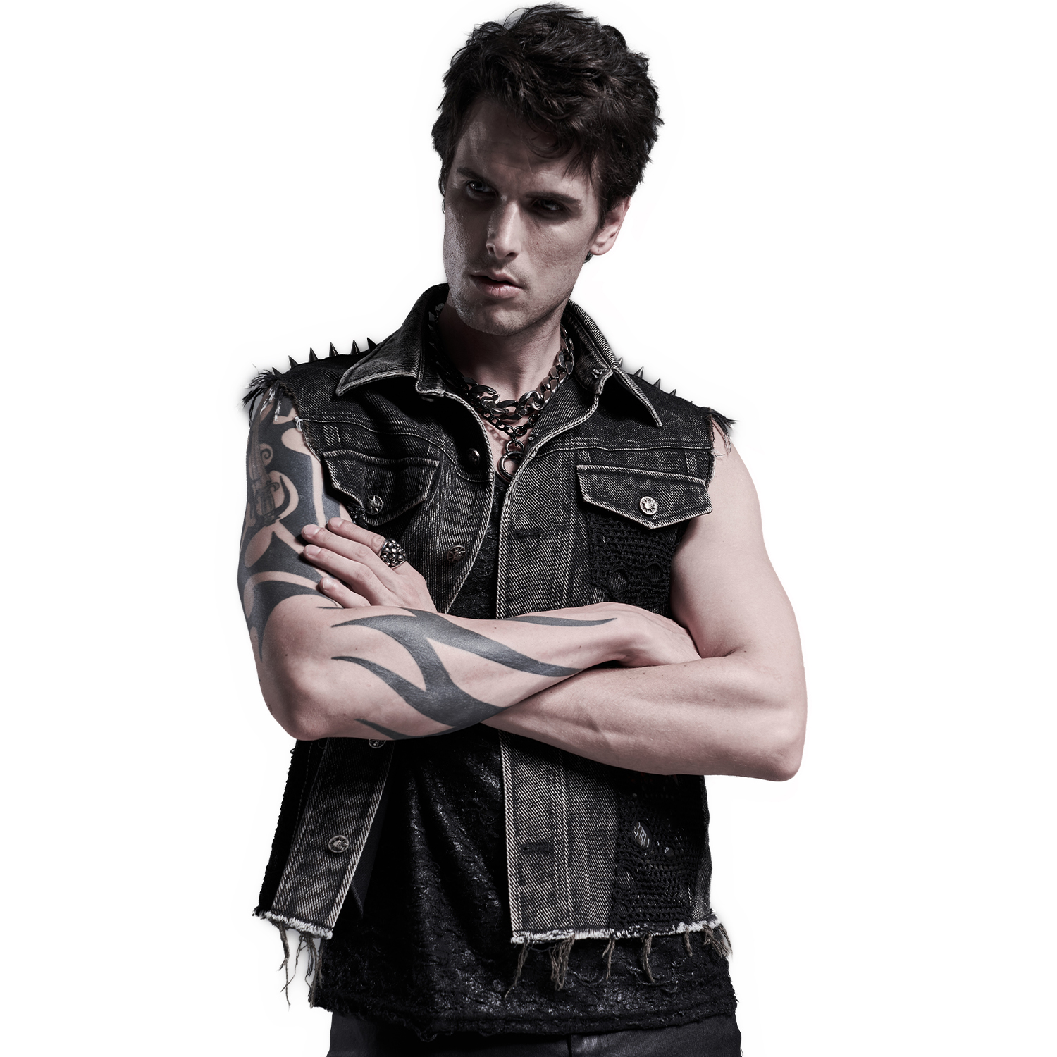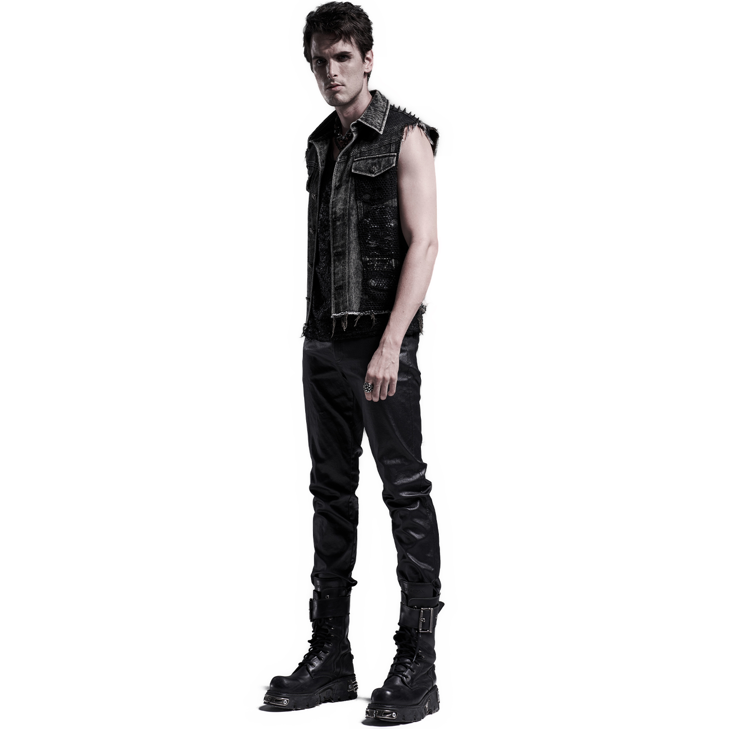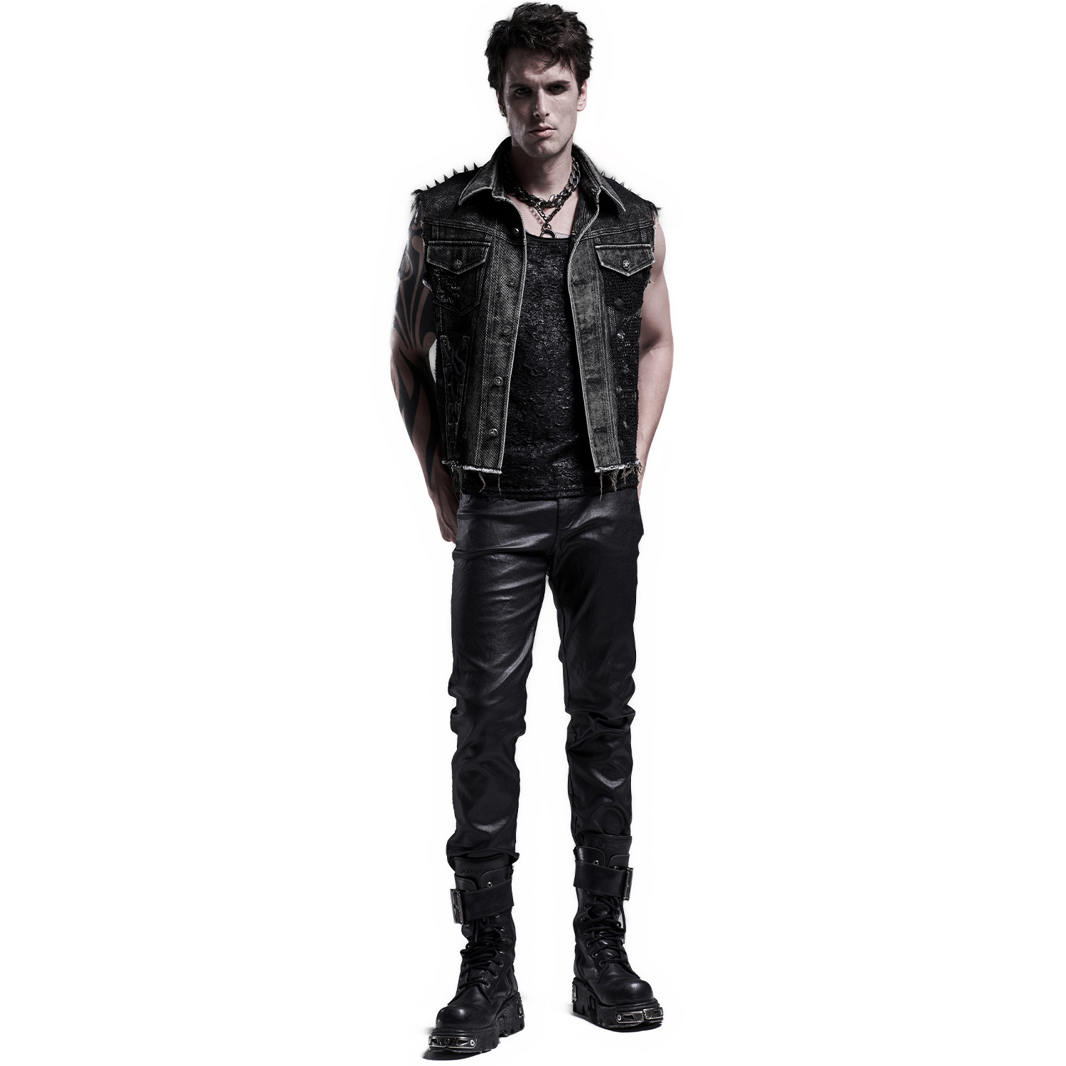 Gothic Post-Apocalyptic style Fetish fashion inspired men's black vest with bondage-style strap front and synthetic vegan leather details • Synthetic vegan leather details with lacing and silver...