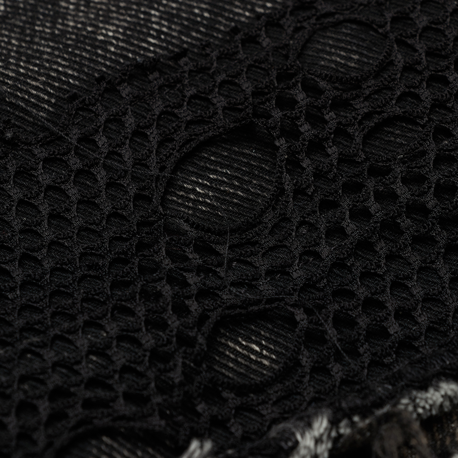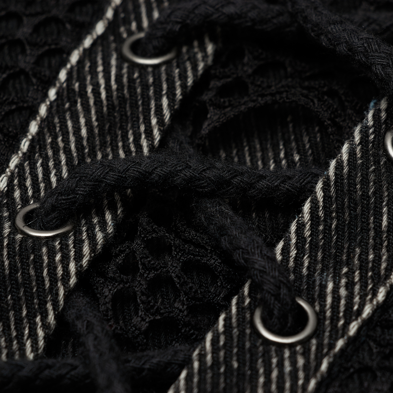 • Sergé doux et confortable à porter recouvert de maille aléatoirement perforée • Col effiloché avec des clous à droite et des anneaux à gauche • Clous et anneaux en D sur le devant • Ourlet...