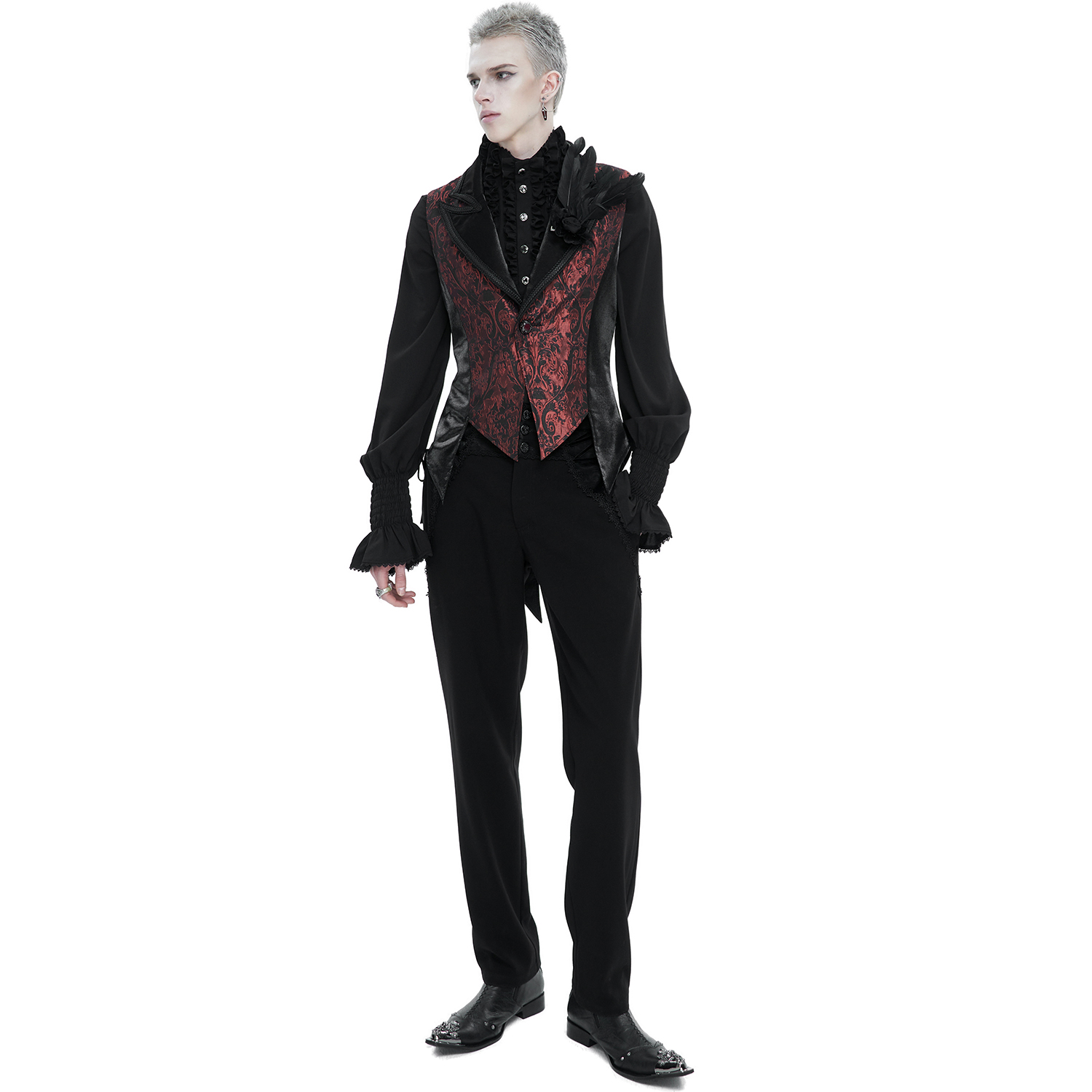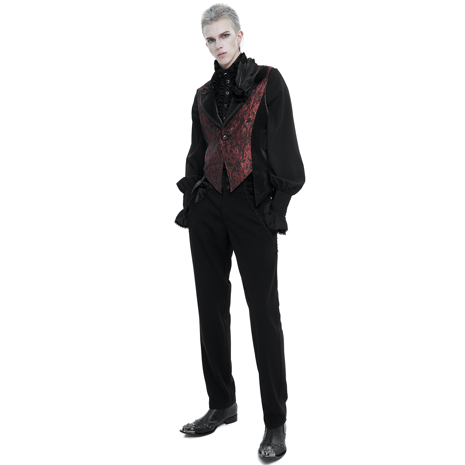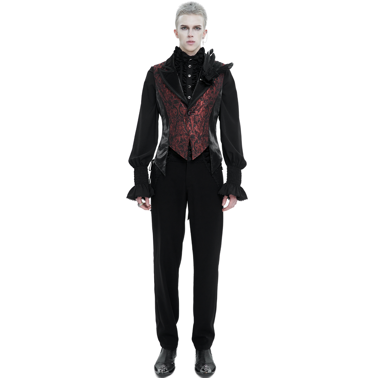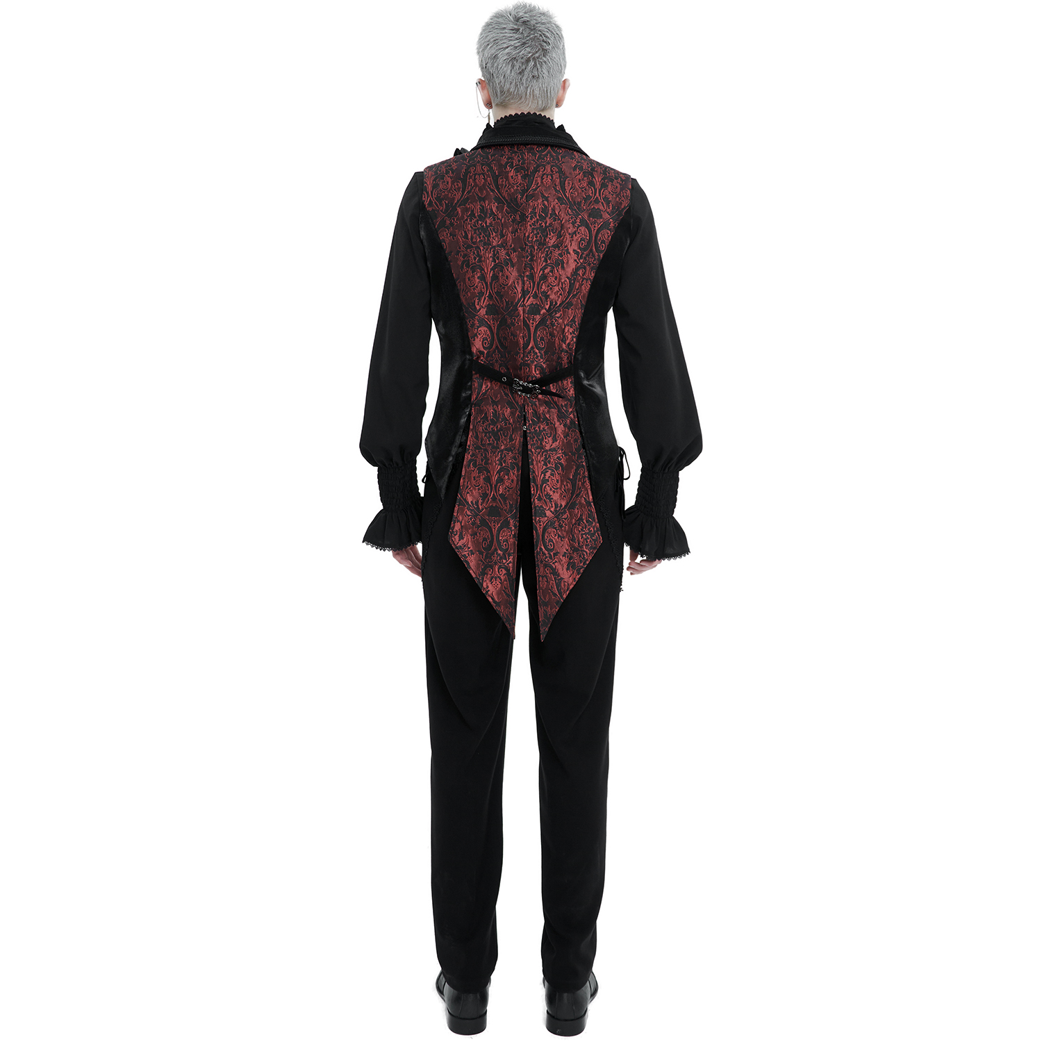 Victorian gothic waistcoat in red jacquard • Pattern has 3D effect • Cross cut on the front • Eight hand sewn buttons • Decorative chain on a strip of lace • Two patch pockets • Adjustable buckle...