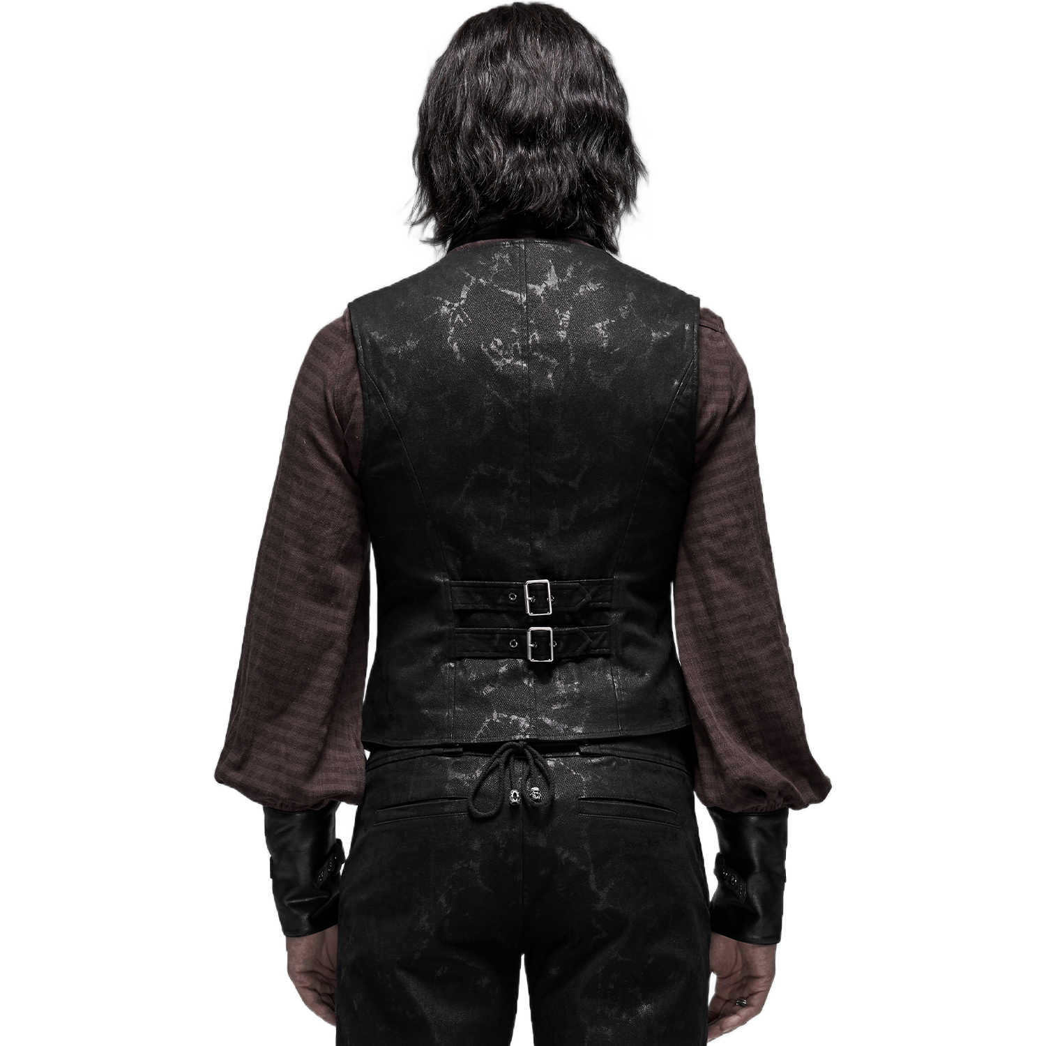 Gothic Victorian style men's black-grey damask vest decorated with satin ribbon ornament straps on the front closure and black embossed buttons. • Eyeleted back strap with silver embossed buckle. •...