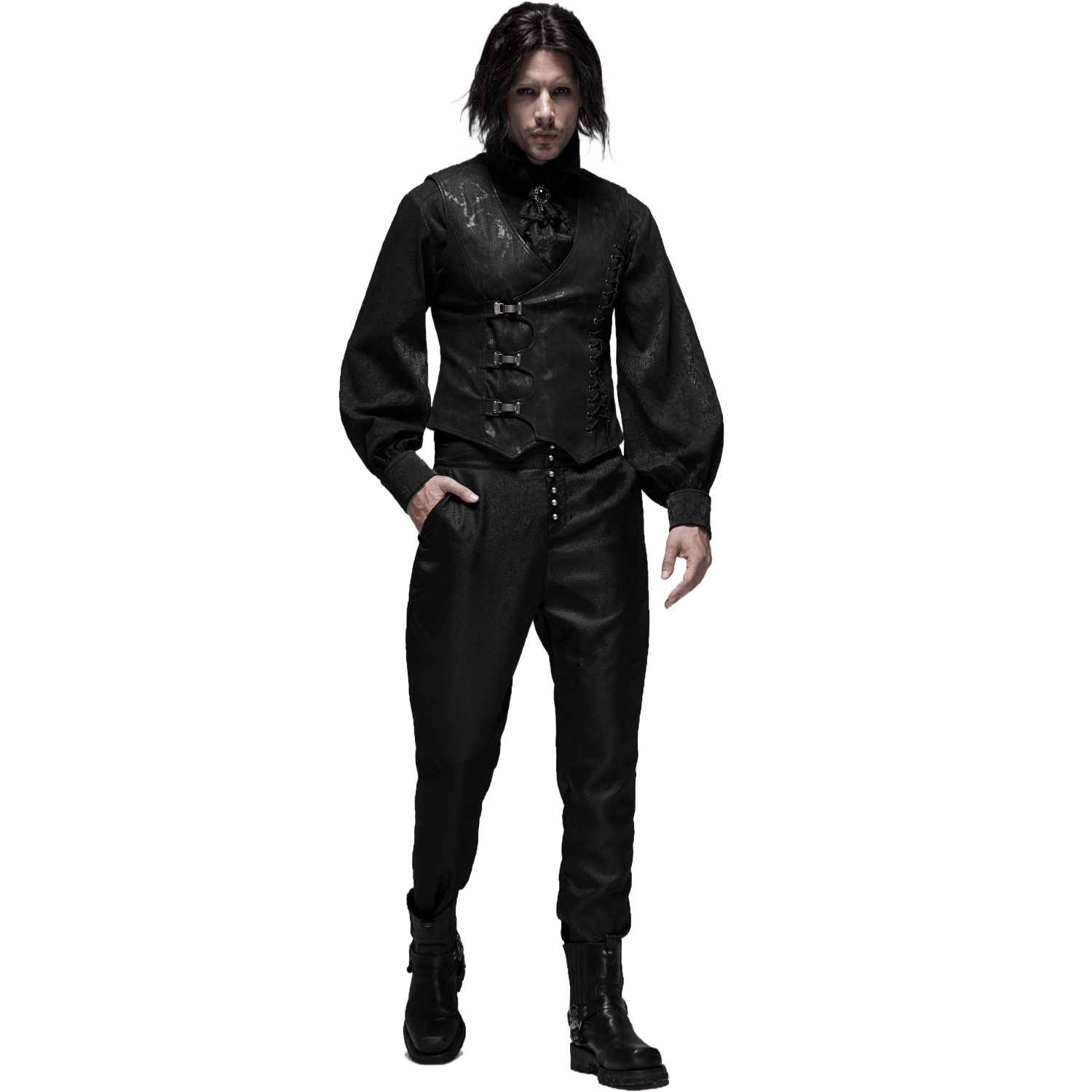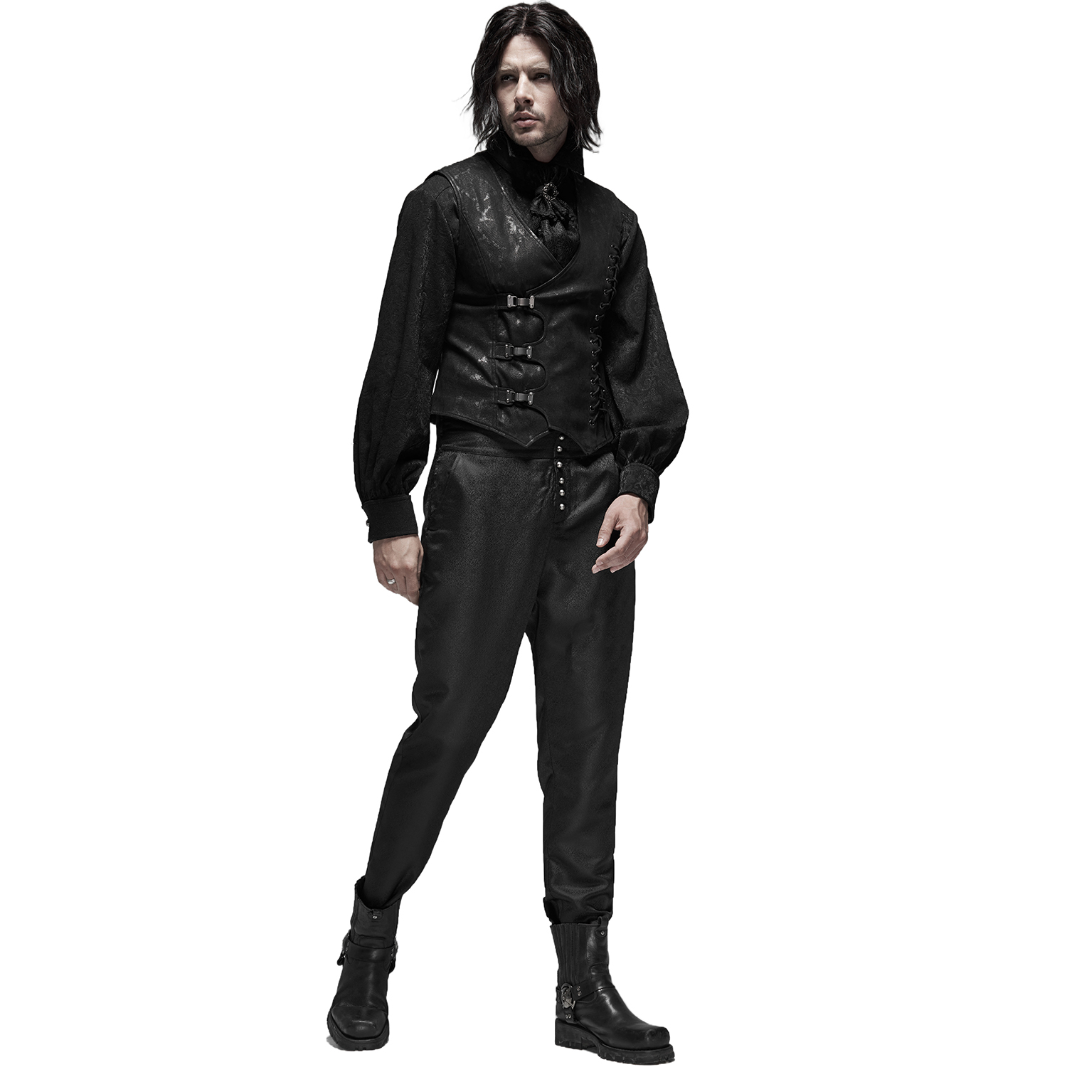 Victorian gothic waistcoat in black jacquard • Pattern has 3D effect • Cross cut on the front • Eight hand sewn buttons • Decorative chain on a strip of lace • Two patch pockets • Adjustable buckle...