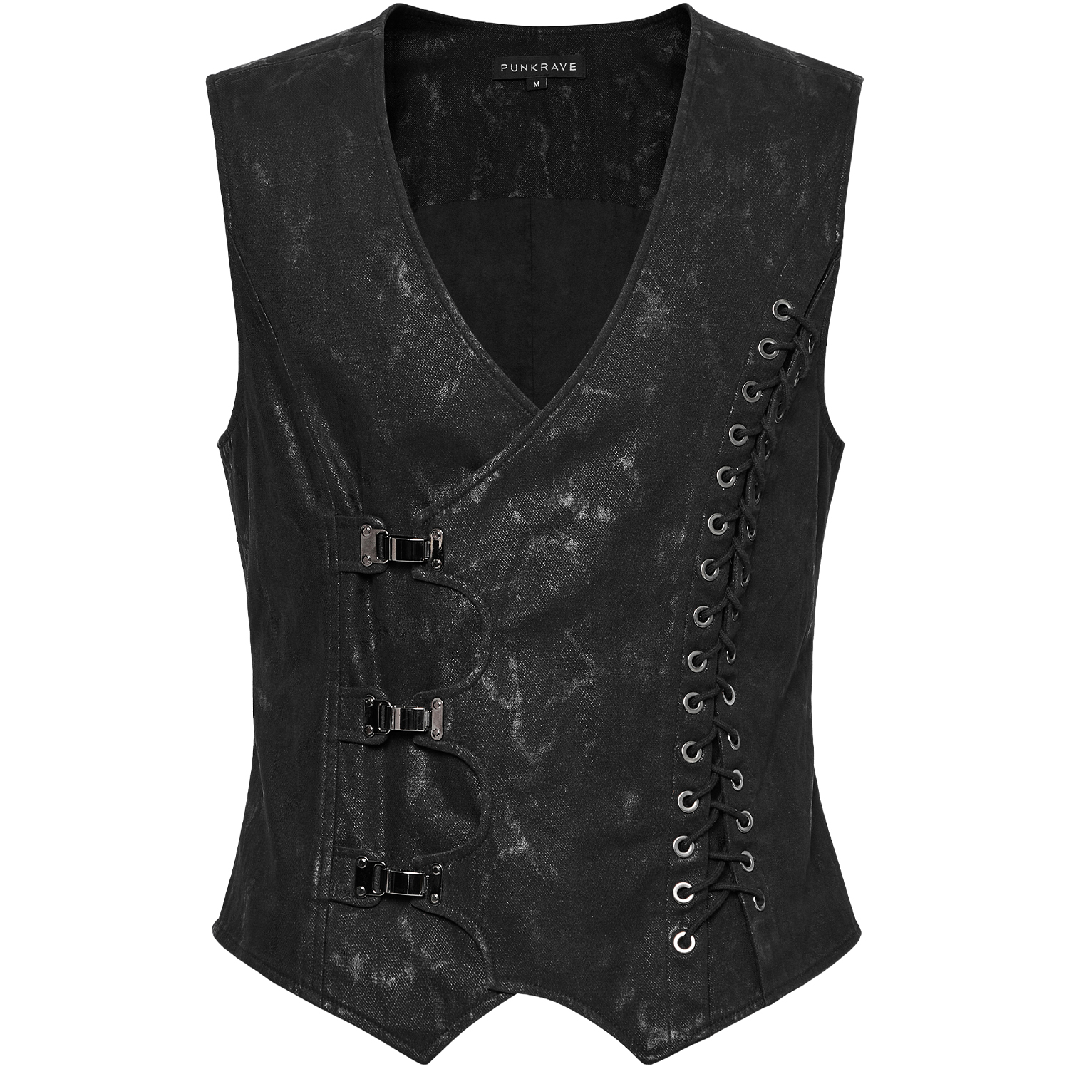 Gothic Post-Apocalyptic style Fetish fashion inspired men's black vest with bondage-style strap front and synthetic vegan leather details • Synthetic vegan leather details with lacing and silver...