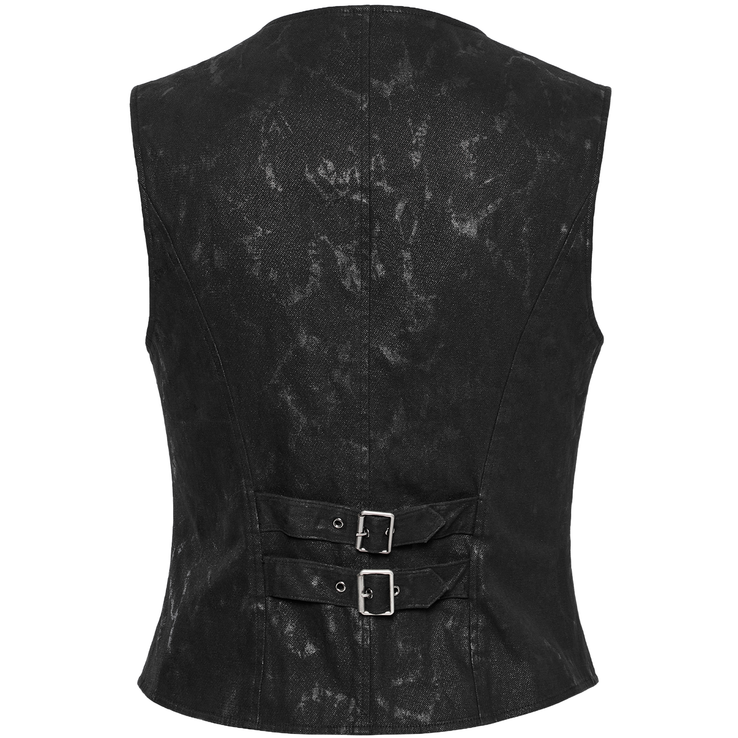 Men's Classic Black Gothic Vest with Cross Closure • Three oblique buttons covered with fabric • Fabric with floral pattern and fine stripes • Two pockets • Strap and buckle on the back for a...