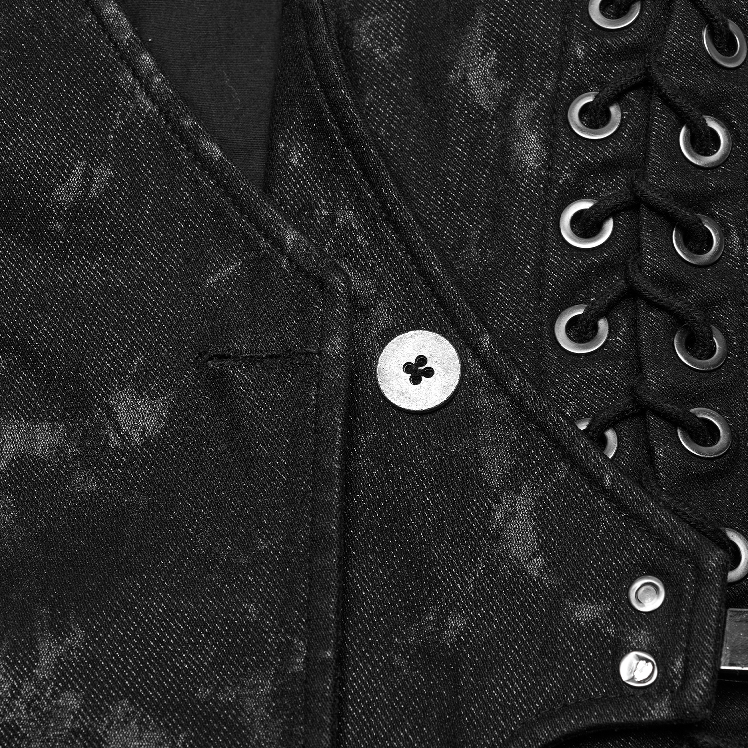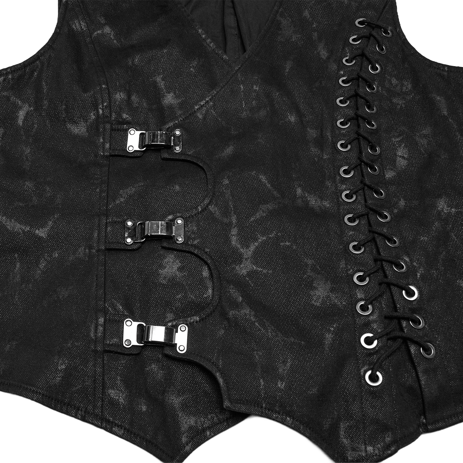 Black gothic men's vest with synthetic leather details and hook fastening at the front. • Synthetic vegetable leather panels on shoulders and pockets • Silver hooks closure on the front • Synthetic...