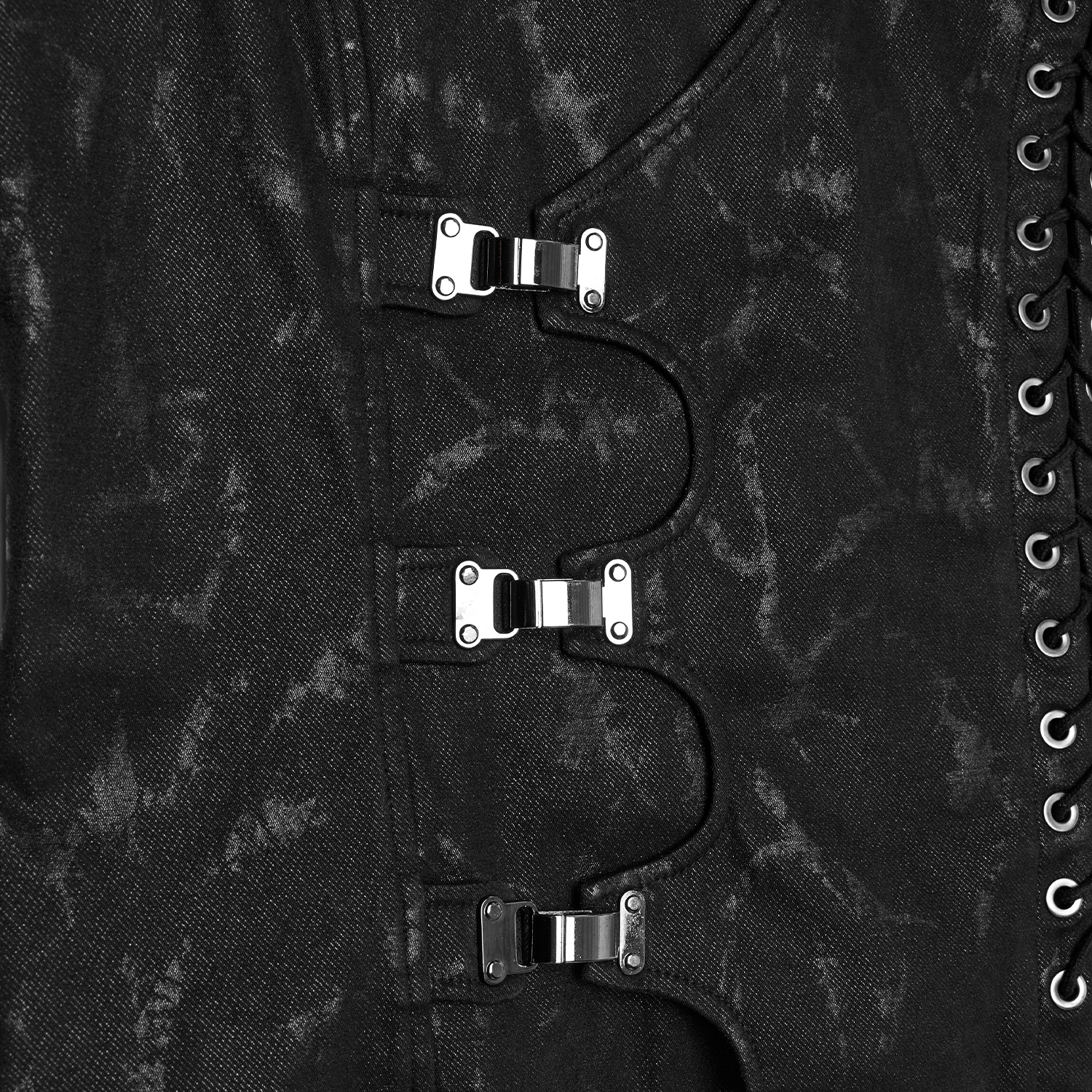 • Unusual sleeveless vest for a unique and refined gothic look • In woven twill, rubberized and mesh • Faux leather with adjustable buckles on the front • Metal rings and lacing on both sides •...