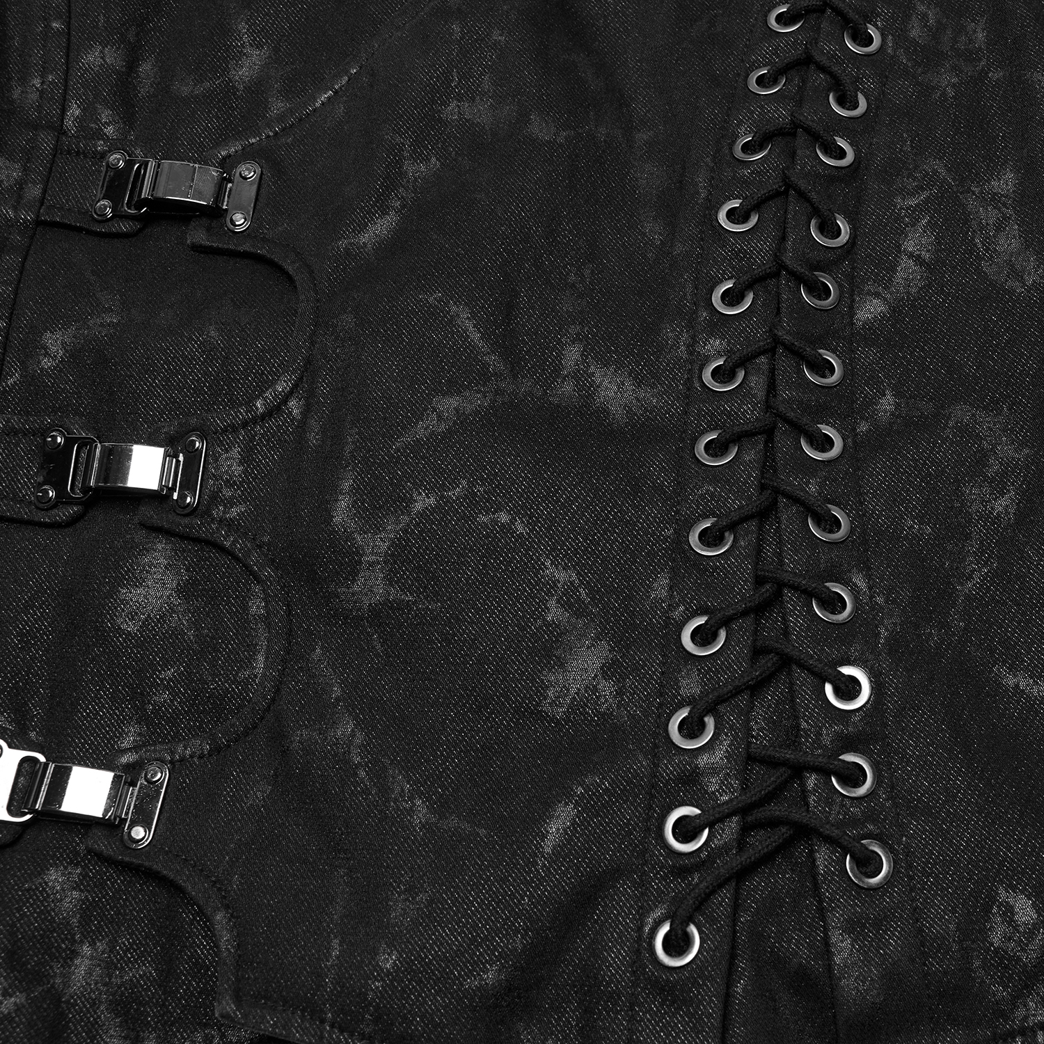 • Distressed denim twill • Three faux leather straps with eyelets, D-rings and studs on both shoulders • Random mesh panels on pockets and armhole • Skull rivets on both pockets • Snap button...