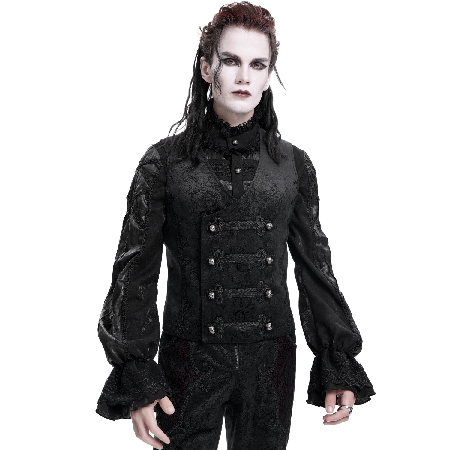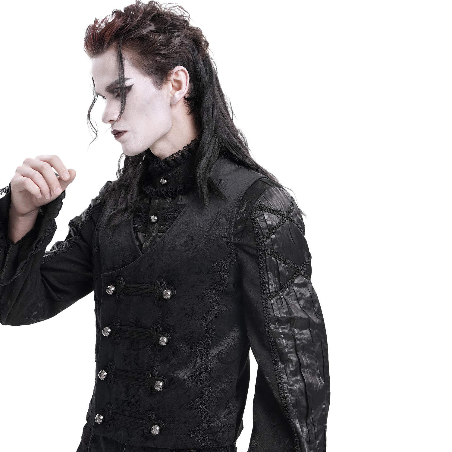 Black gothic men's vest with synthetic leather details and hook fastening at the front. • Synthetic vegetable leather panels on shoulders and pockets • Silver hooks closure on the front • Synthetic...