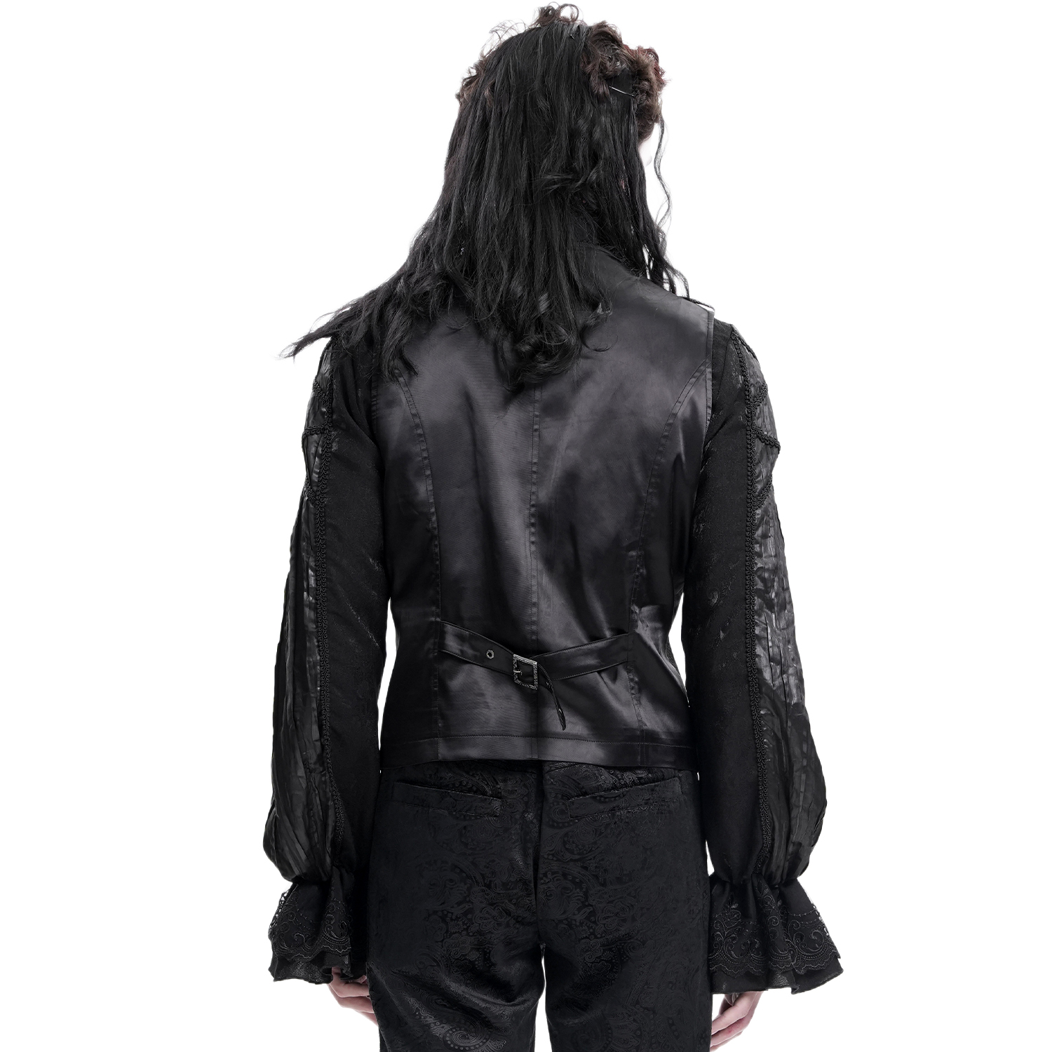 Victorian gothic waistcoat in black jacquard • Pattern has 3D effect • Cross cut on the front • Eight hand sewn buttons • Decorative chain on a strip of lace • Two patch pockets • Adjustable buckle...