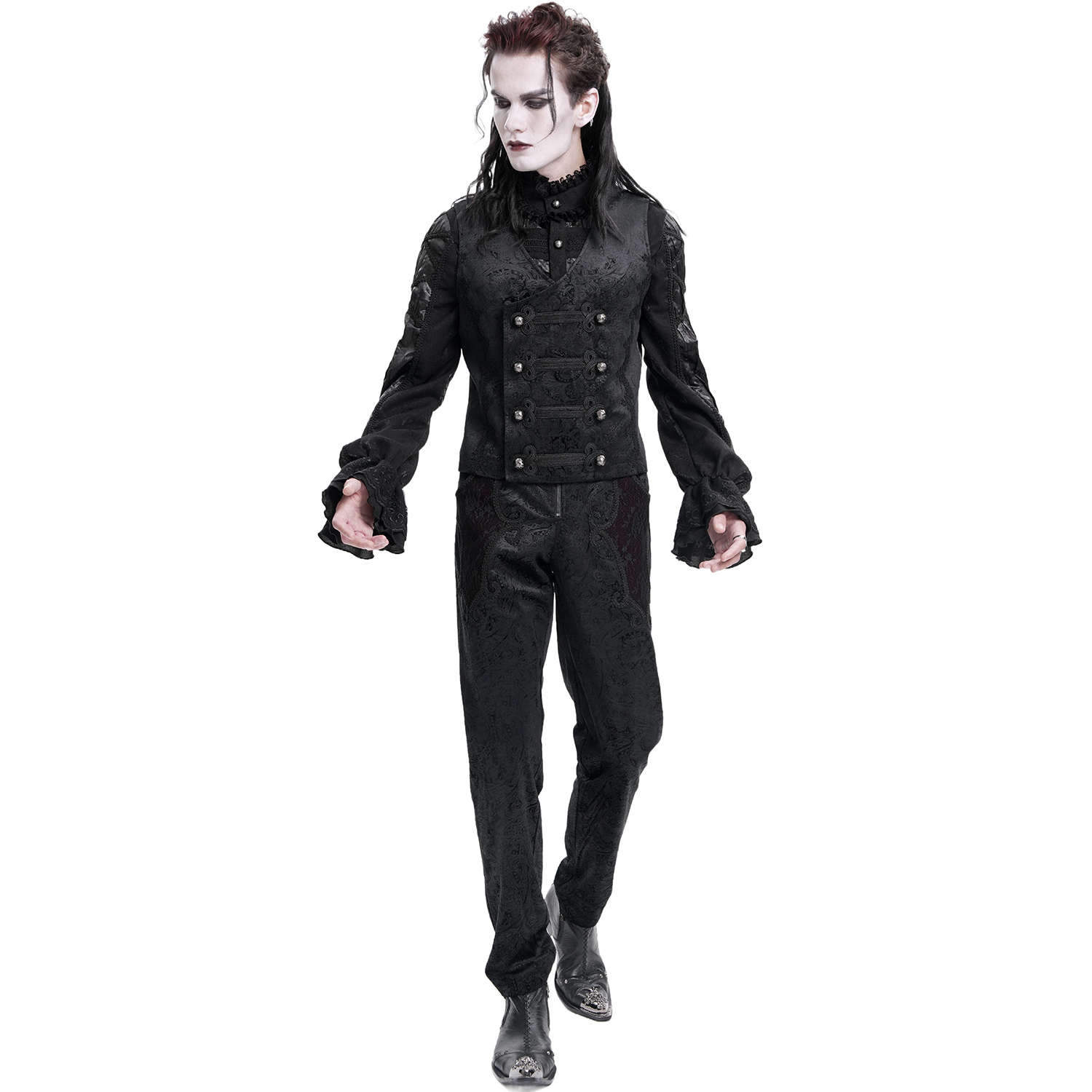 Men's Classic Black Gothic Vest with Cross Closure • Three oblique buttons covered with fabric • Fabric with floral pattern and fine stripes • Two pockets • Strap and buckle on the back for a...