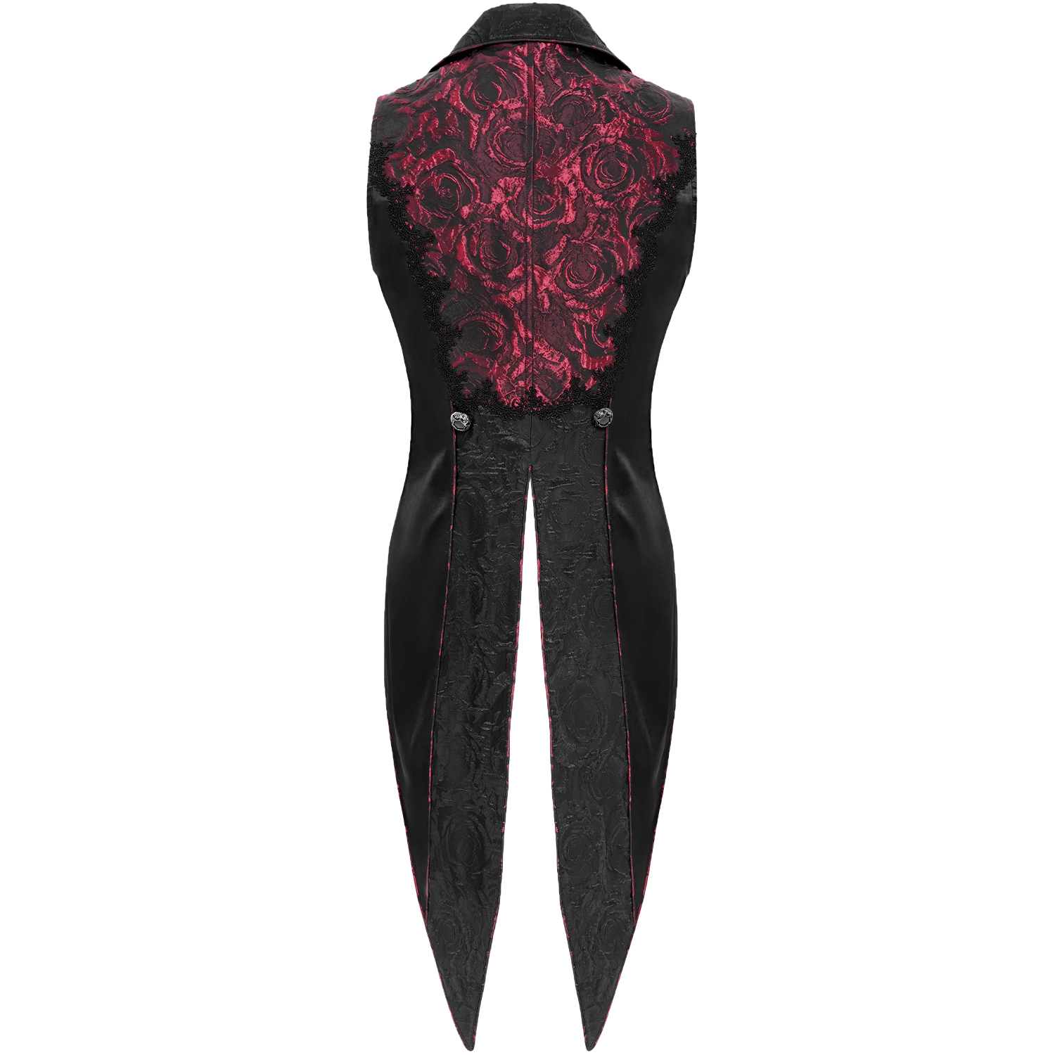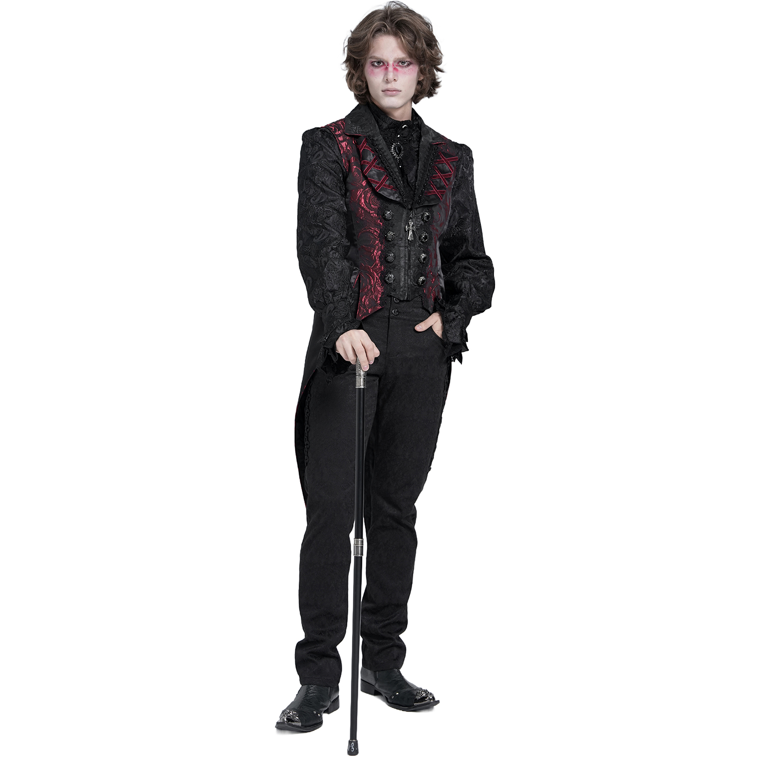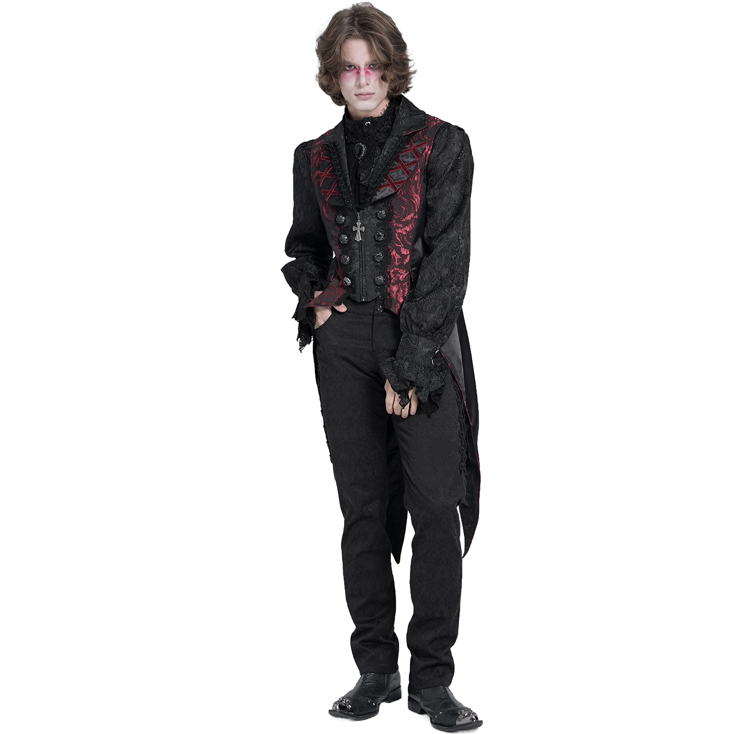 Gothic Victorian style male's dark red damask vest decorated with satin ribbon ornament straps on the front closure and black embossed buttons. • Eyelet back strap with silver embossed buckle. •...