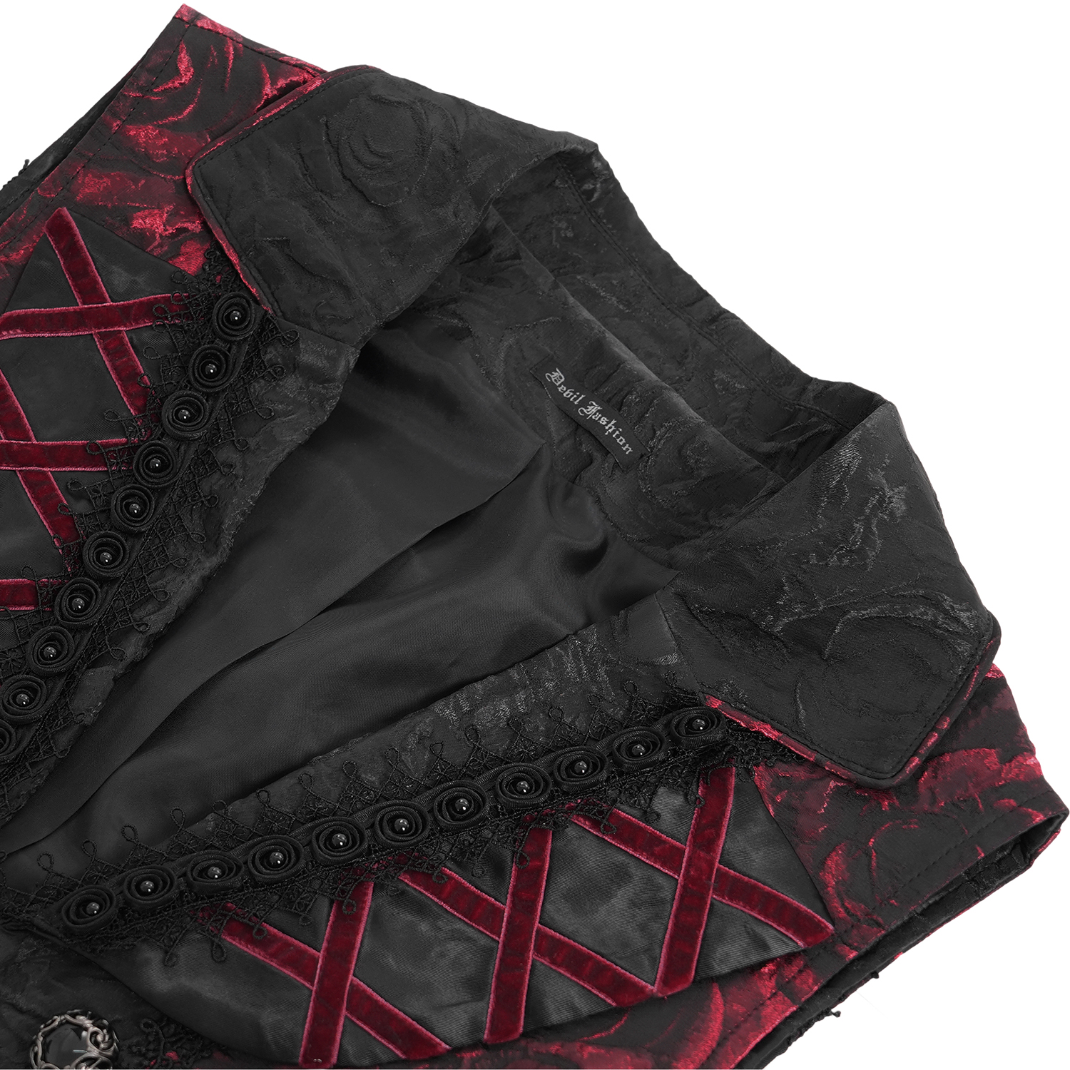 Black brocade jacquard and burgundy velvet victorian waistcoat • Embroidered high collar • Front zipper with molded pull tab • Horizontal burgundy velvet bands and raised buttons • Burgundy...