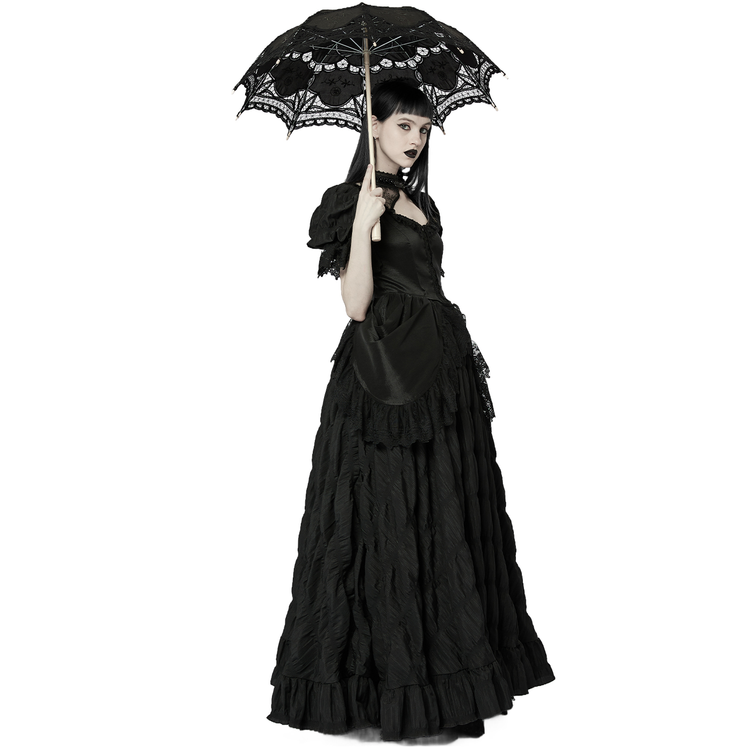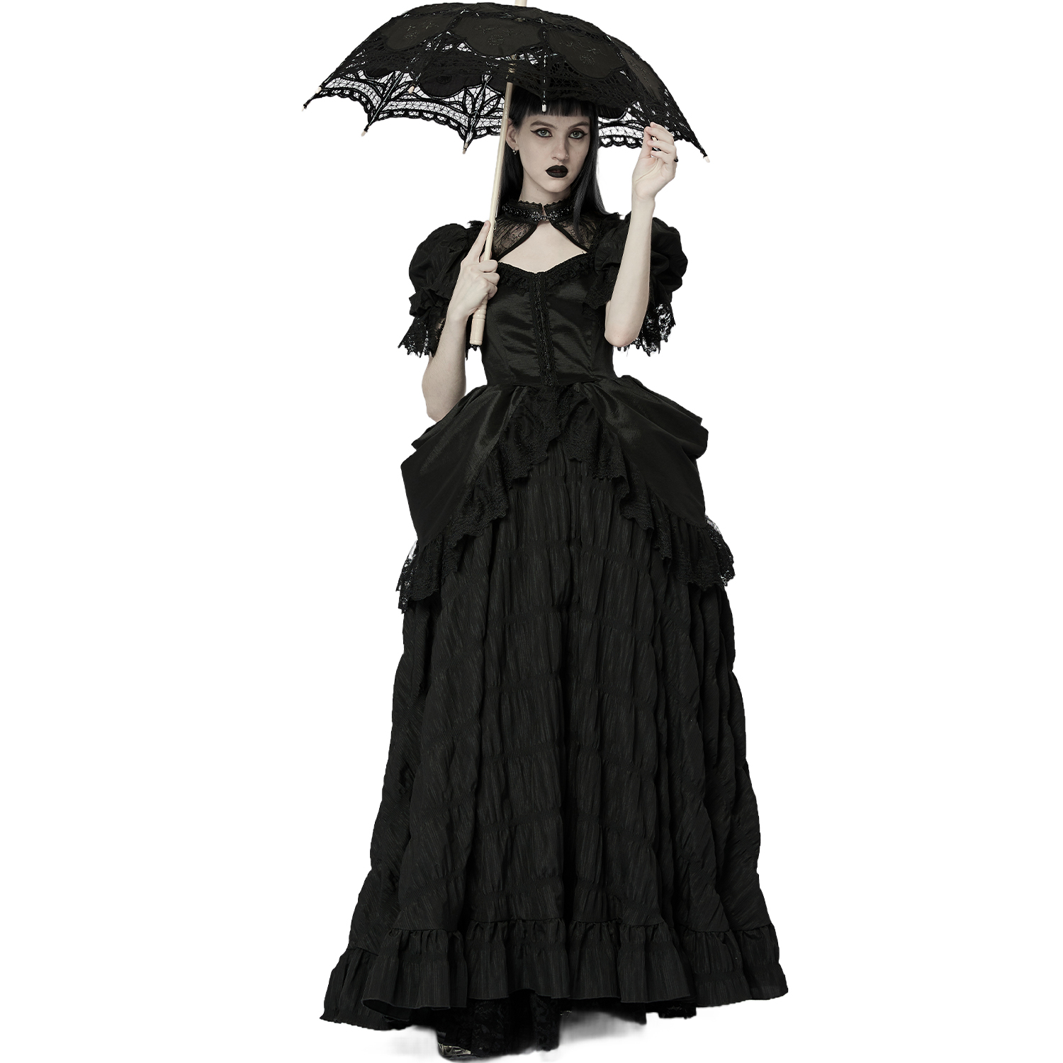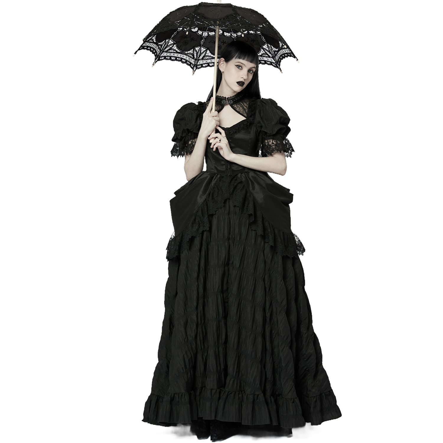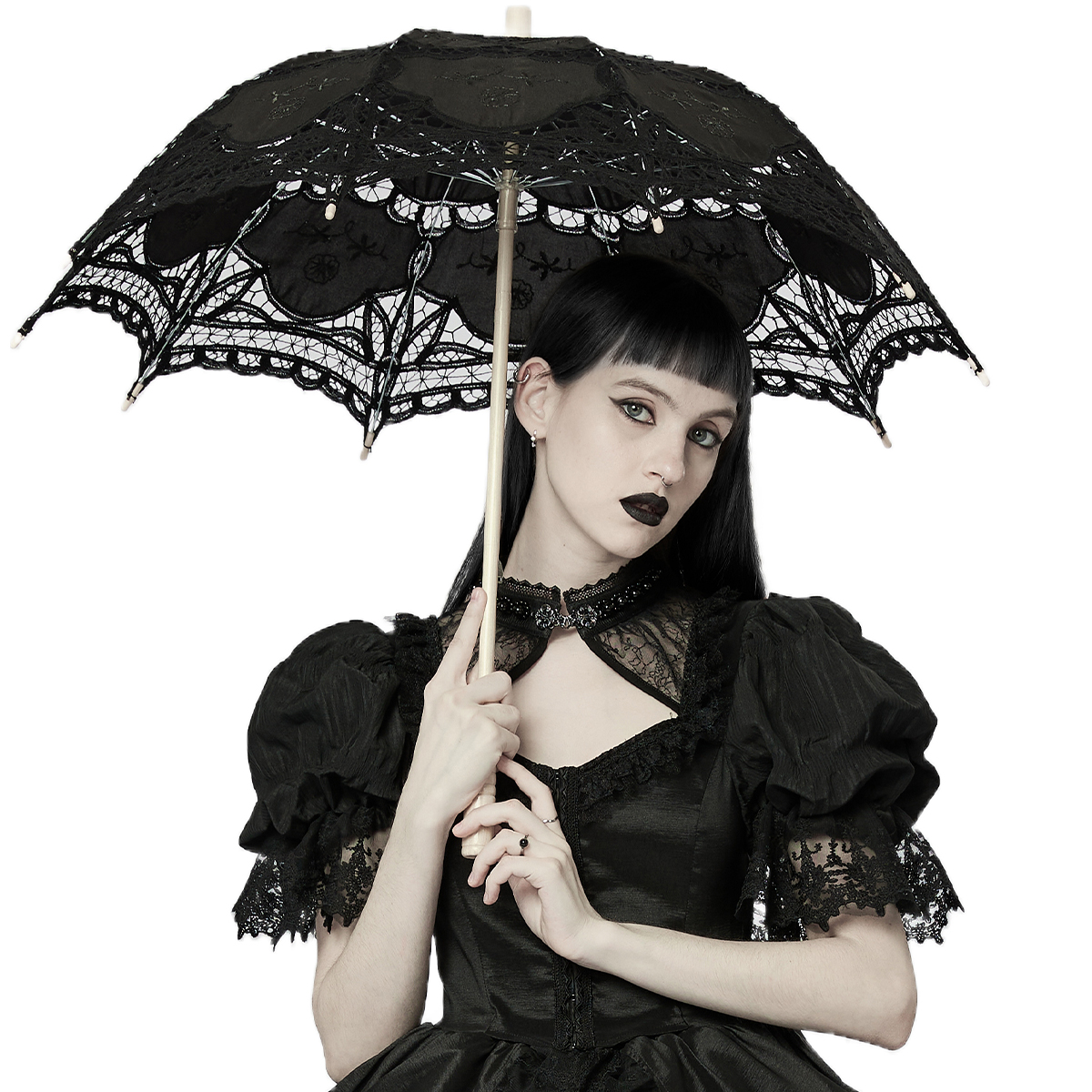 • En tissu plissé micro-élastique et dentelle noirs • Col haut décoré de perles noires • Manches bouffantes finies par une exquise dentelle noire • Fermoir délicats pour un port facile •...