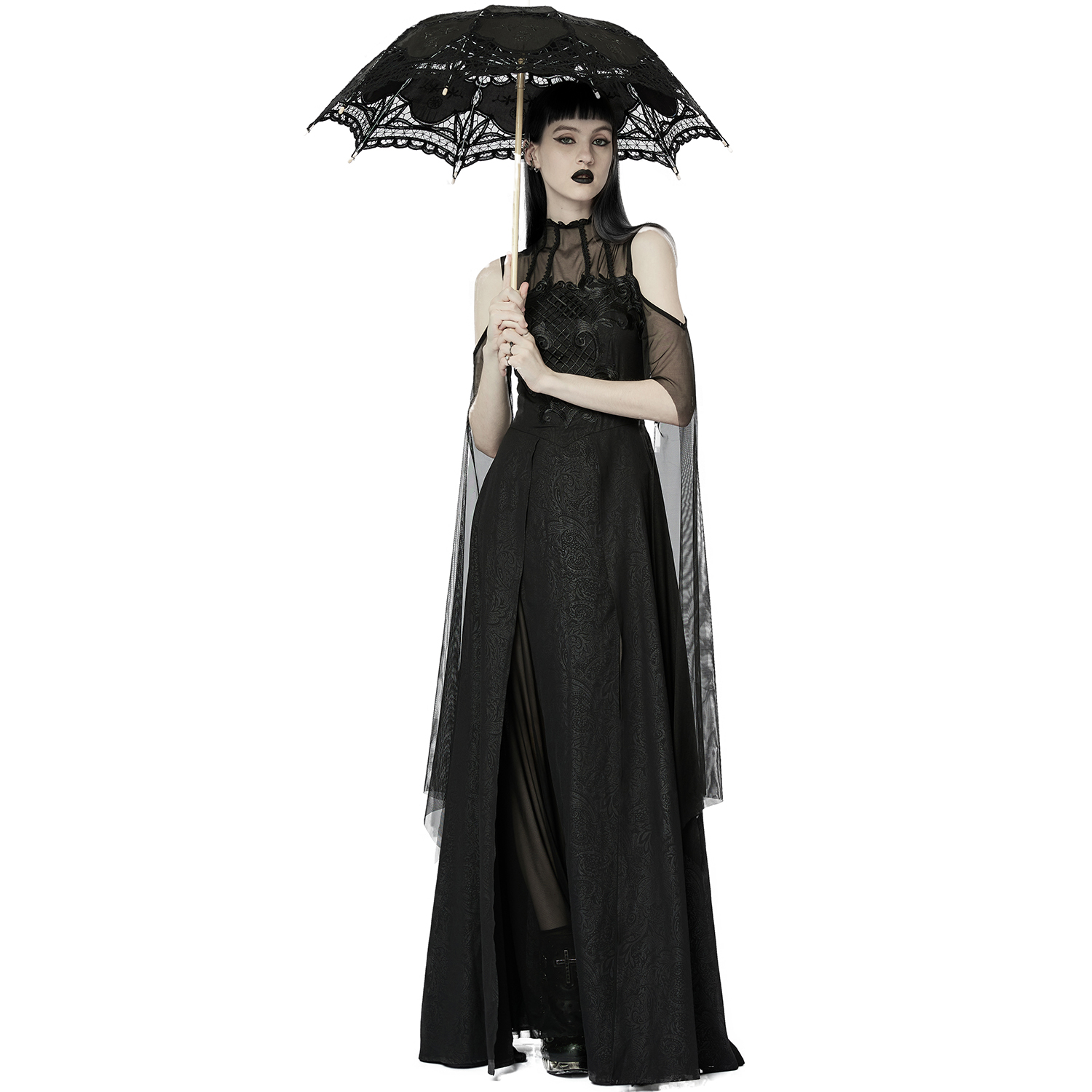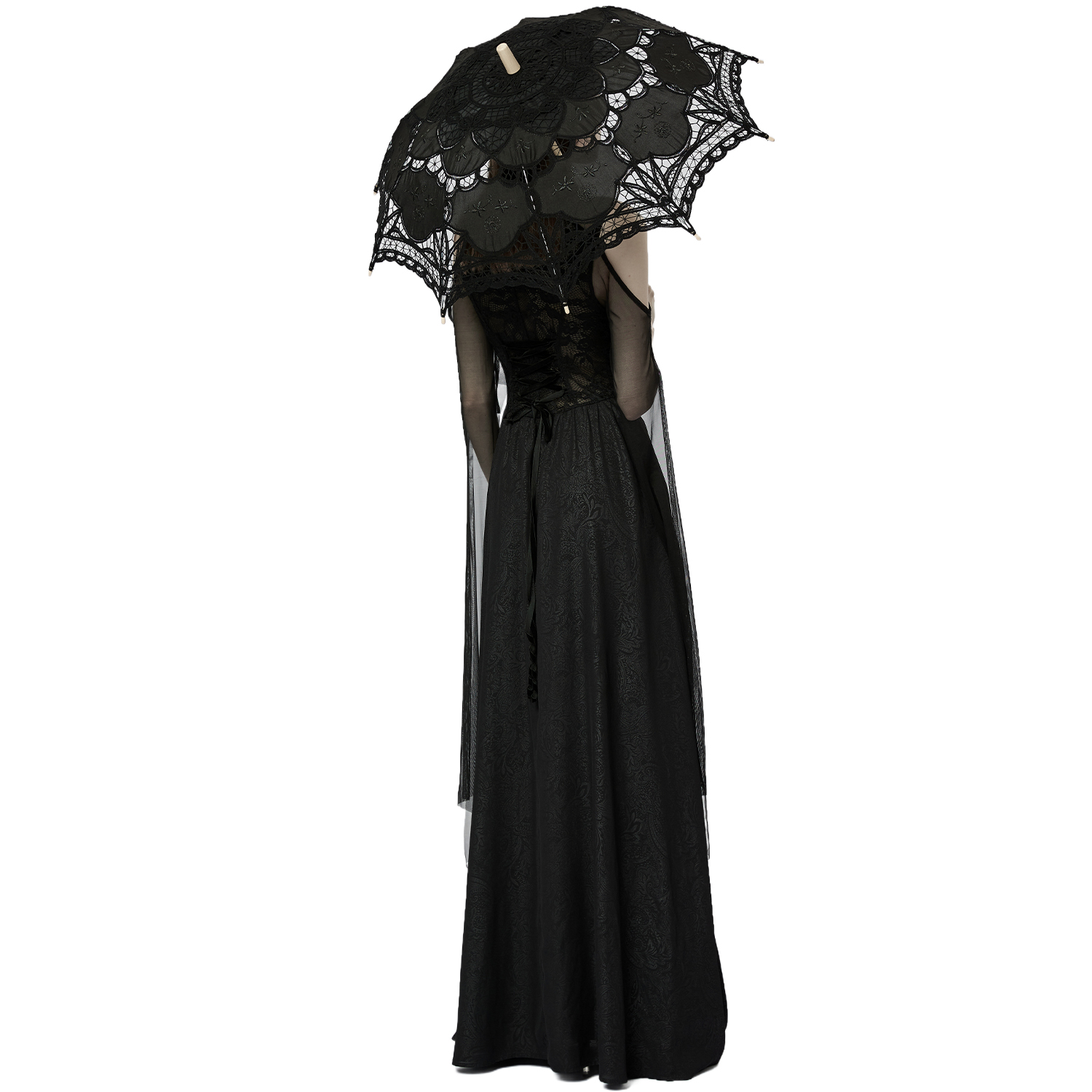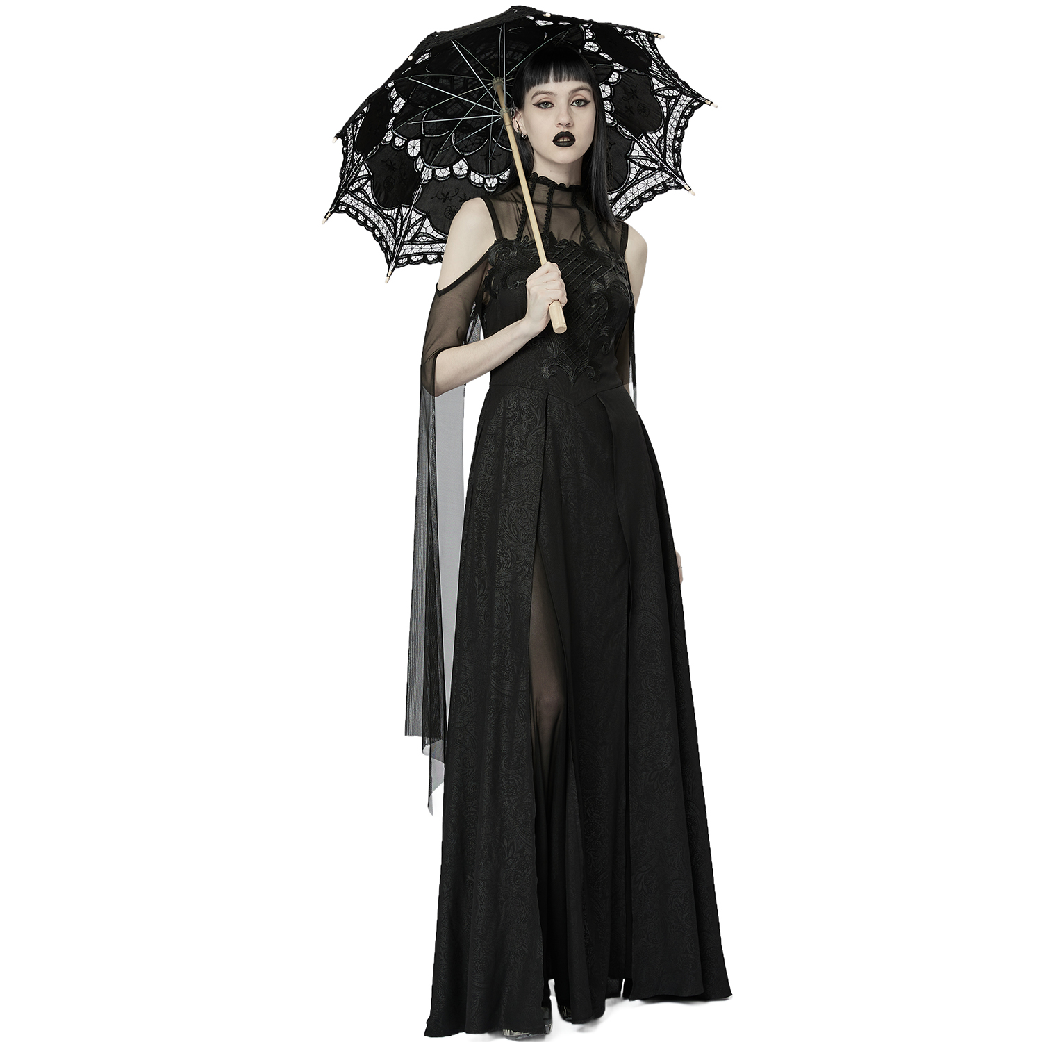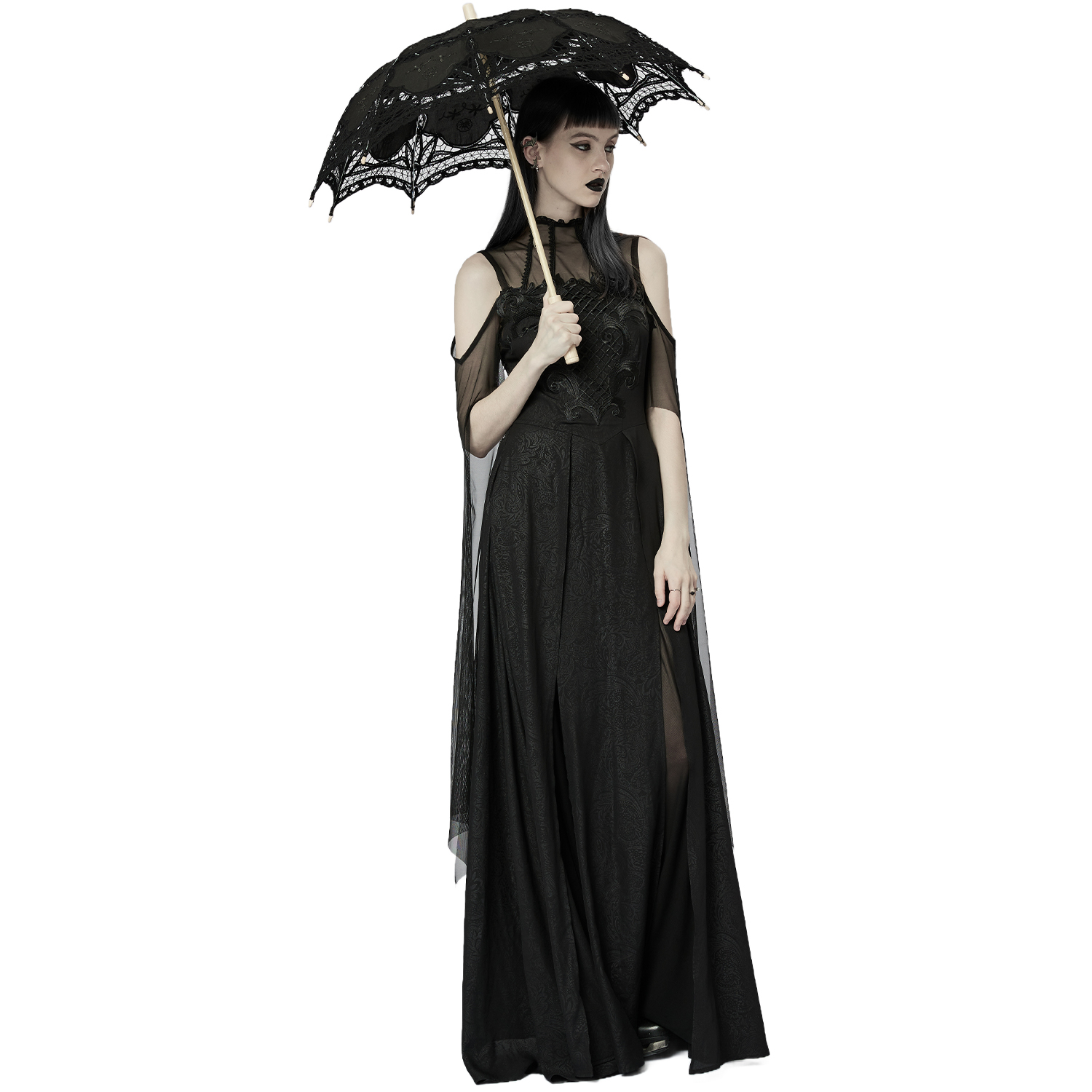 • En mousseline imprimée et de dentelle noires • Col montant et épaules dénudées • Manches trompette irrégulières • Longue jupe trapèze fendue • Décoration délicate et symétrique sur la poitrine...