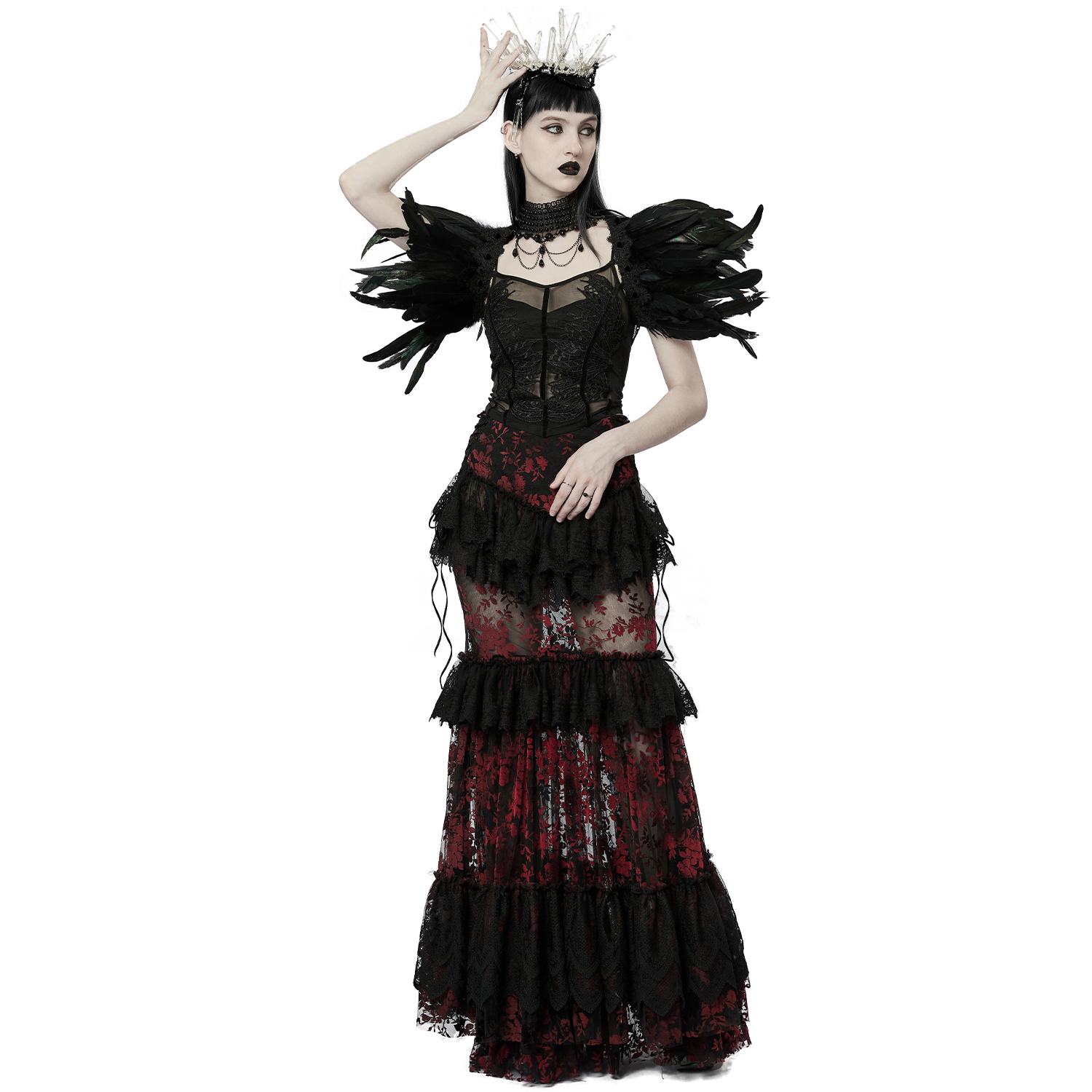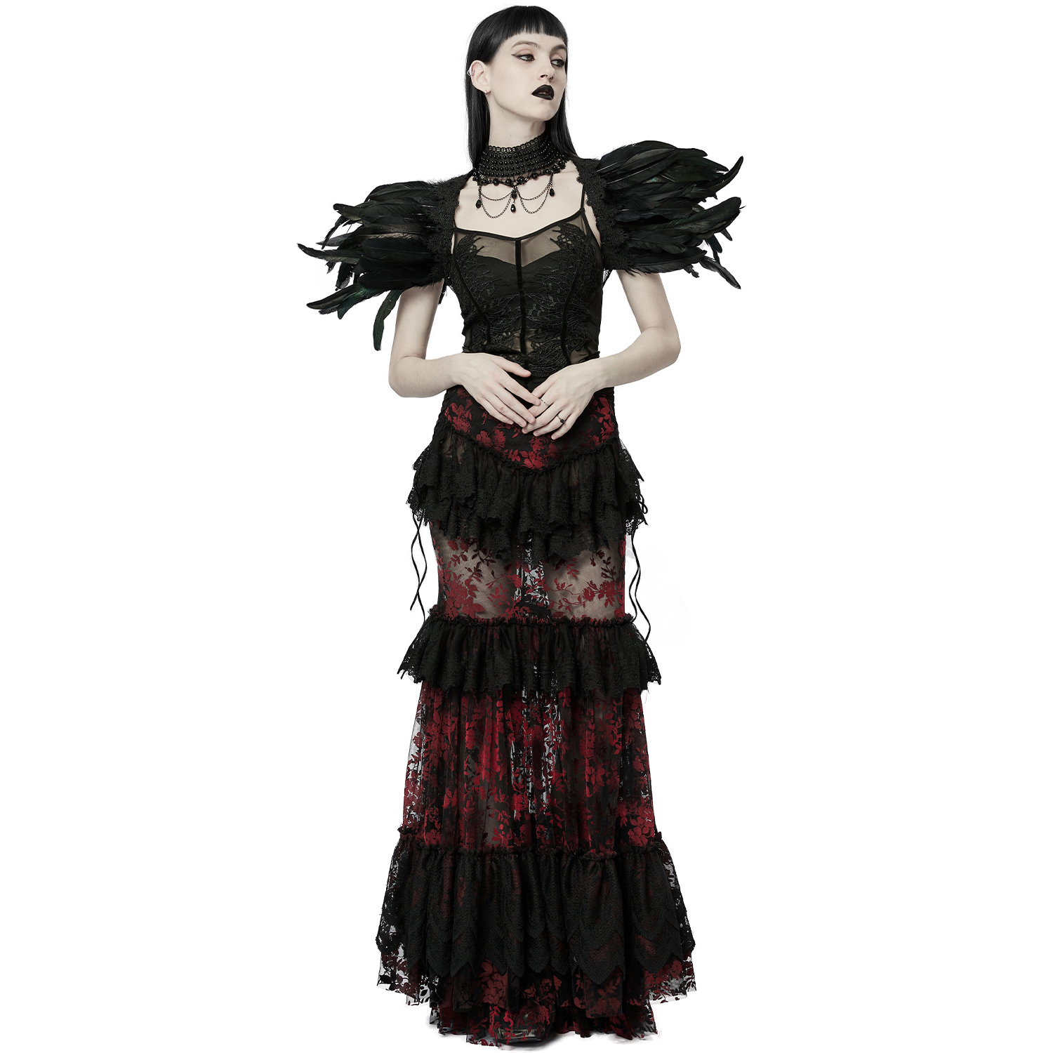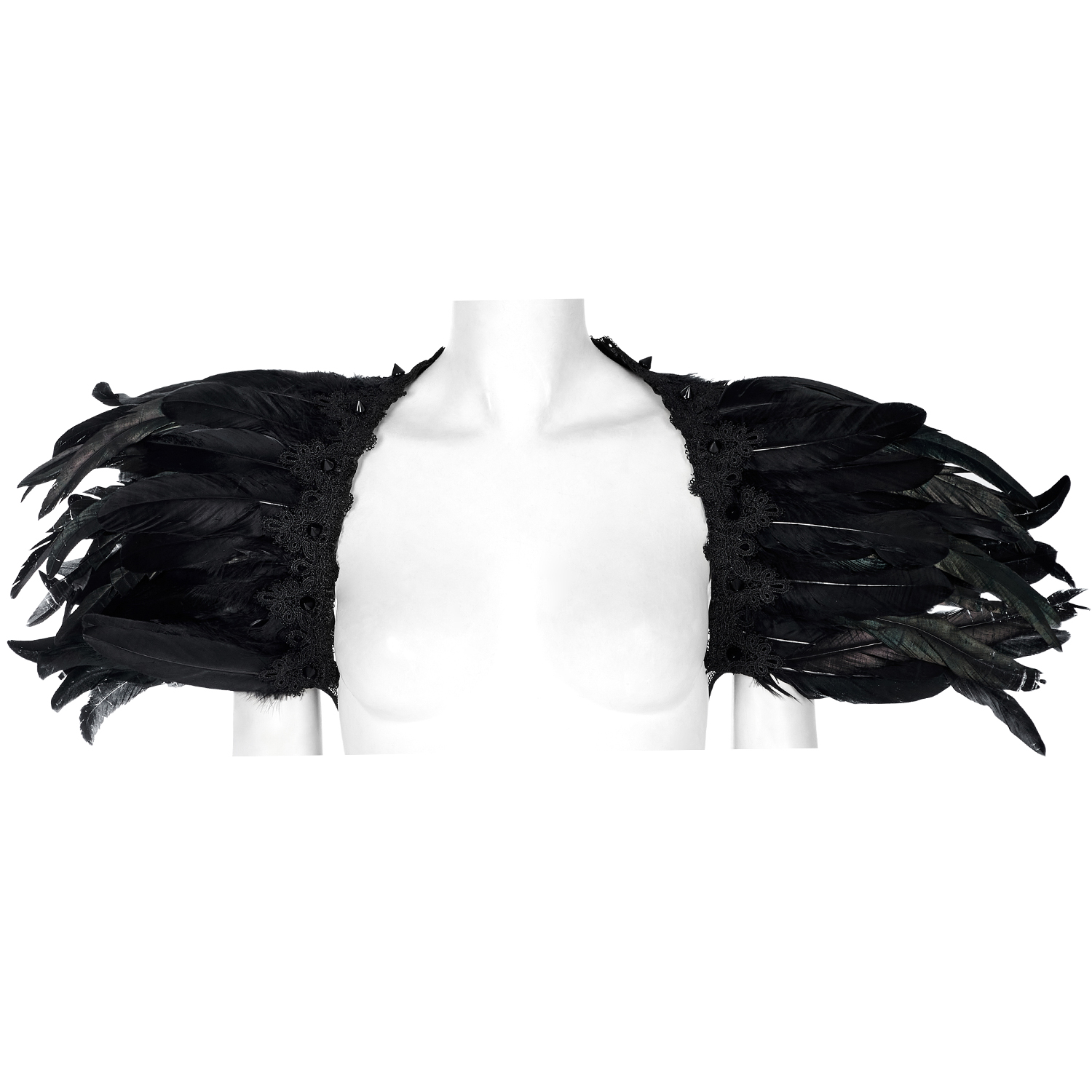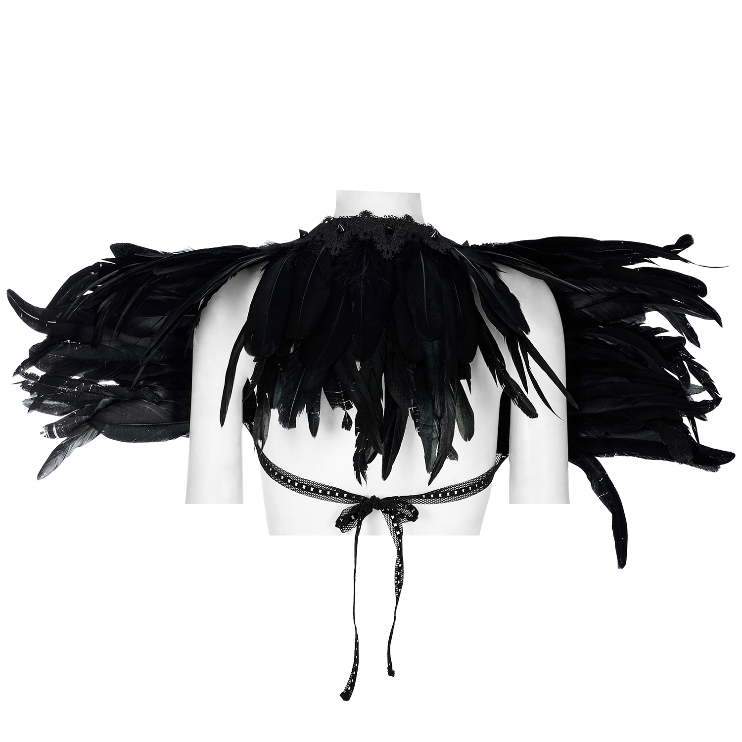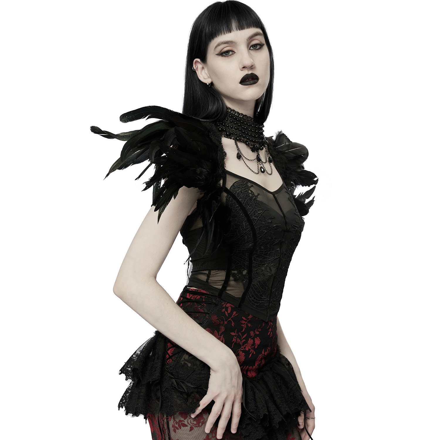 • Choker en exquise dentelle noire • Épaulettes en dentelle et plumes noires • Grandes roses 3D sur les épaules • Perles noires sur chaînes rassemblant les épaulettes au choker • Fines chaînes avec...